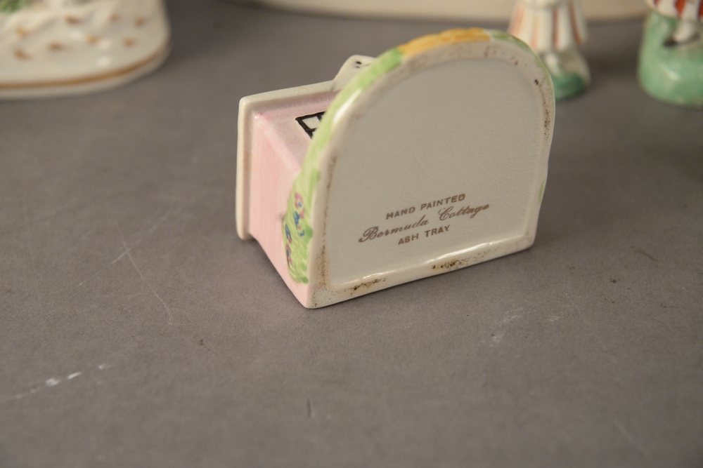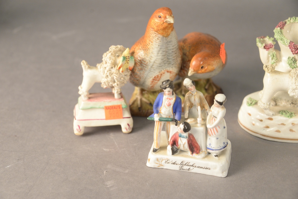 Group of Small Porcelain Figures, to include four Staffordshire dogs; two small houses; four figural groups; along with two English porcelain pigeons, tallest height 7 3/4 inches.