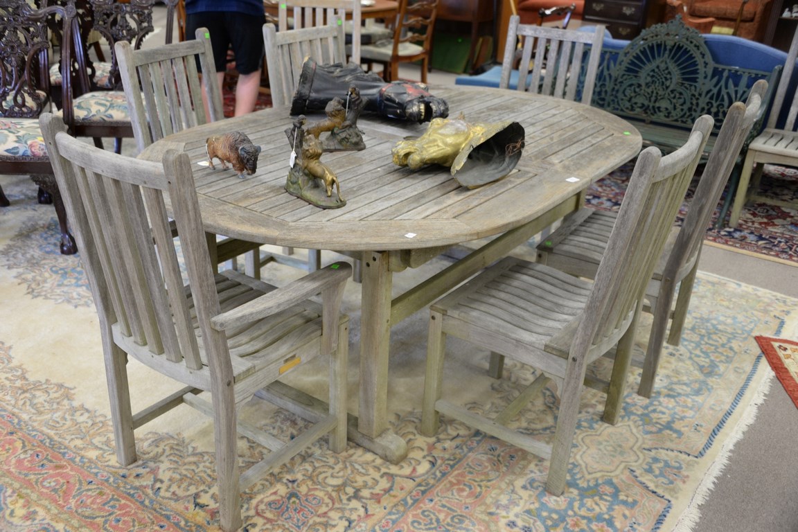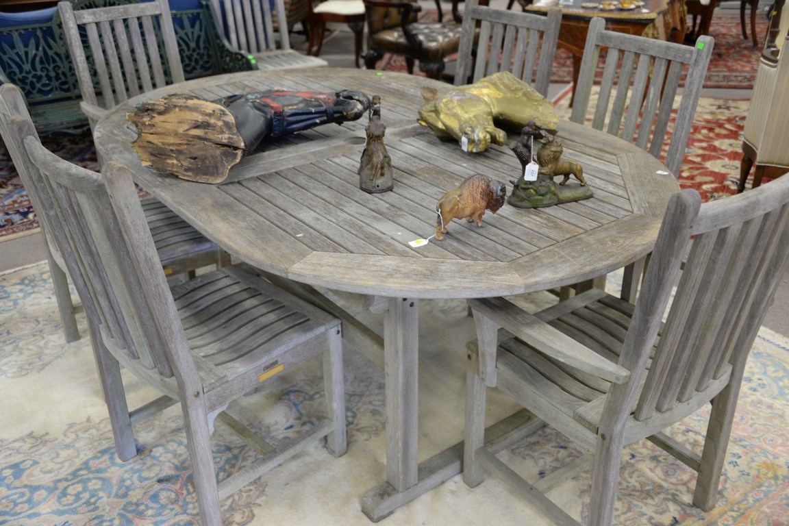 Lot 272: Kingsley Bate 9 piece teak outdoor set, oval table and eight chairs. ht. 29 in. wd. 50 in. lg. 79 in. with one 22 leave, opens t…