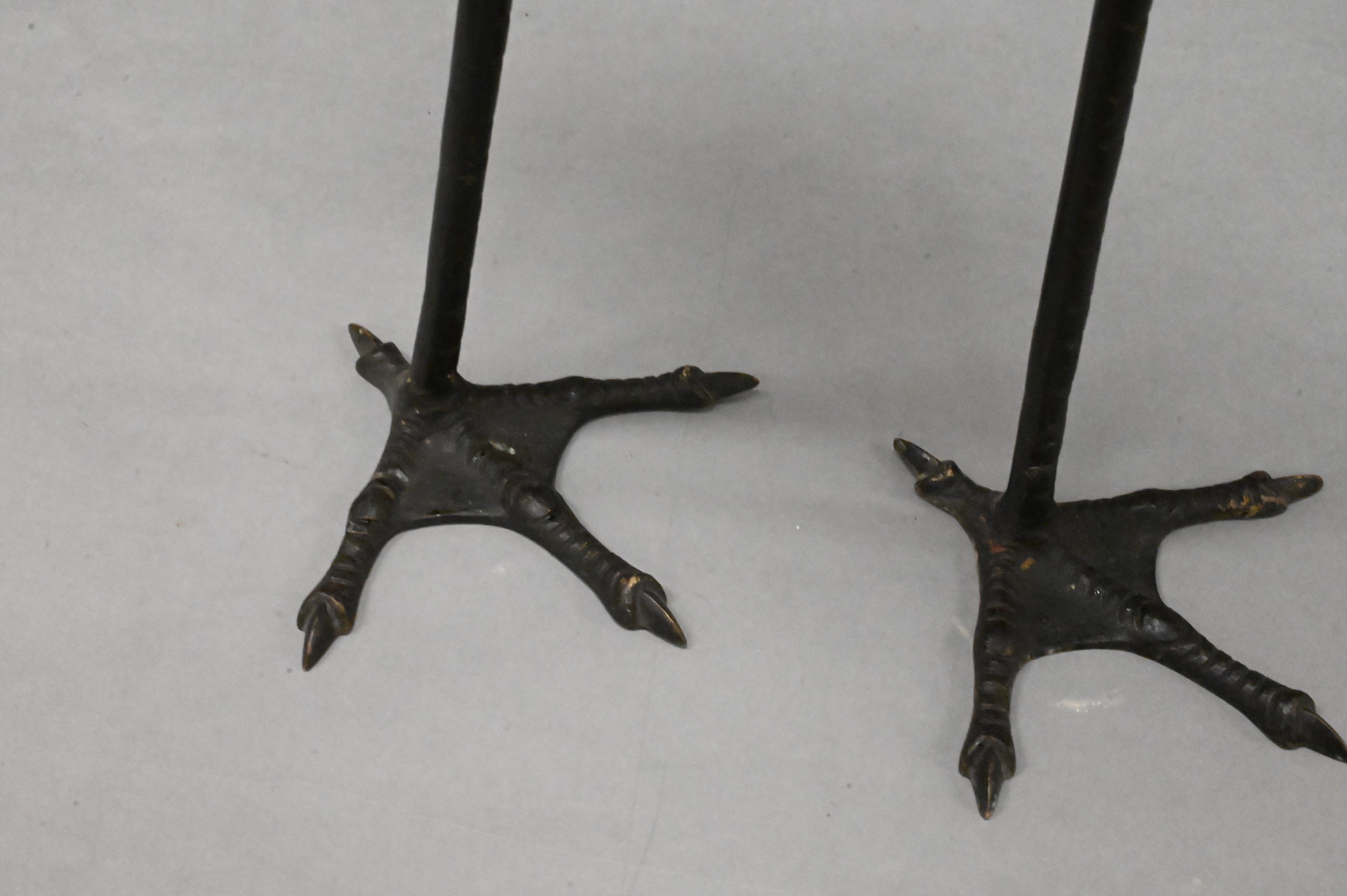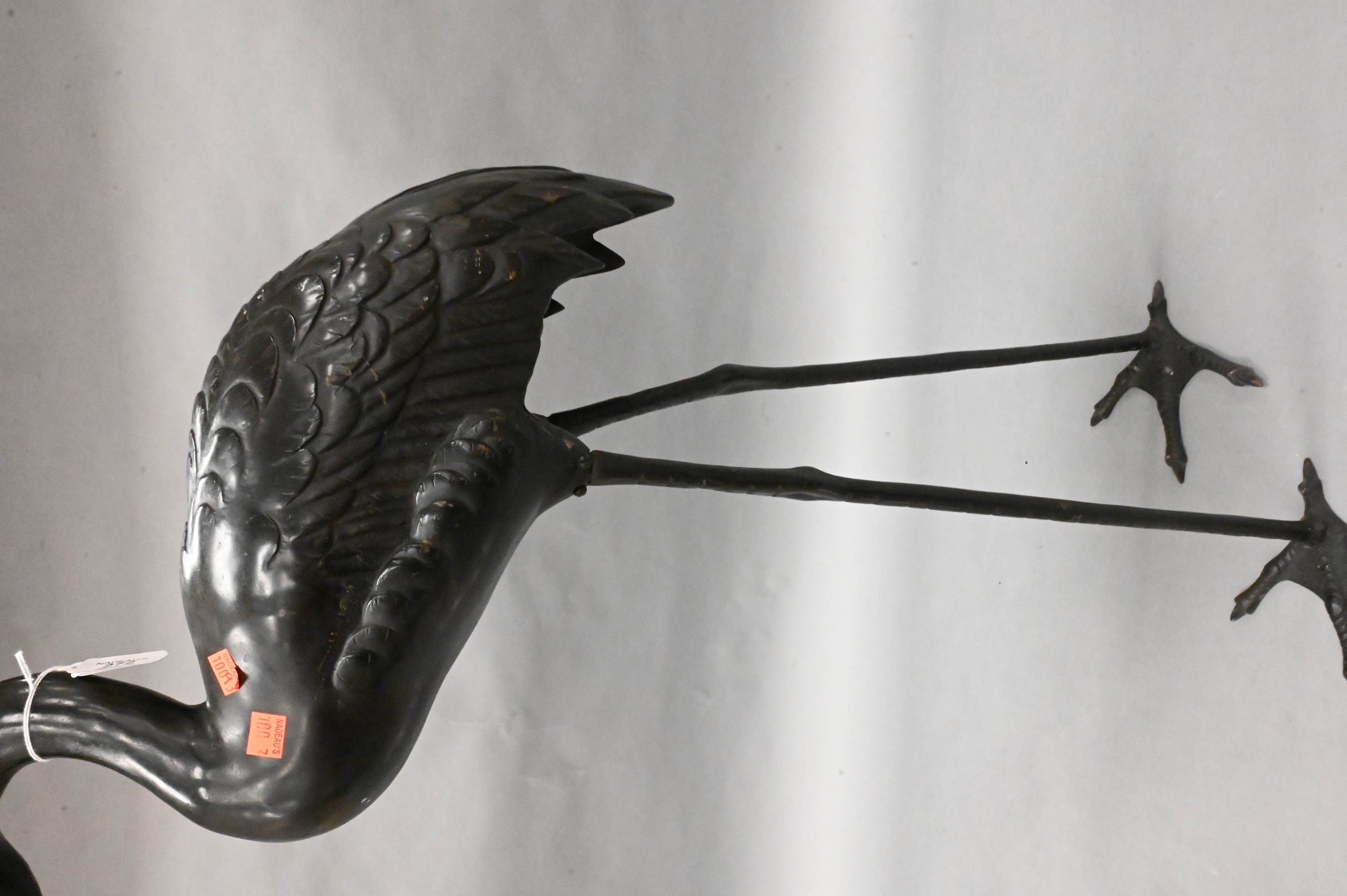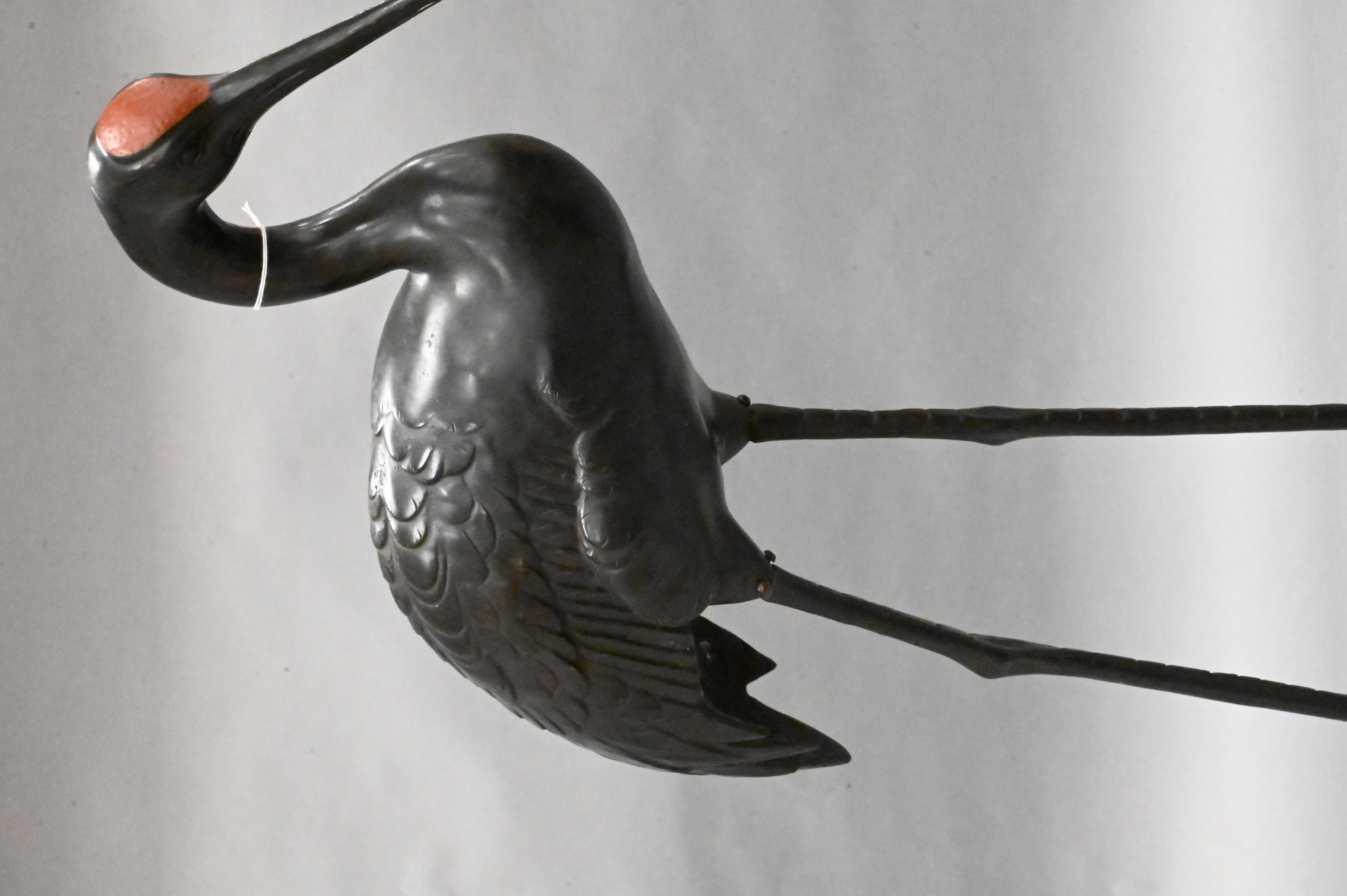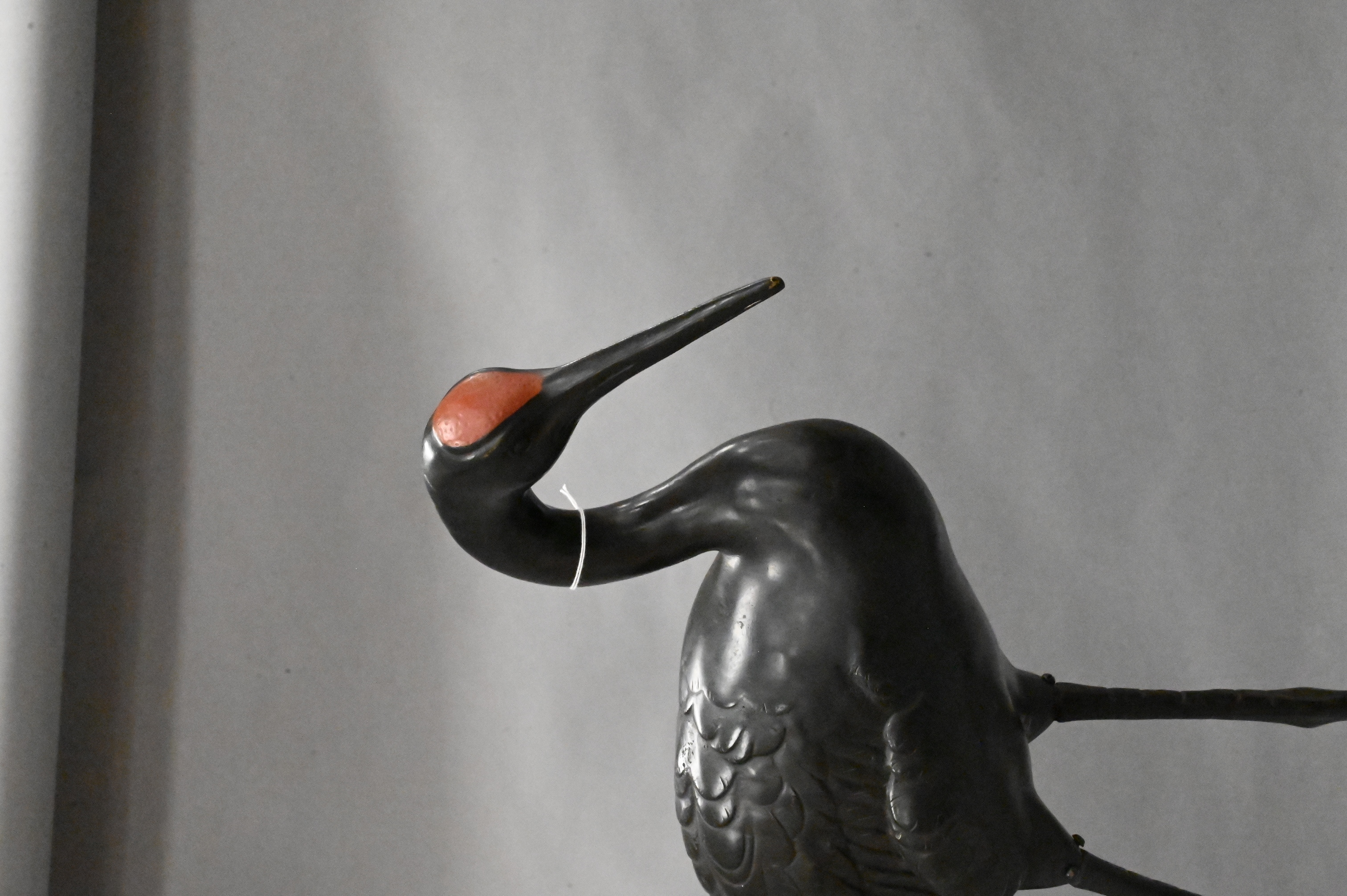 cast bronze Manchurian Crane having red painted crest with elongated neck over tall thin legs