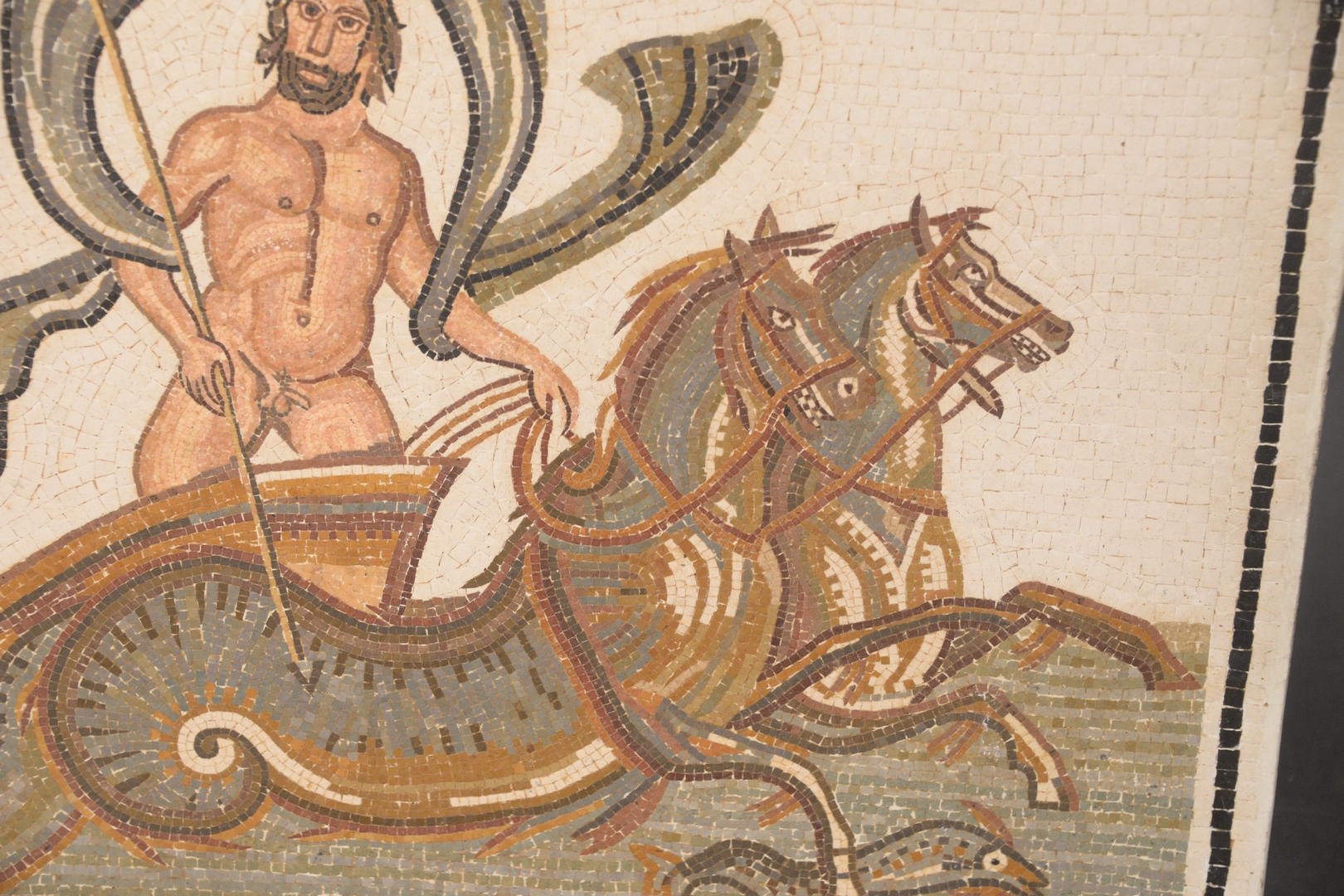 Mosaic Stone Inlaid Panel, depicting man in chariot, 18 1/2 x 22.