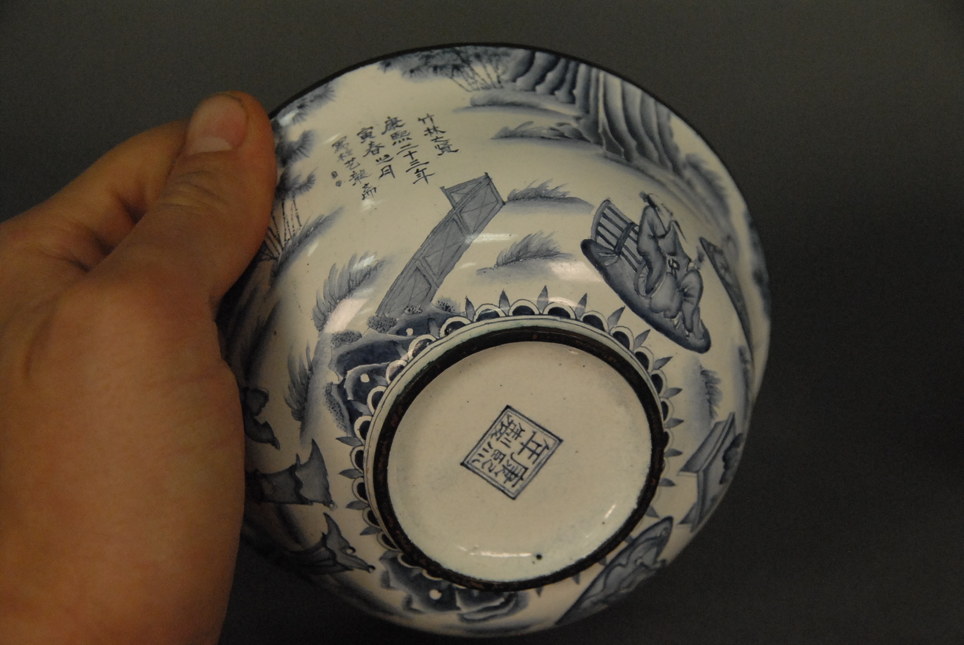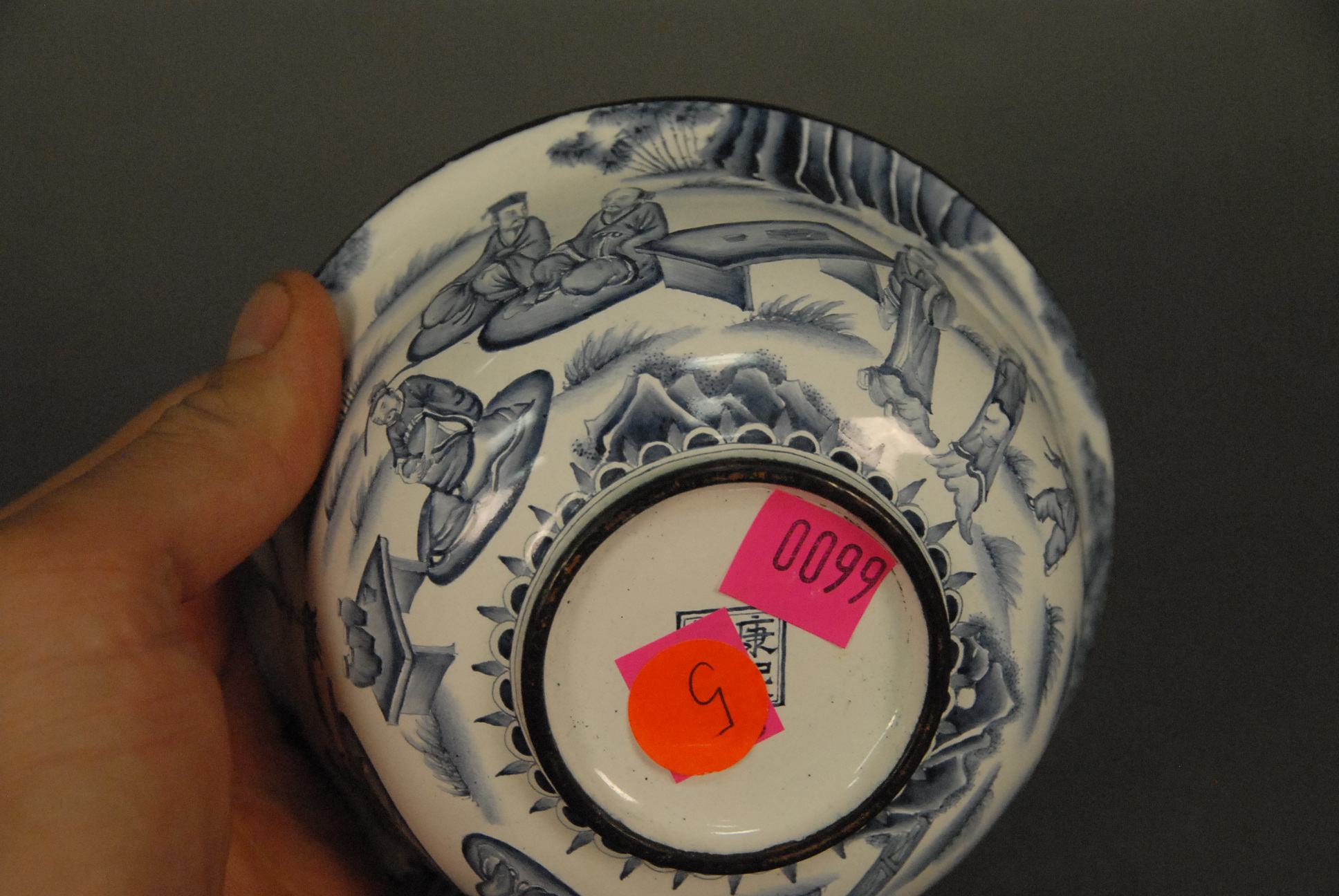 Lot 272: Pair of blue and white enameled bowls with painted figures in landscape, ht. 2 1/4in. dia. 5 1/4in.
