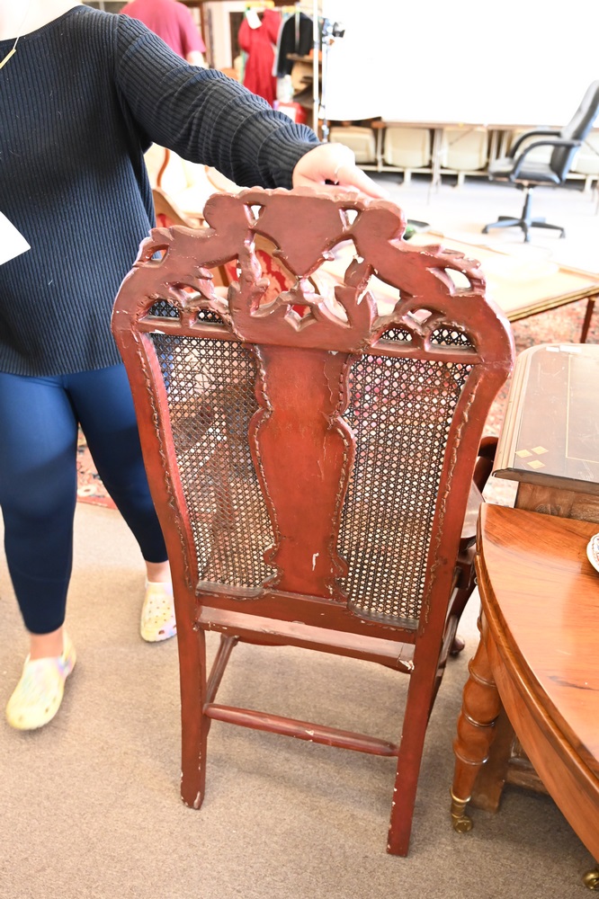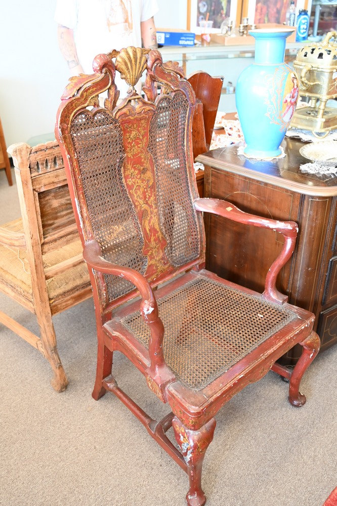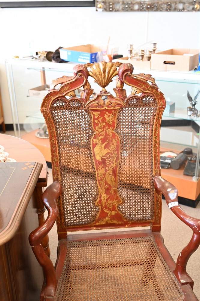 Lot 272: Pair of Continental Style Armchairs, chinoiserie decorated having caned back and seat, height 47 1/2 inches, seat height 16 1/2 inches.