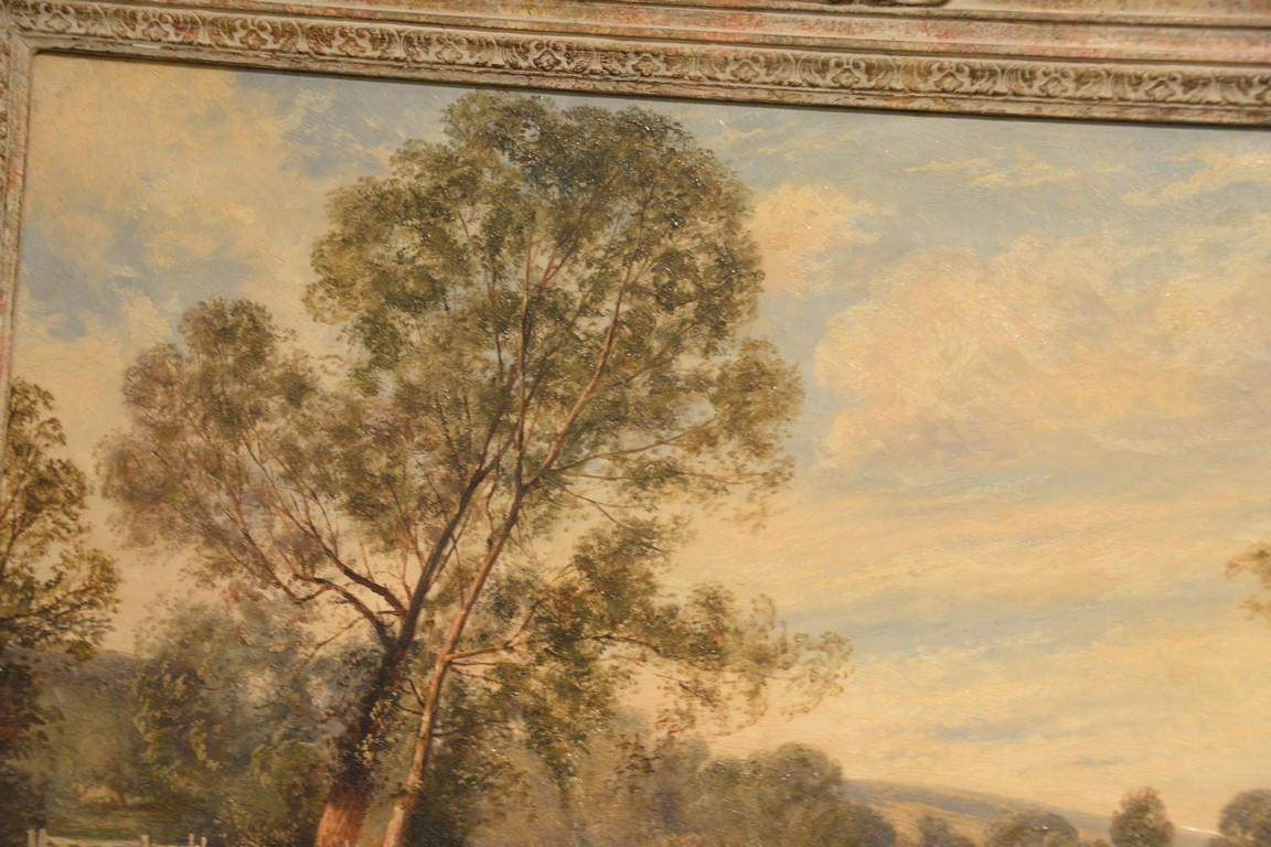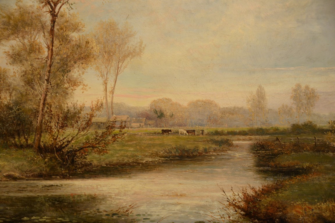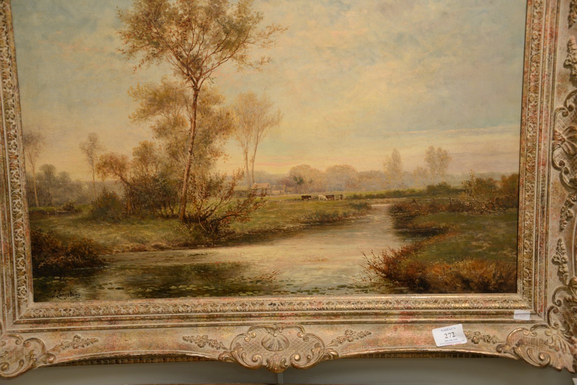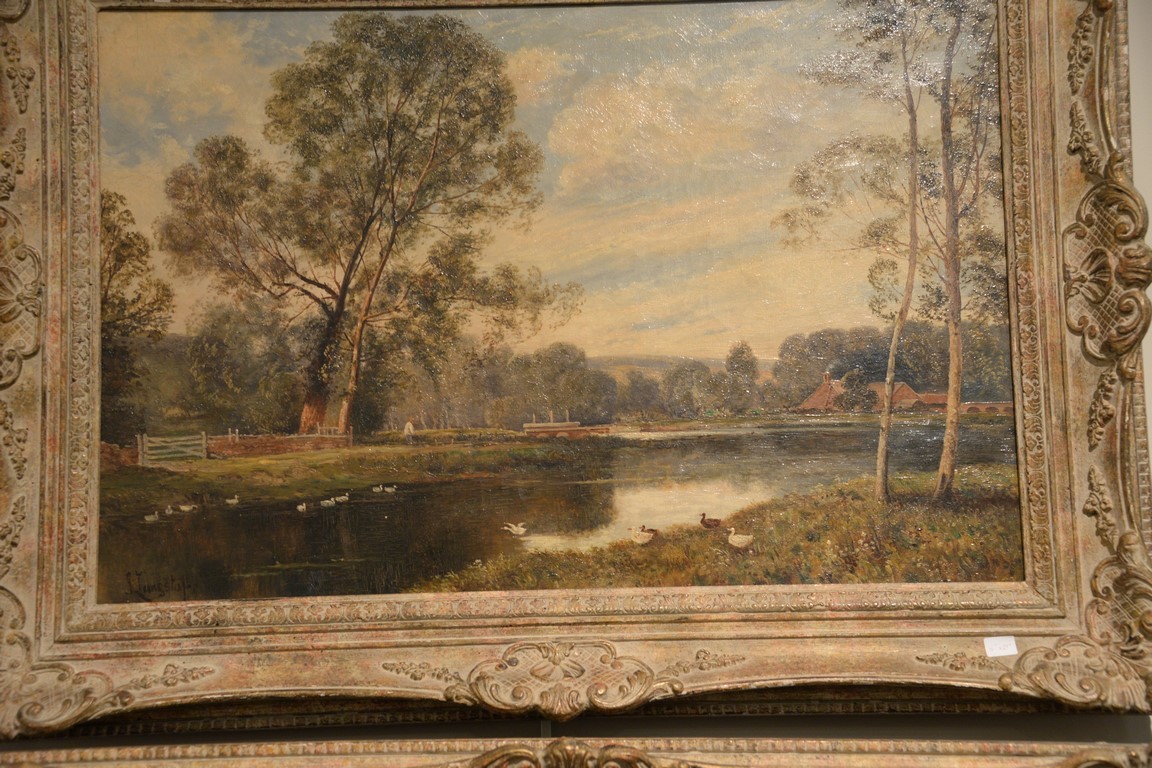 Lot 272: Pair of John Langstaffe 1849-1912, oil on canvas farm landscapes, Dusk in the Pond and October Glow, signed lower left: J. Langsta…