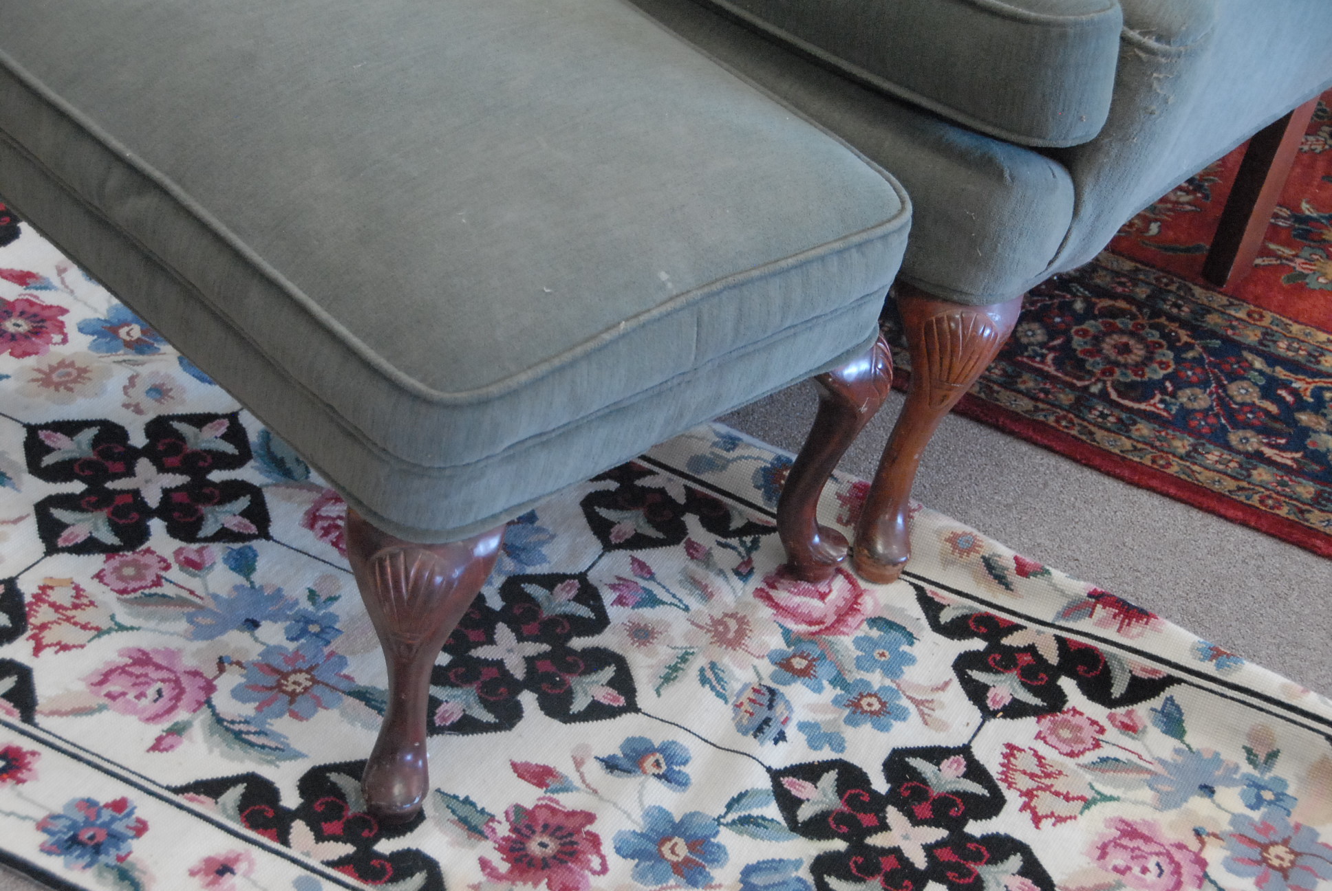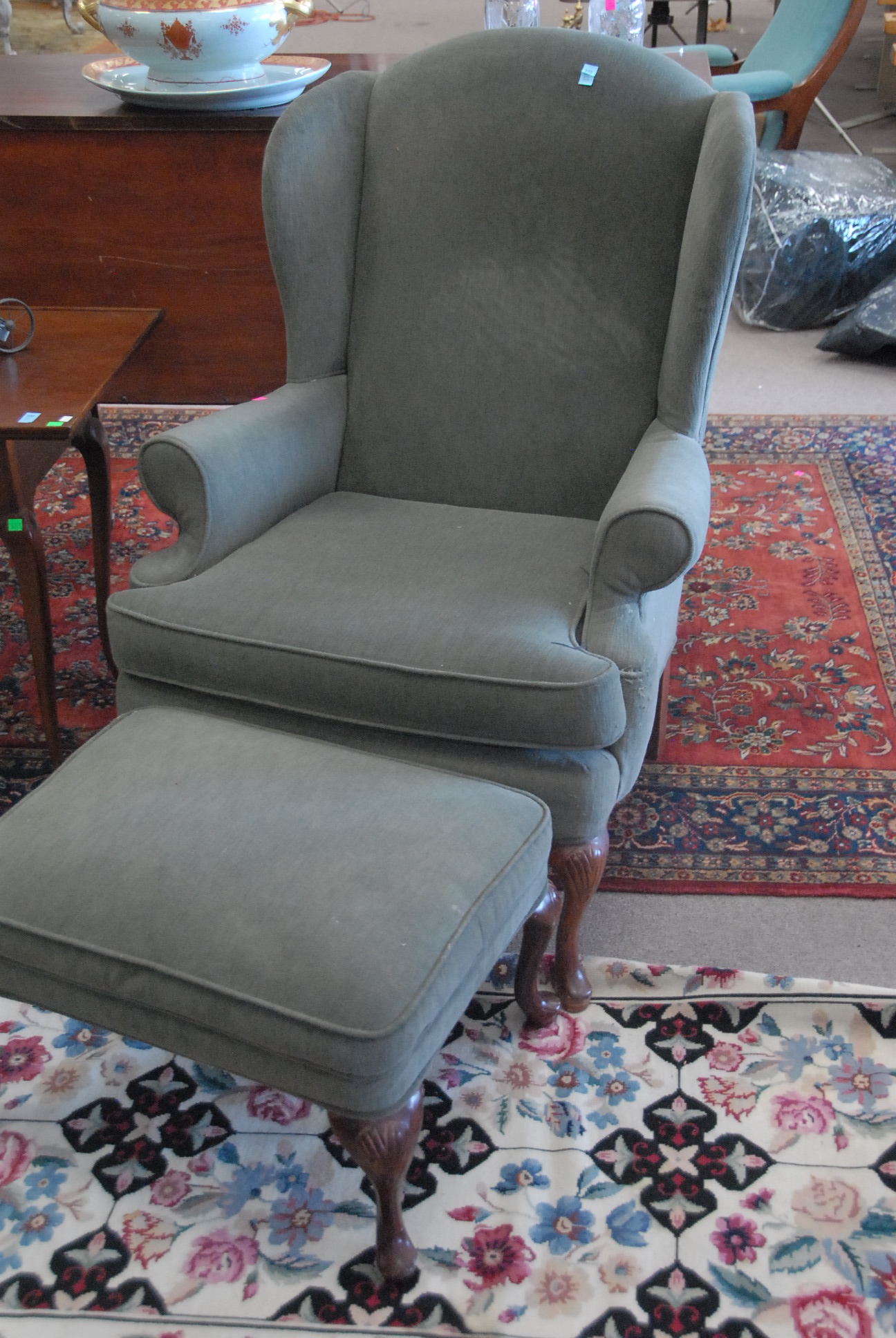 Queen Anne style upholstered wing chair and ottoman.