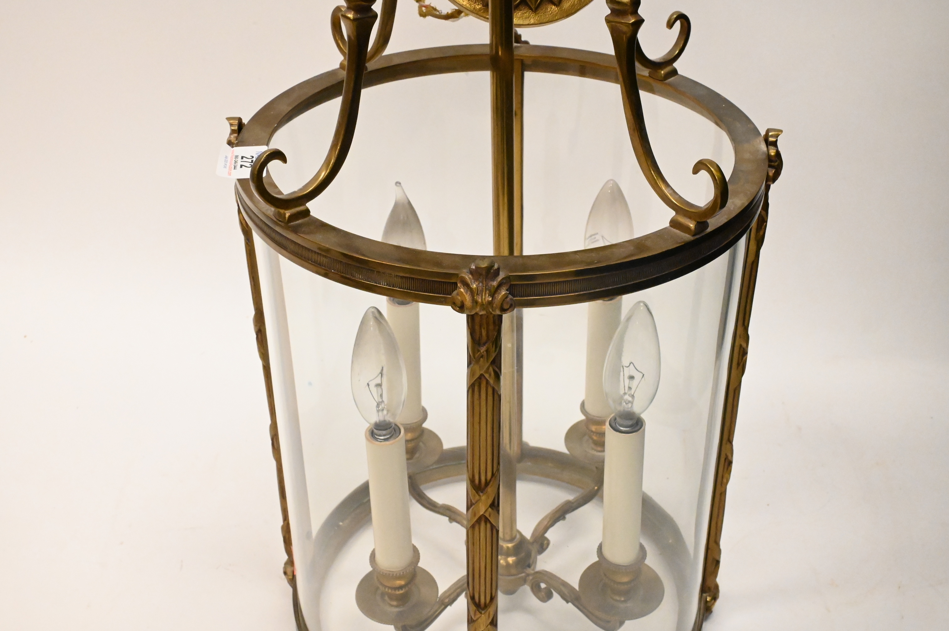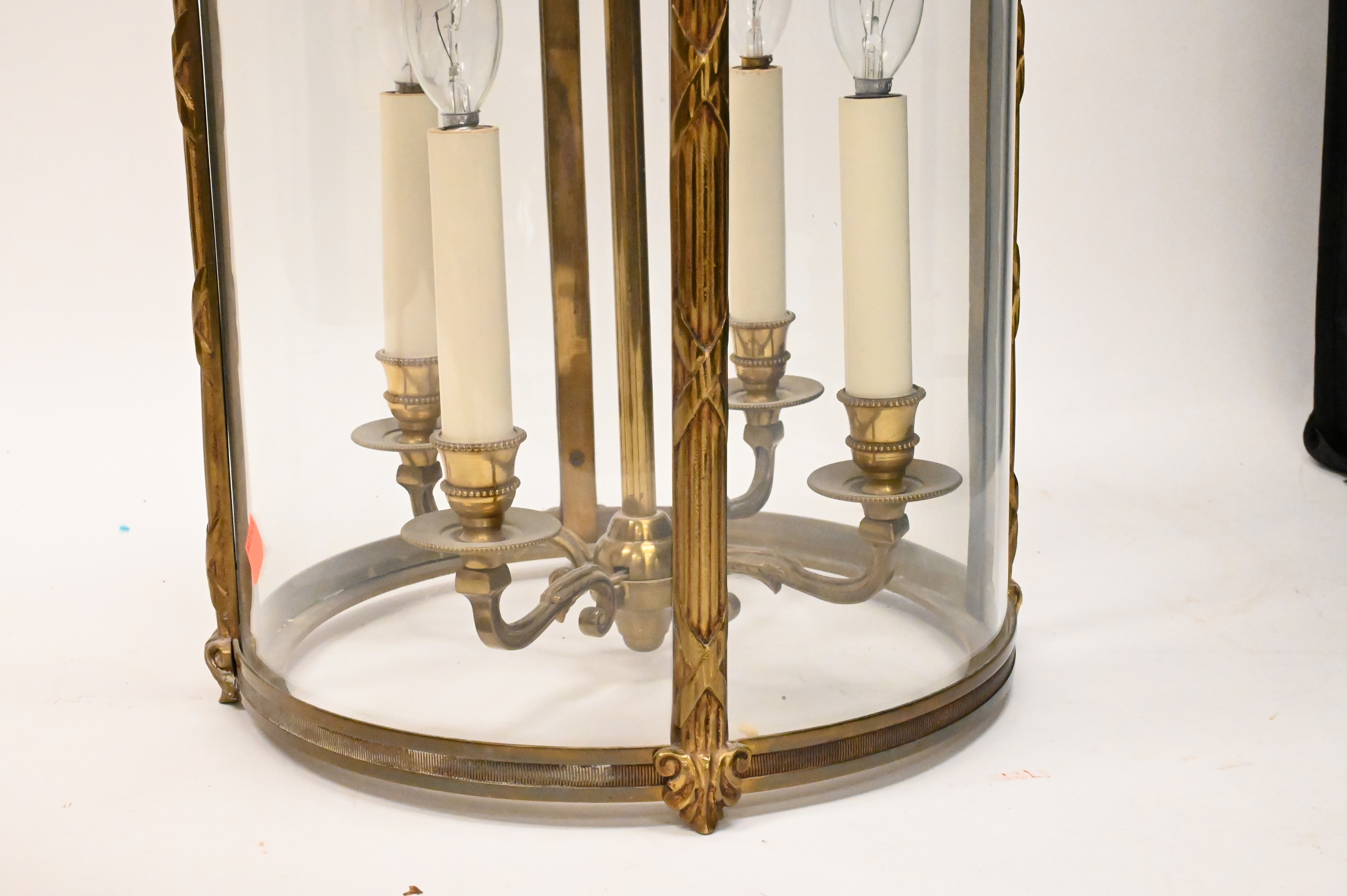 Regency Style Brass Hall Hanging Lantern or Light, having curved rounded glass with four lights, height 22 1/2 inches, diameter 11 1/2 inches.