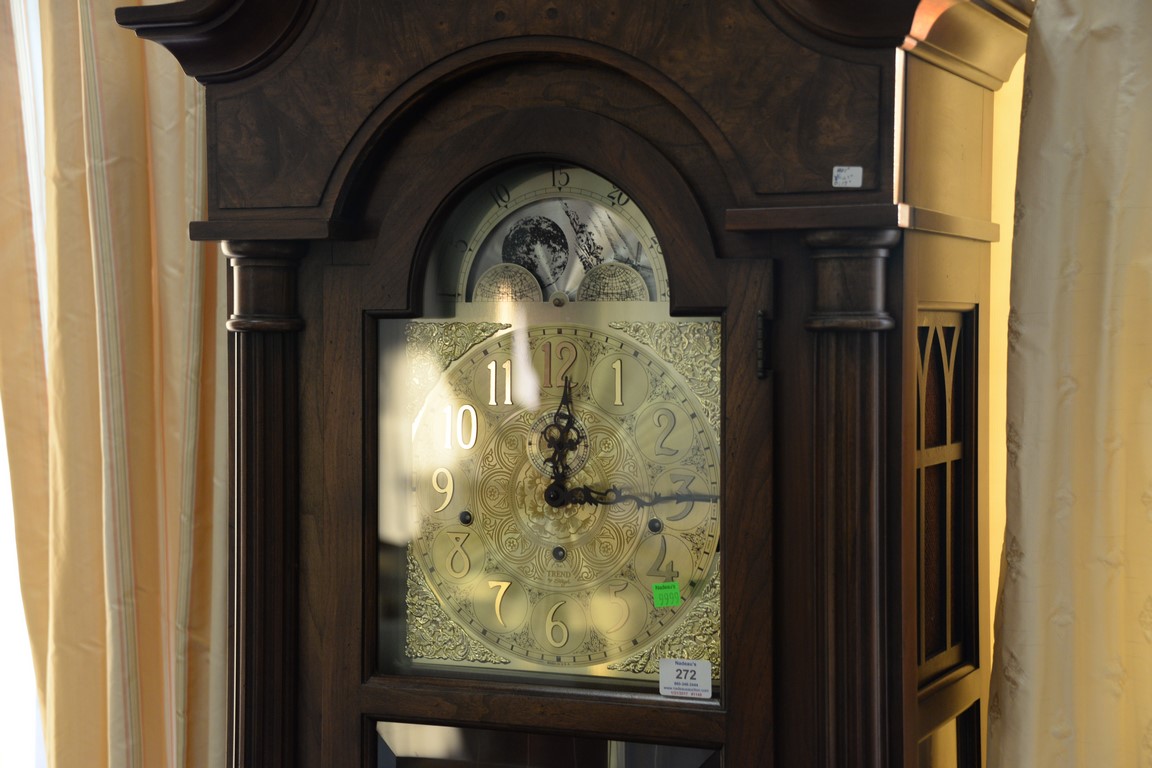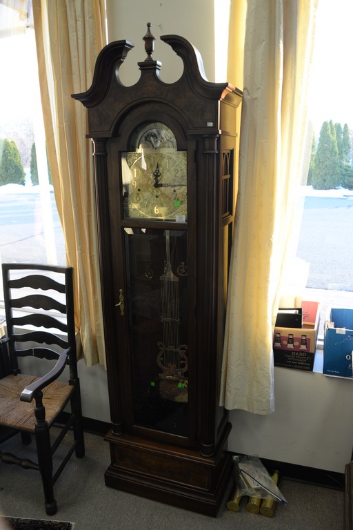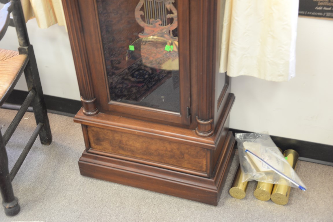 Sligh tall clock with three brass weights and large brass pendulum. ht. 81in., wd. 24in.