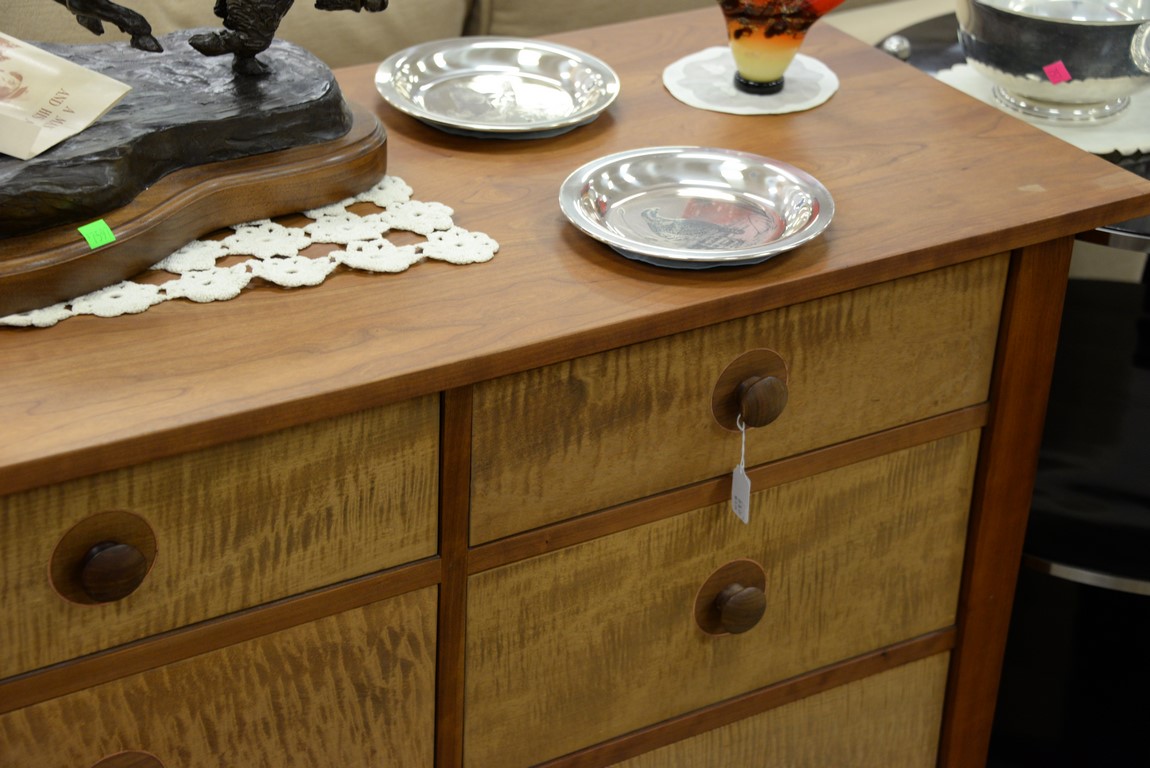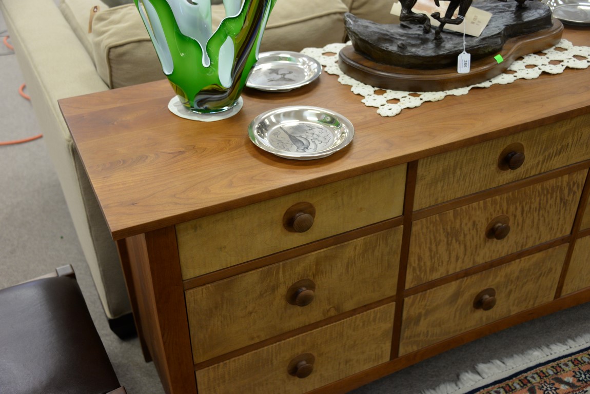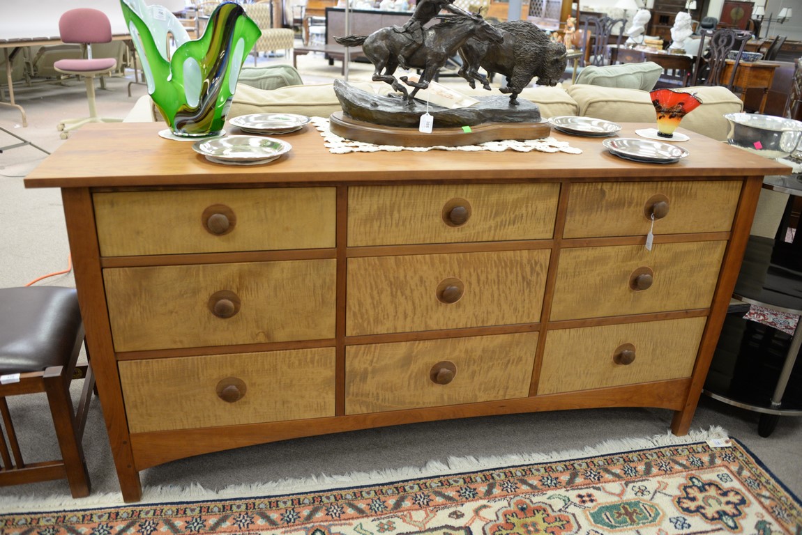 Lot 272: Stickley 21st Century cherry triple chest with figured maple drawer fronts in soft finish retail 5,600. ht. 32 in. wd. 66 in. d…