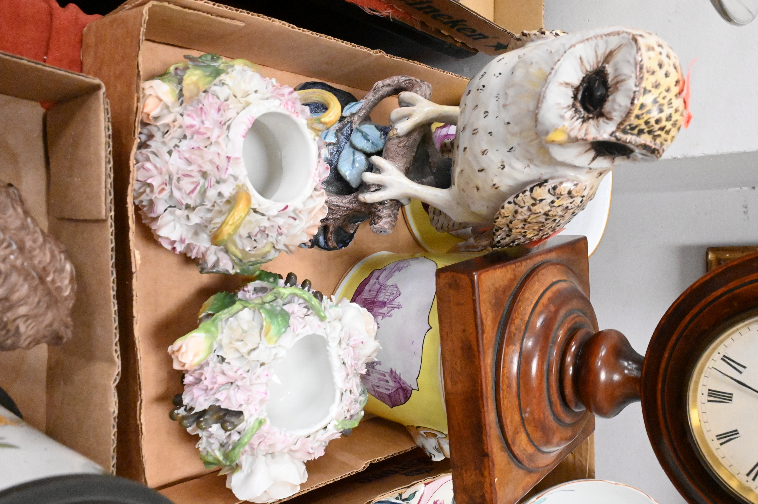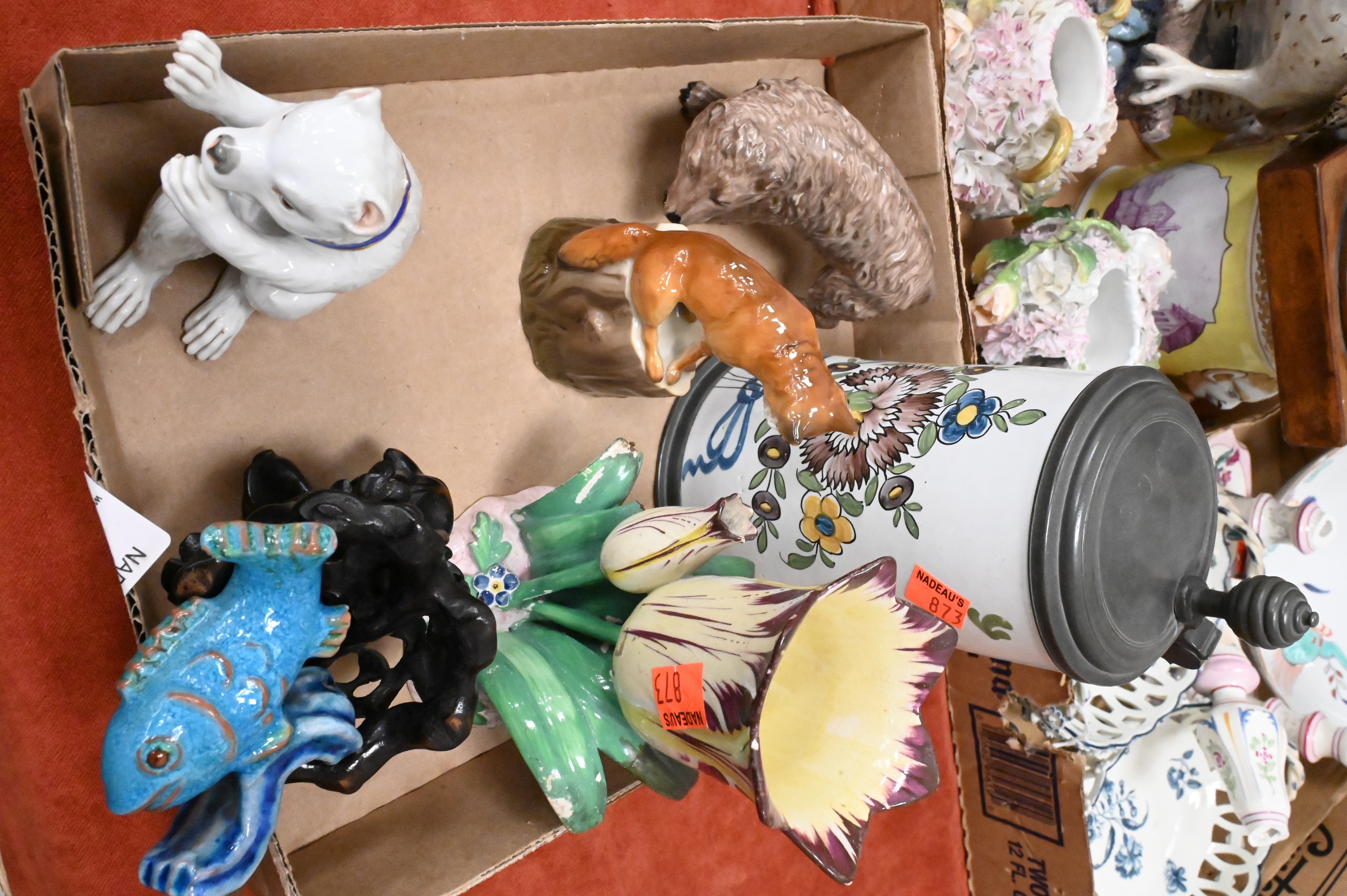 pair of early yellow ground Niderviller faience cachepots having figural mask handles, Staffordshire tulip, repairs throughout, Nymerbourg bear and fox, Meissen polar bear, pair of Dresden style flower baskets, ceramic owl, Delft stein