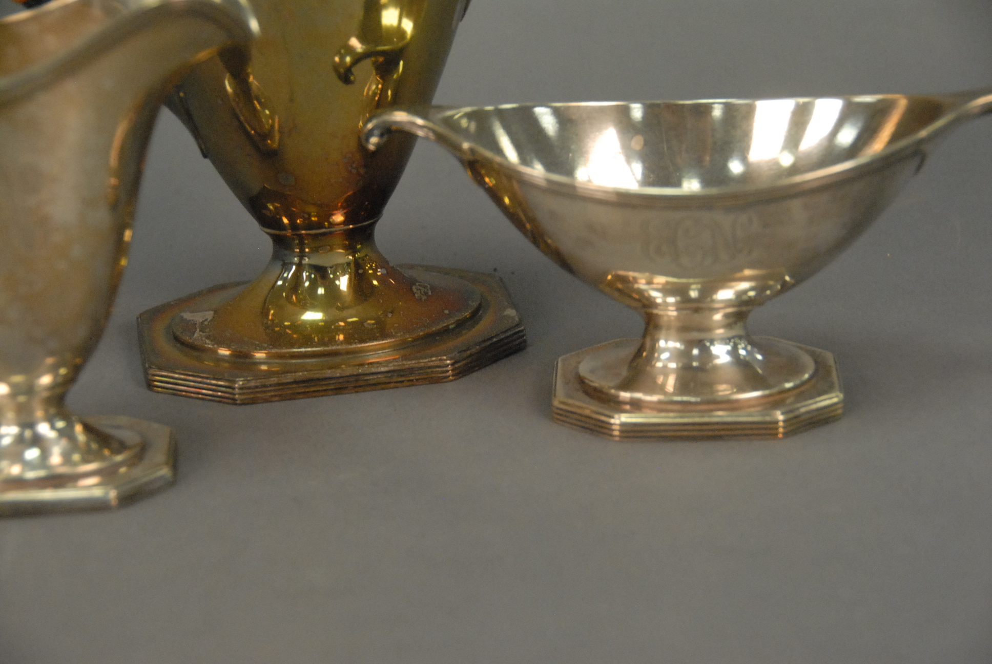 Lot 272: Three piece sterling tea set with coffee pot, creamer, and sugar by Gorham, monogramed. 28.5 t oz.