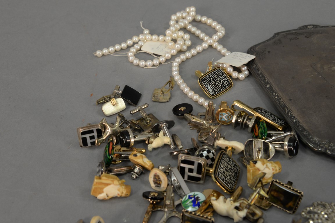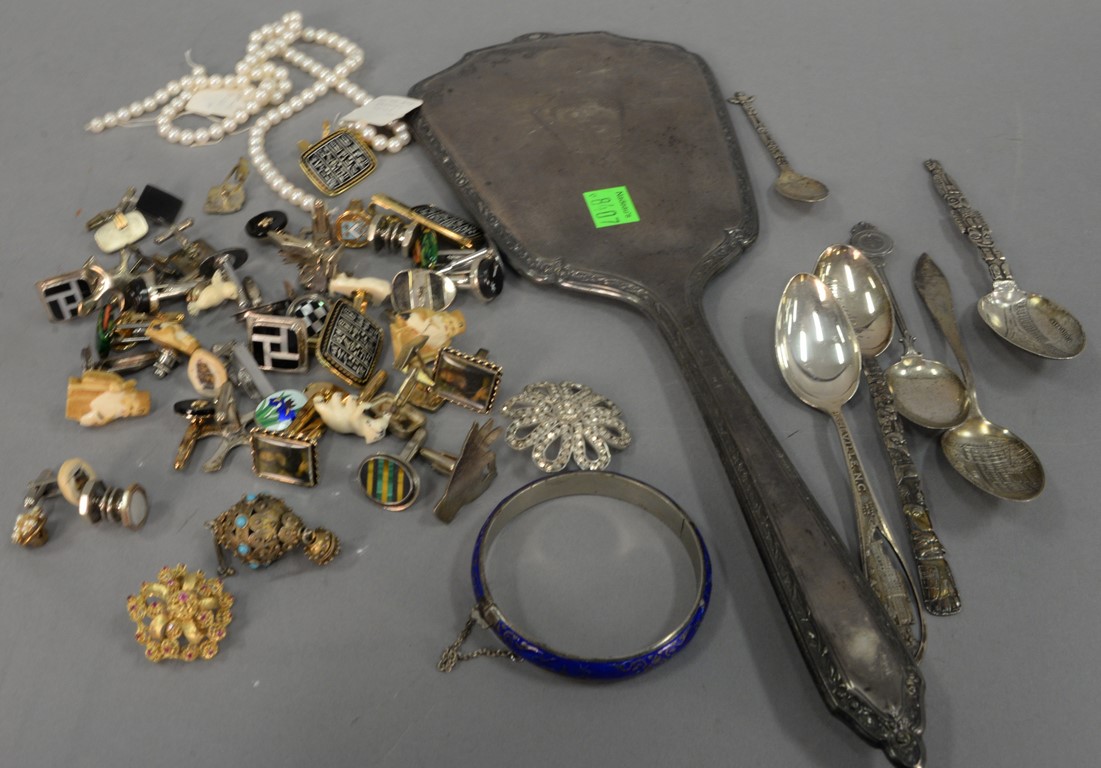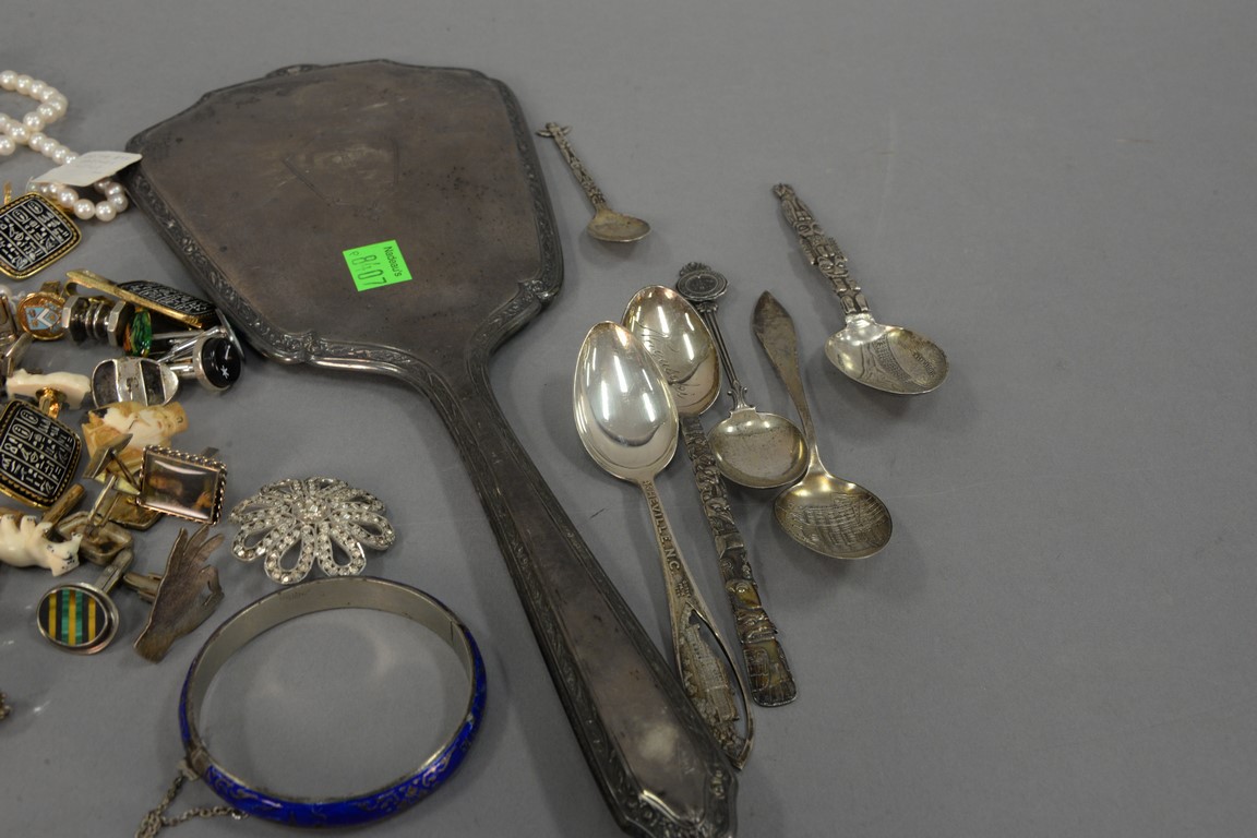 Lot 272: Tray lot with miscellaneous sterling spoons, Chinese enameled bracelet, fish decoy, cuff links.