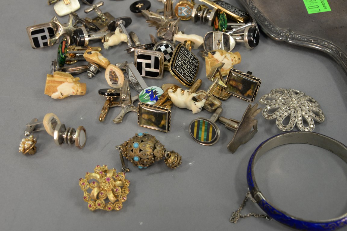 Tray lot with miscellaneous sterling spoons, Chinese enameled bracelet, fish decoy, cuff links.