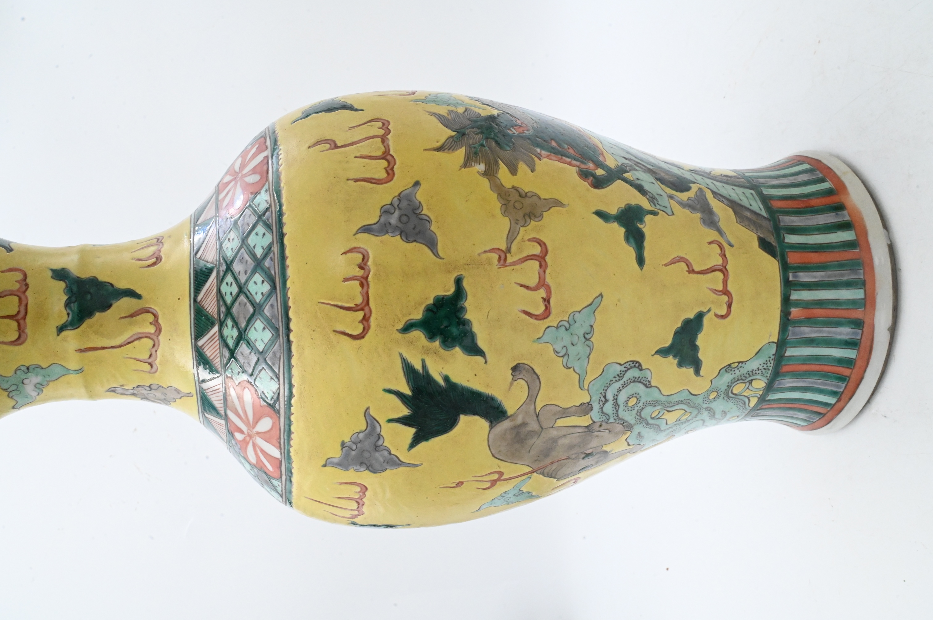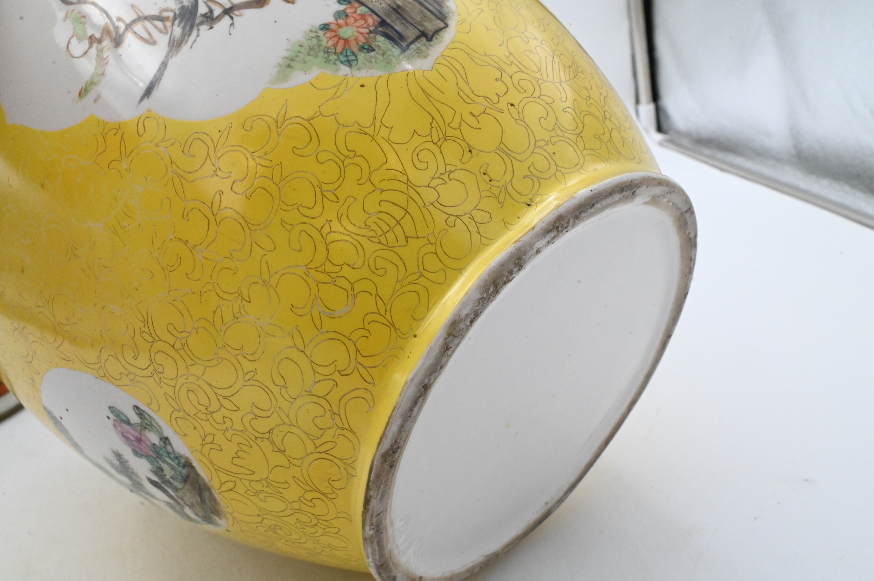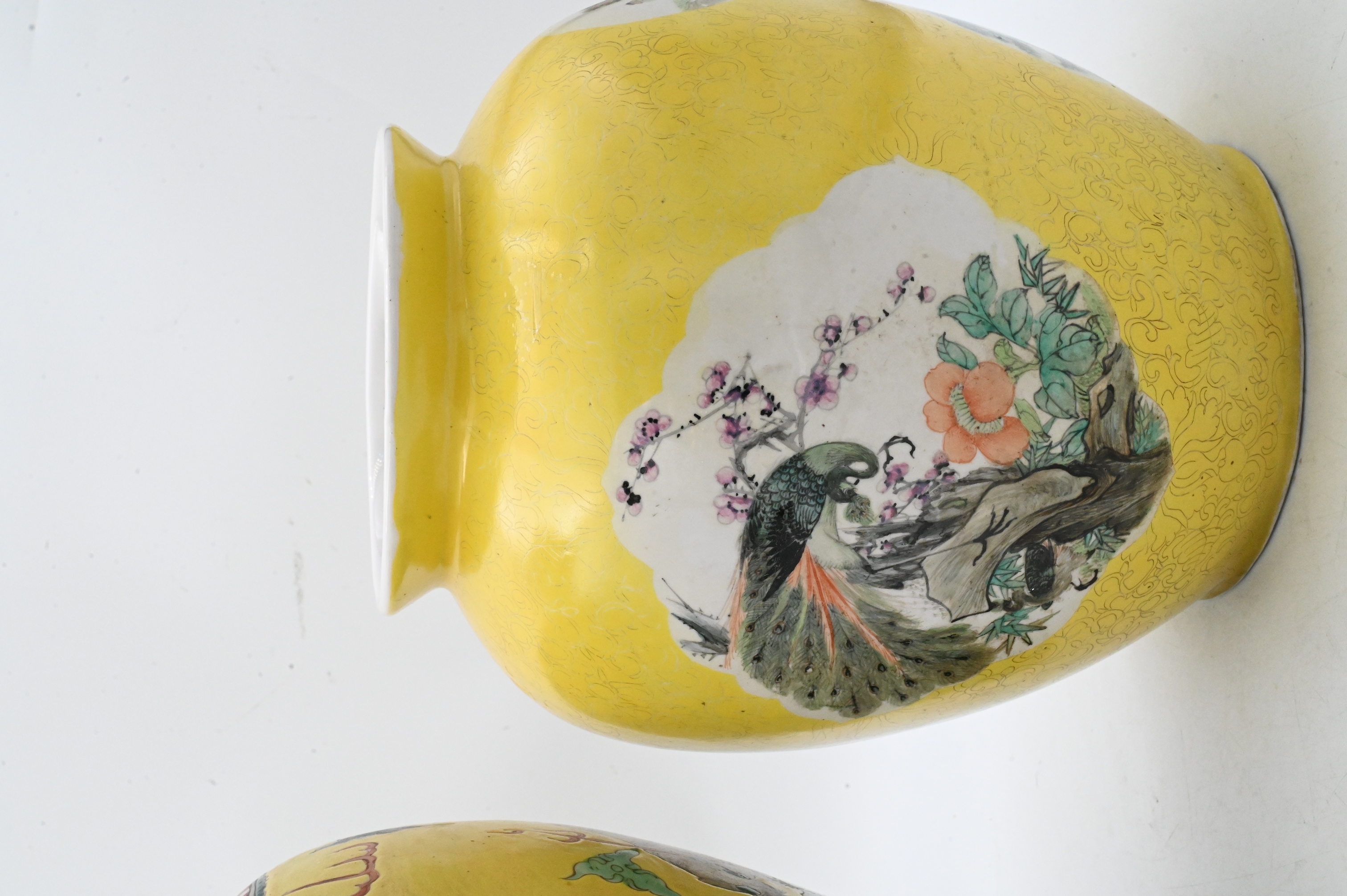 yellow ground and incised vase with cartouches featuring peacocks and flowers along with tall flared neck vase featuring dragons, panther and foo dog motif