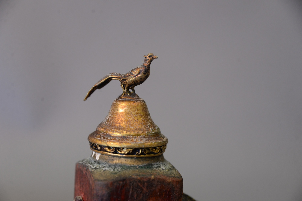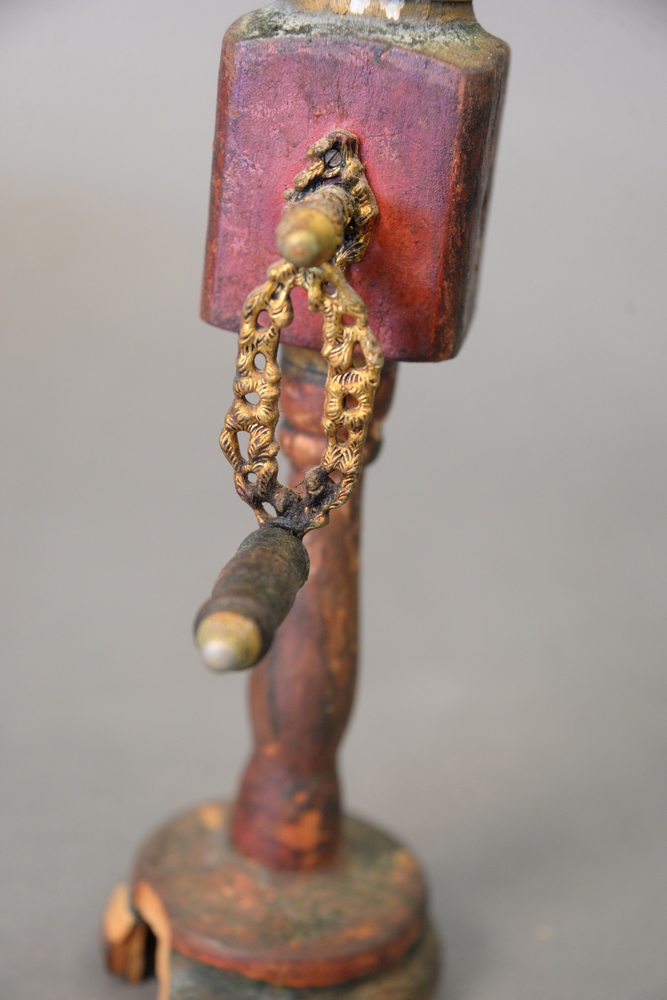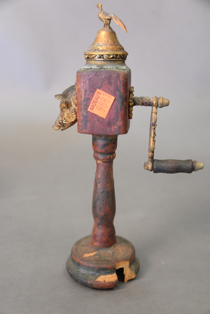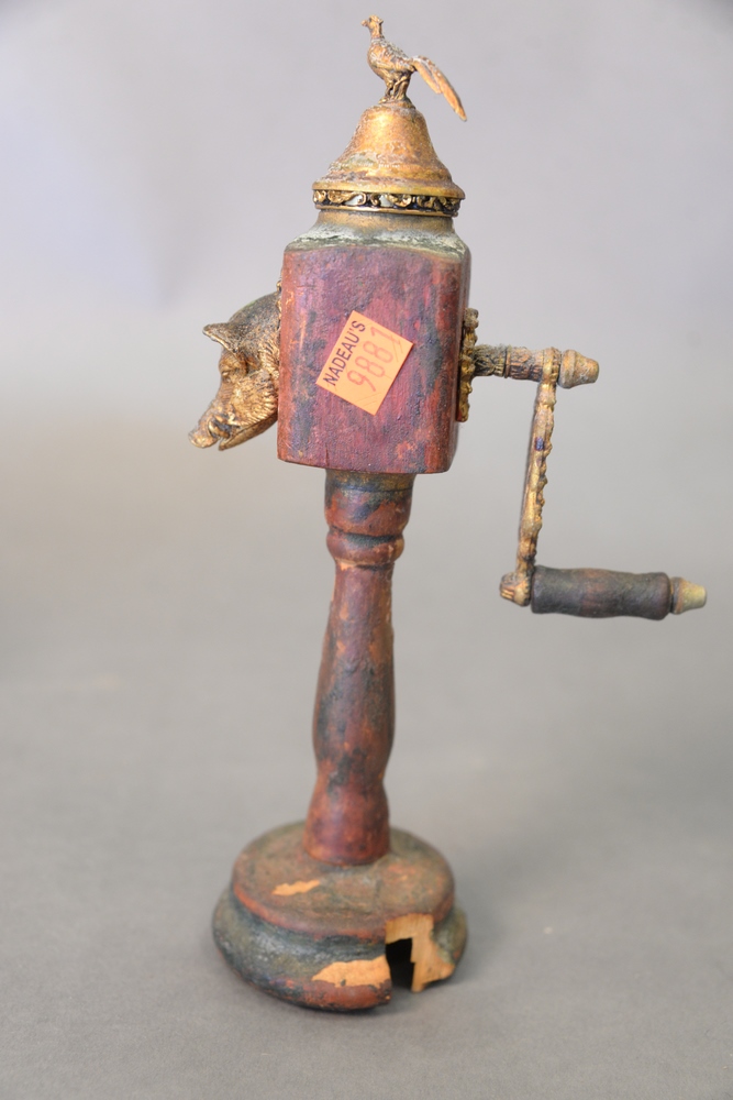 Lot 272A: Figural Nutmeg Grinder, 19th century, hand painted with brass crank, boars head spout and pheasant cap, height 10 inches.