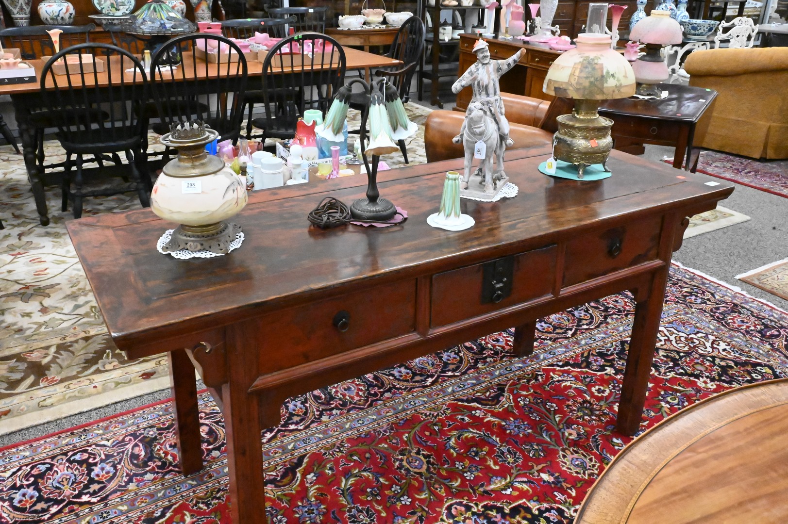 Chinese Alter Table, along with Asian style coffee table, having three drawers and red finish, height 32 inches, top 23 1/4″ x 65 1/2″. Provenance: Estate of Peter Tillou, Litchfield, Connecticut.