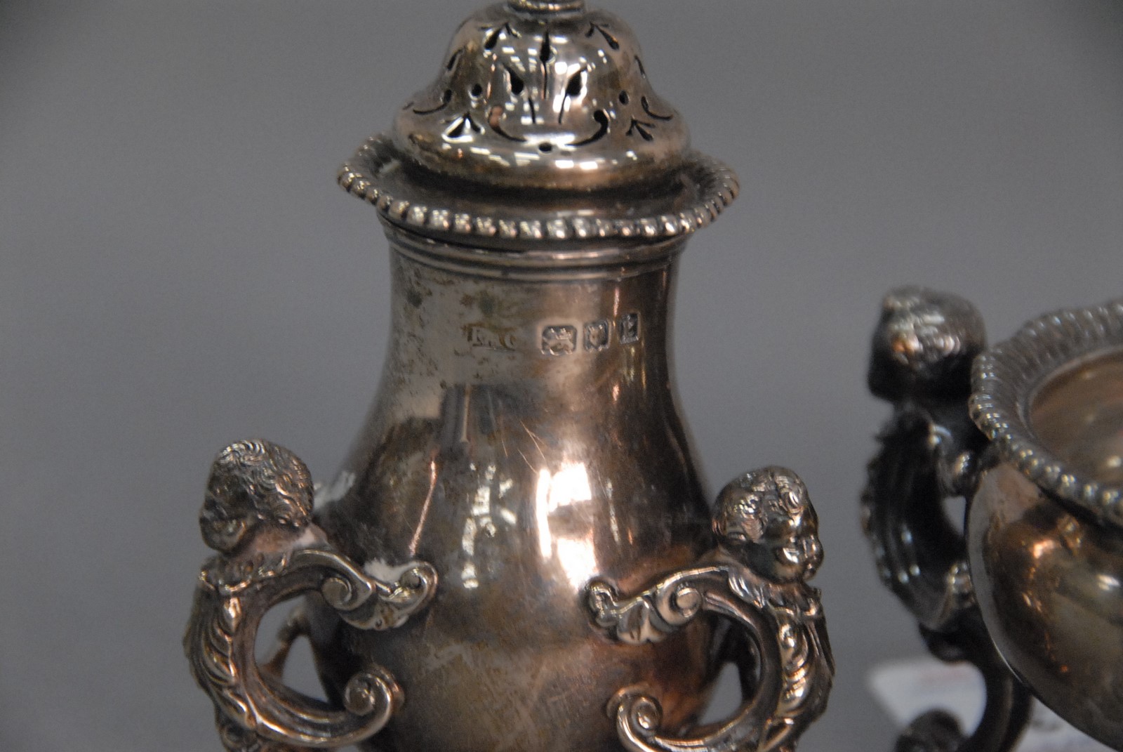 Creighton English silver open salt and pepper shaker, each mounted with putti head and hoof feet. shaker: ht. 4 1/4 in. 14.5 total t oz. Provenance: Property from The Estate of Margaret Oliphant of Old Lyme, Connecticut