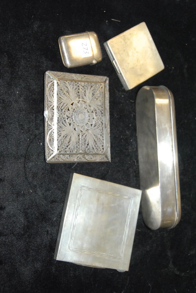 Five piece lot of sterling silver match safe, cigarette case, and small boxes.