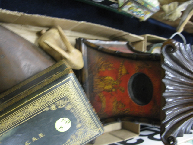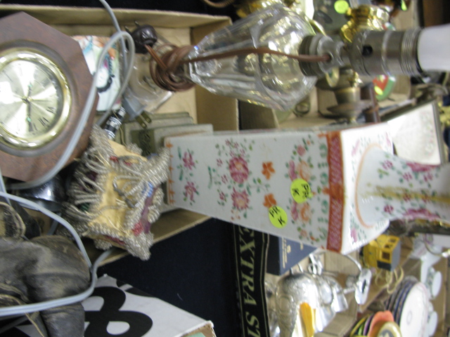 Four box lots 2 lamps, refinished duck decoy, Oriental piece, cloisonn box, pair of early shoes, couple of clocks, basket, paper weight and misc.