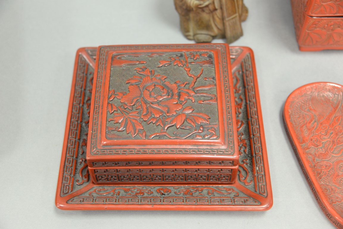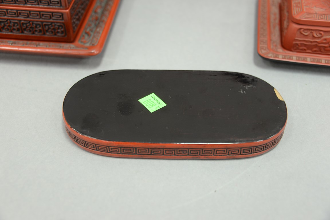 Lot 273: Group of five Oriental pieces to include cinnabar five piece stacking box, small oval cinnabar tray, cinnabar box with tray, resin b…