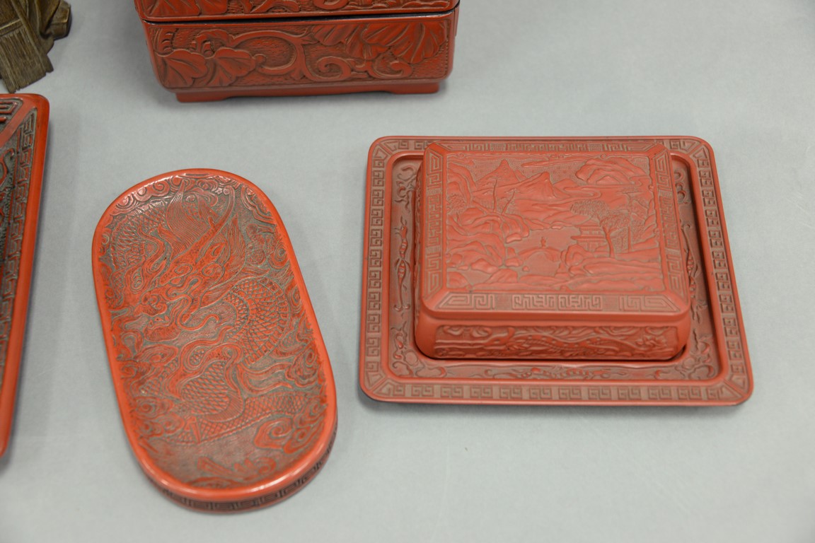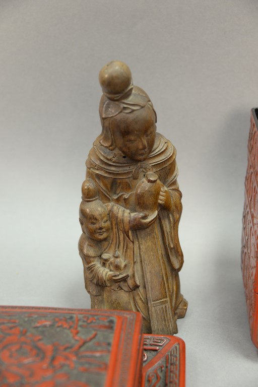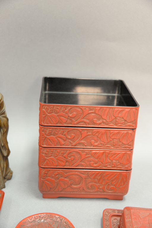 Group of five Oriental pieces to include cinnabar five piece stacking box, small oval cinnabar tray, cinnabar box with tray, resin box with tray, and carved geisha ht. 10in..