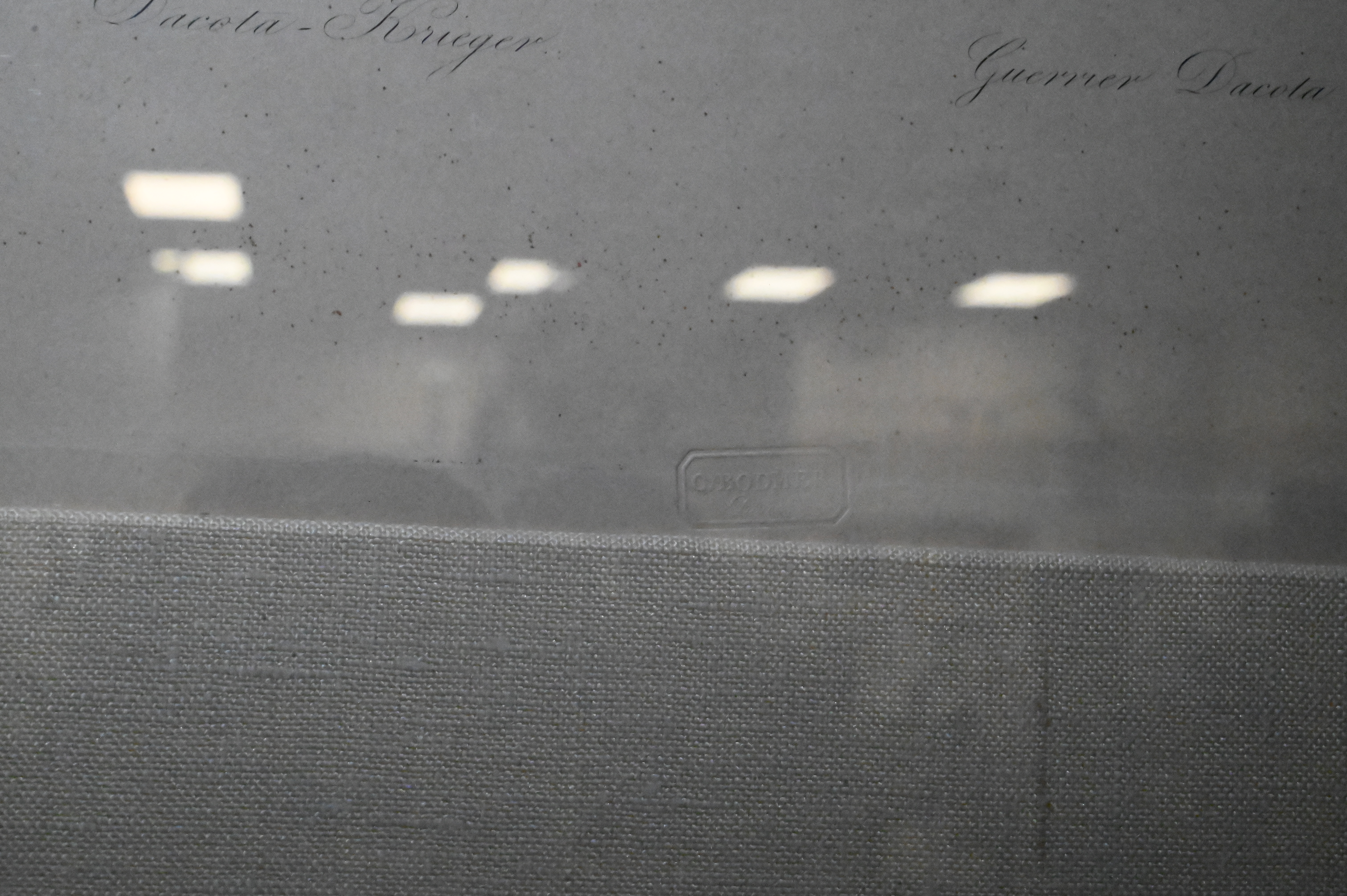 Hand-colored aquatint and line engraving depicting a Sioux warrior standing in full ceremonial dress with feathered headdress, fur robe, and tomahawk in hand, rendered with Bodmer’s signature precision and ethnographic sensitivity