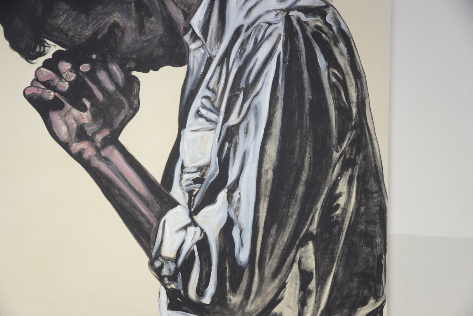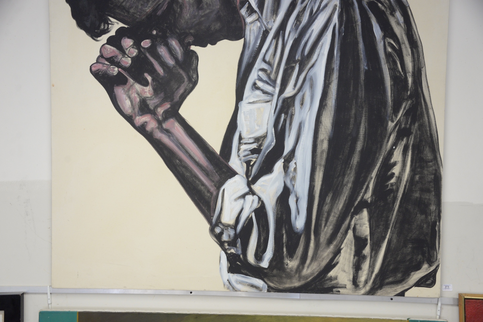 Lot 273: Ken Goodman (American, 1950-1995), Fear/Hope, 1983, oil on canvas, signed, titled, and dated on the reverse, 60″ x 60″.