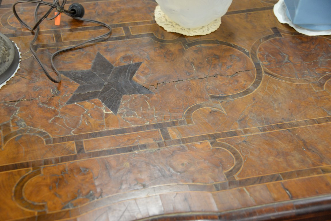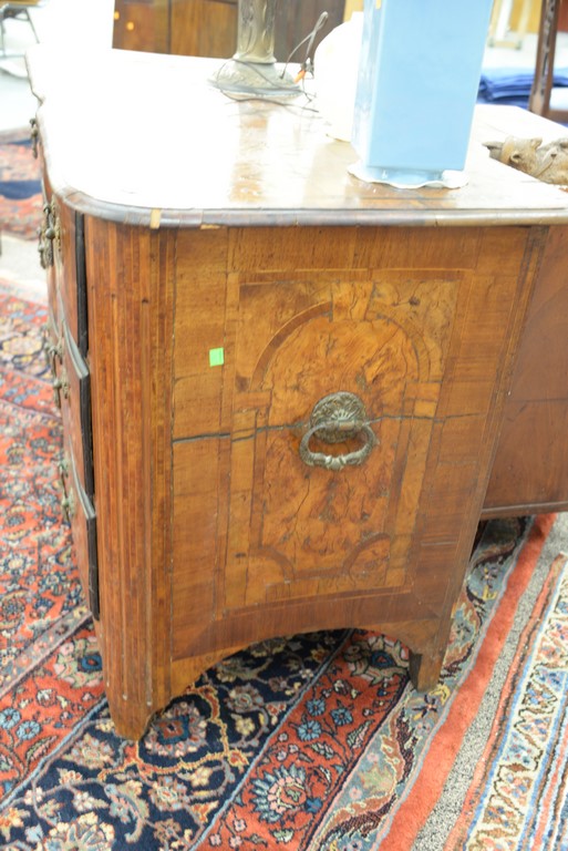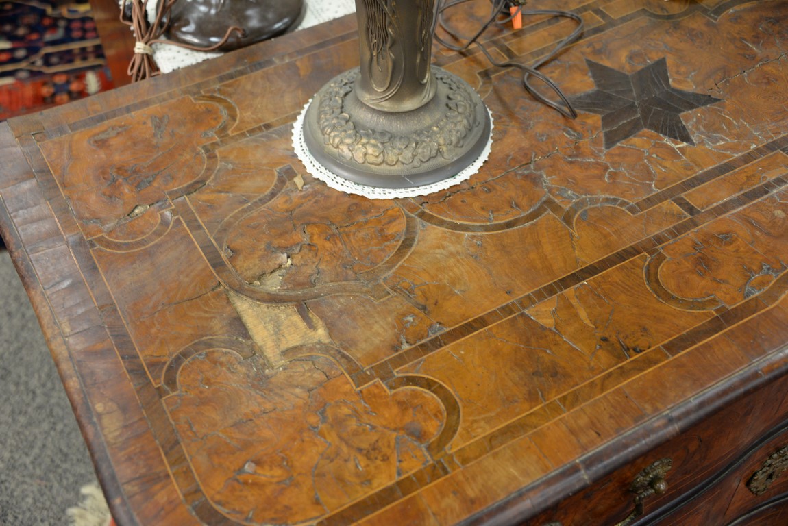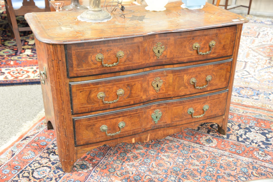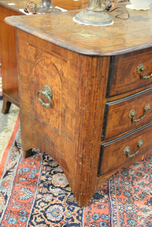 Lot 273: Louis XIV commode, burlwood with three drawers having star and banding inlays and concave sides with original brasses and side handl…