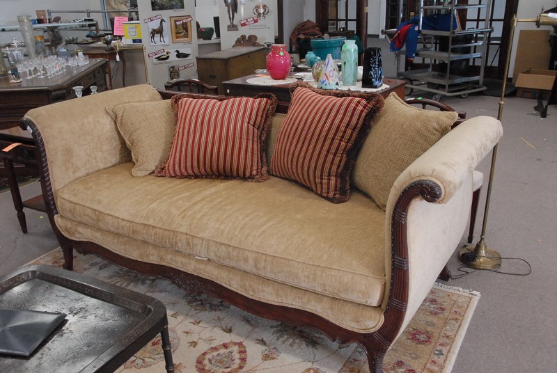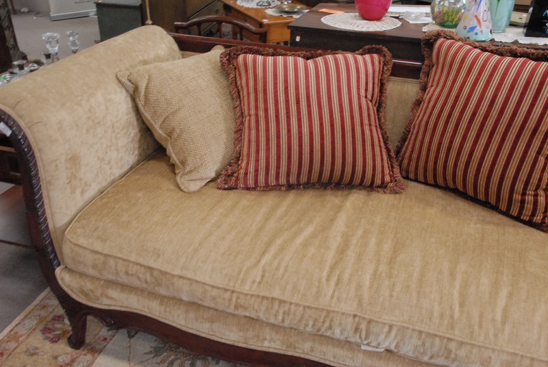 Massoud sofa with carved mahogany frame and pillow back. lg. 89in.