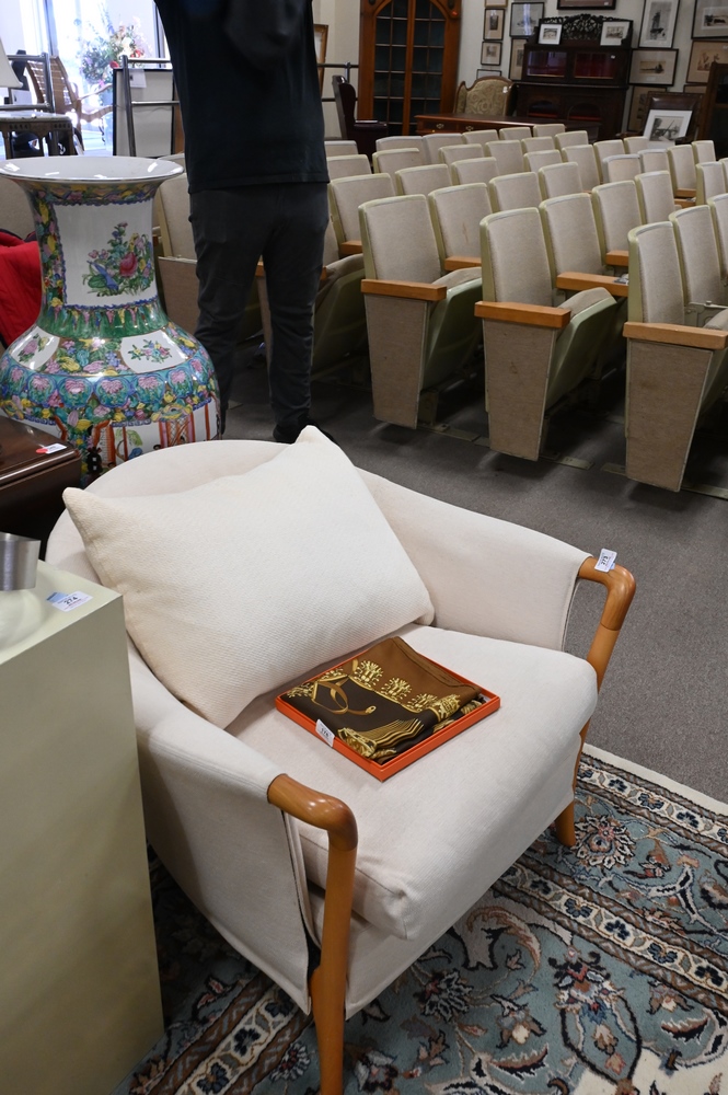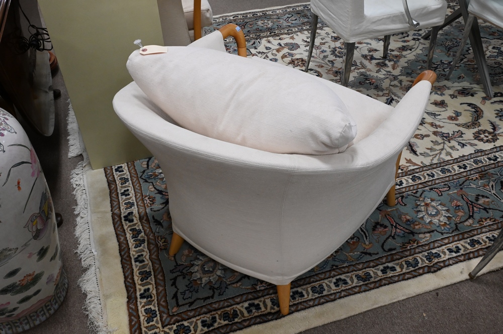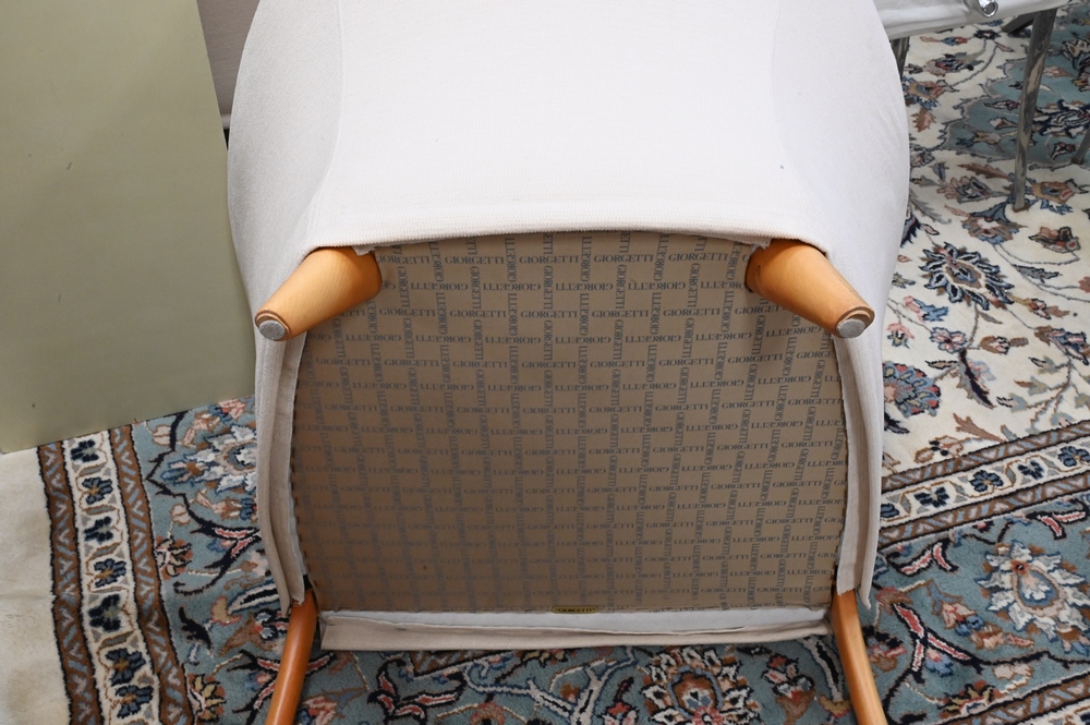Lot 273: Pair of Umberto Asnago for Giorgetti Upholstered Chairs, having exposed wood arms, seat height 17 inches.