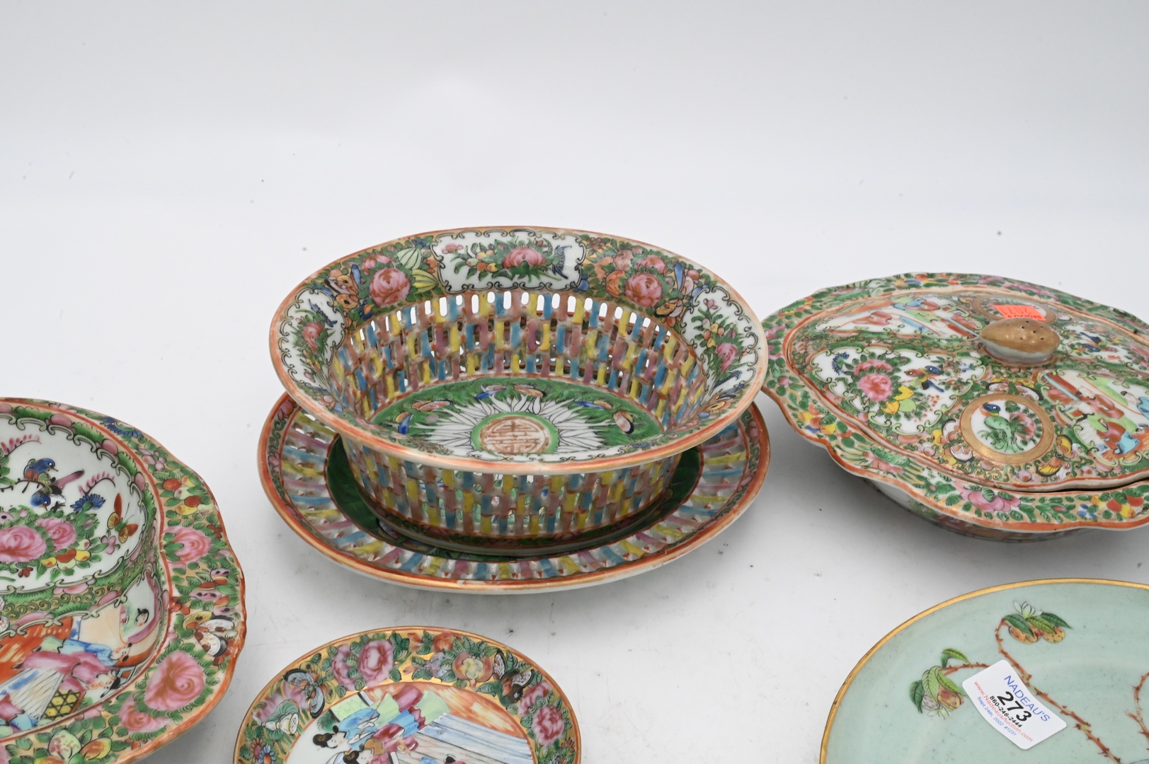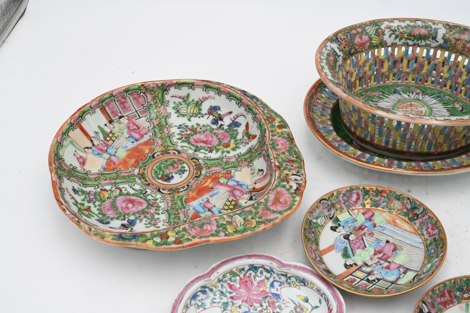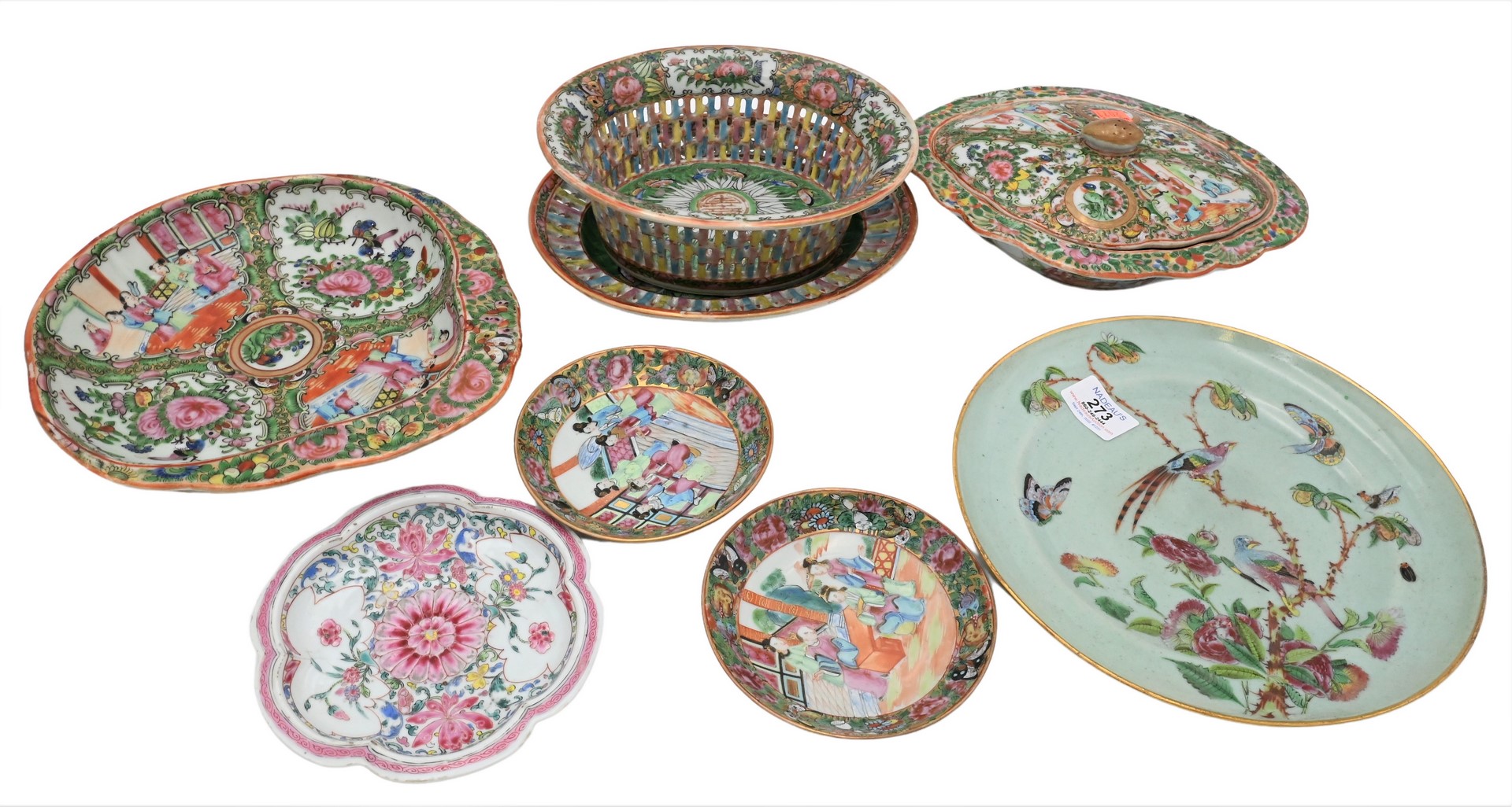 Eight Piece Rose Famille Lot, to include plate and small dish, a reticulated bowl and under plate, covered vegetable dish, shaped dish, along with small plates.