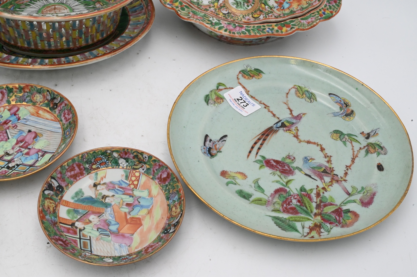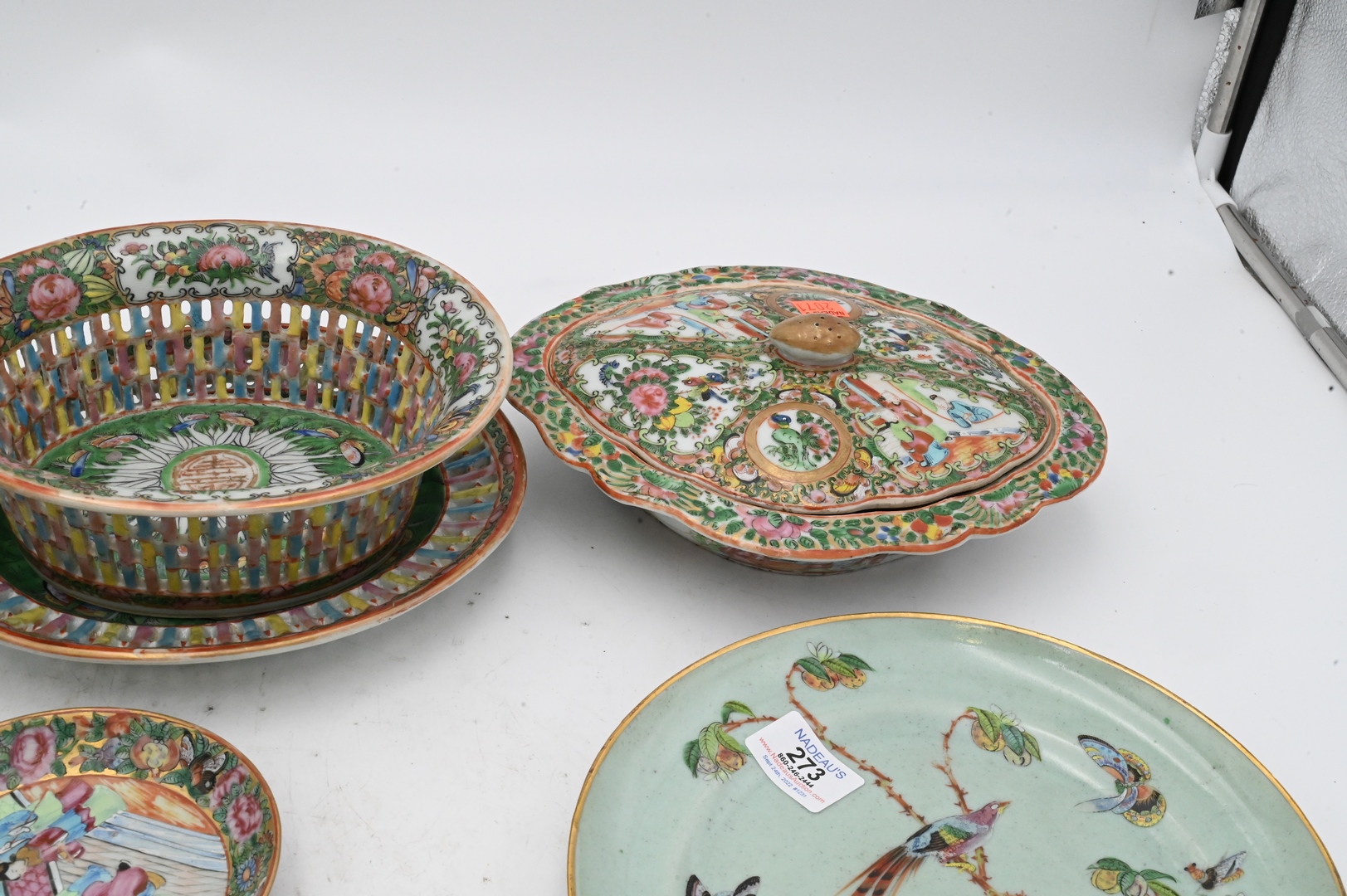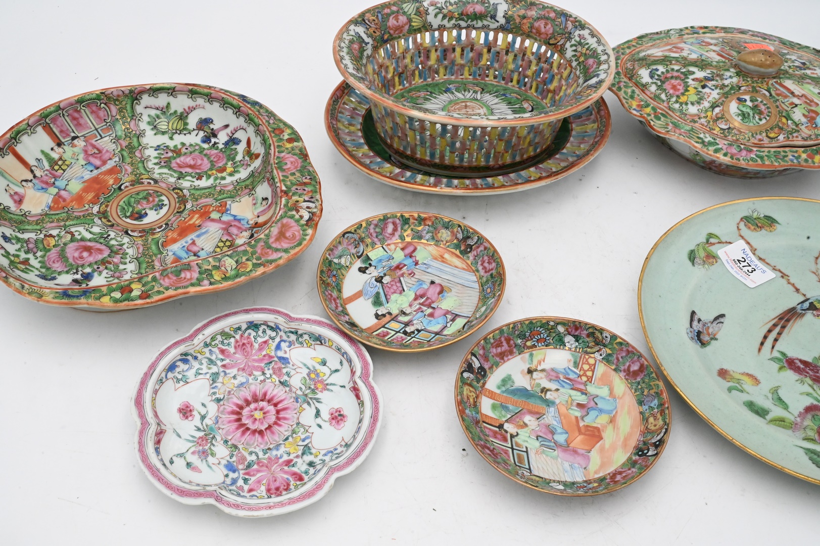 Eight Piece Rose Famille Lot, to include plate and small dish, a reticulated bowl and under plate, covered vegetable dish, shaped dish, along with small plates.