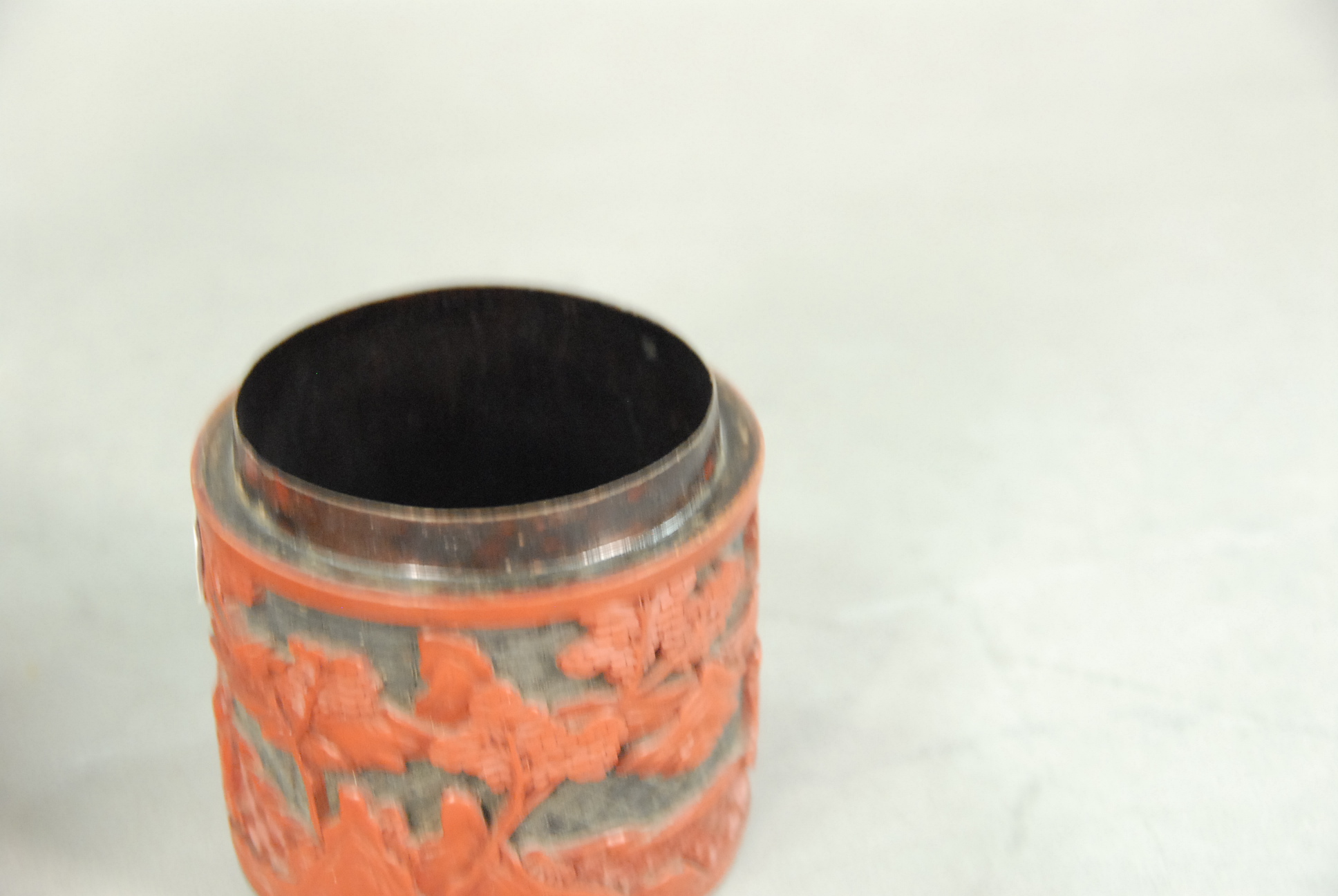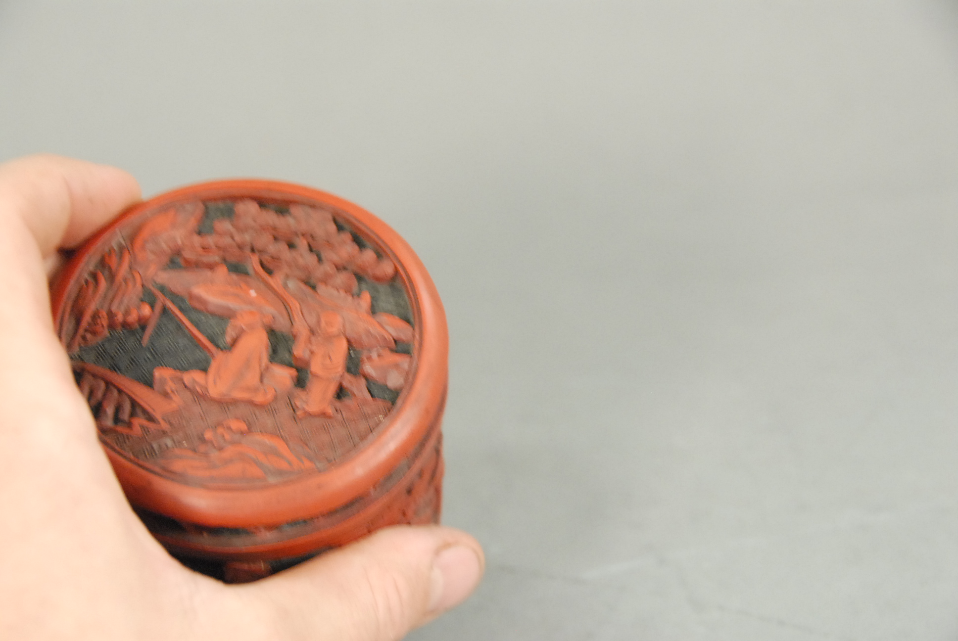 Round cinnabar lacquer box having a carved scholar fishing on the cover and landscape design on the side.