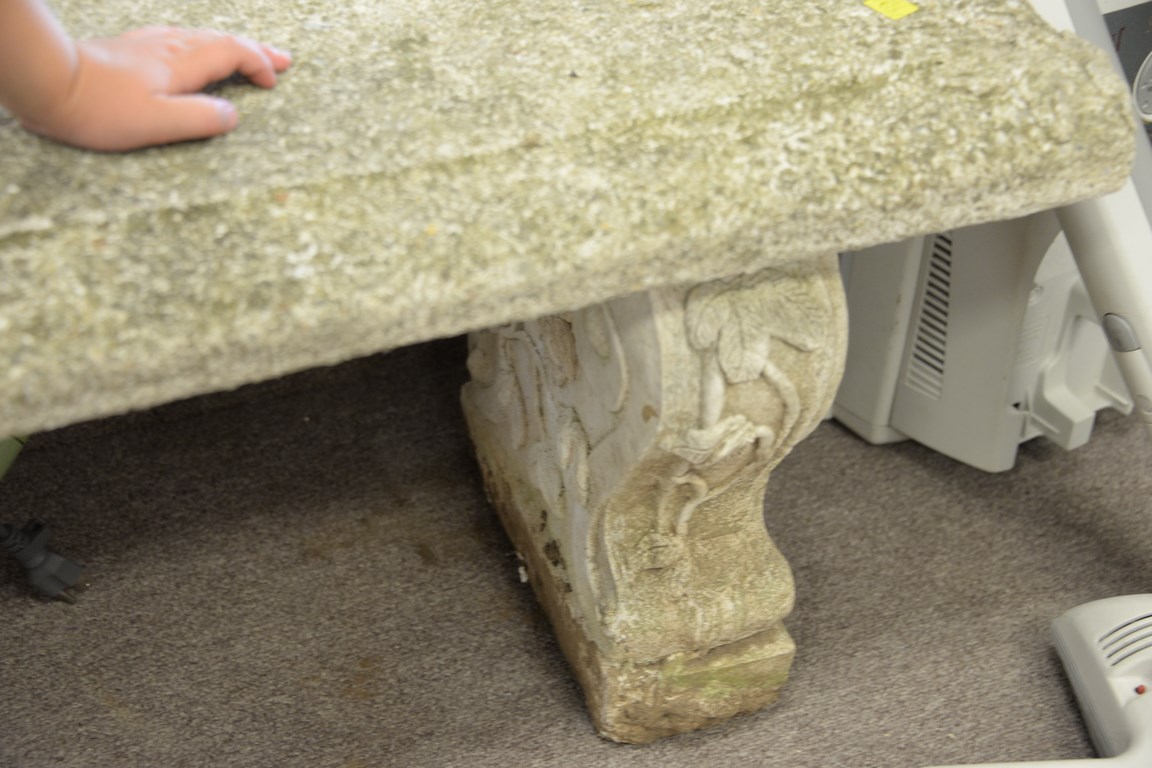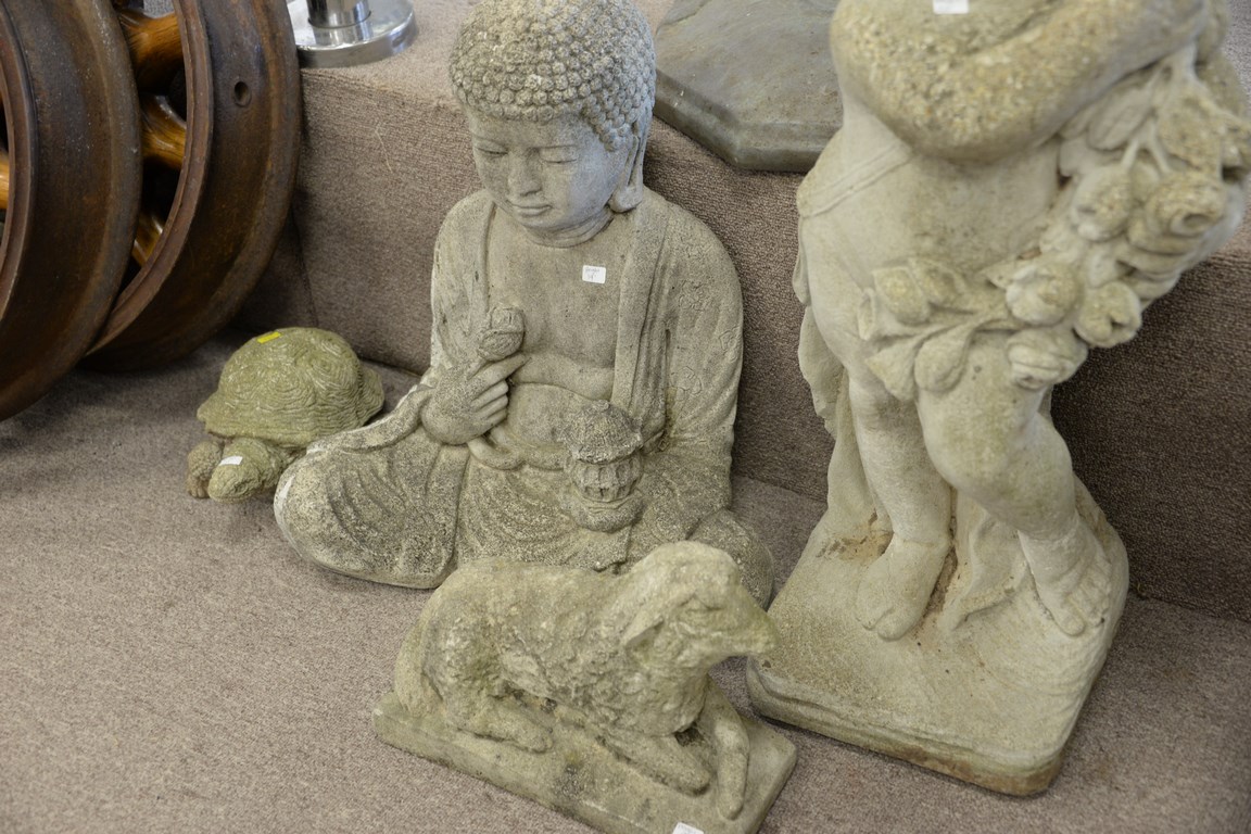 Lot 273: Six piece cement outdoor lot with two figures and bench. bench: ht. 16 in. lg. 39 in. dp. 14 in.