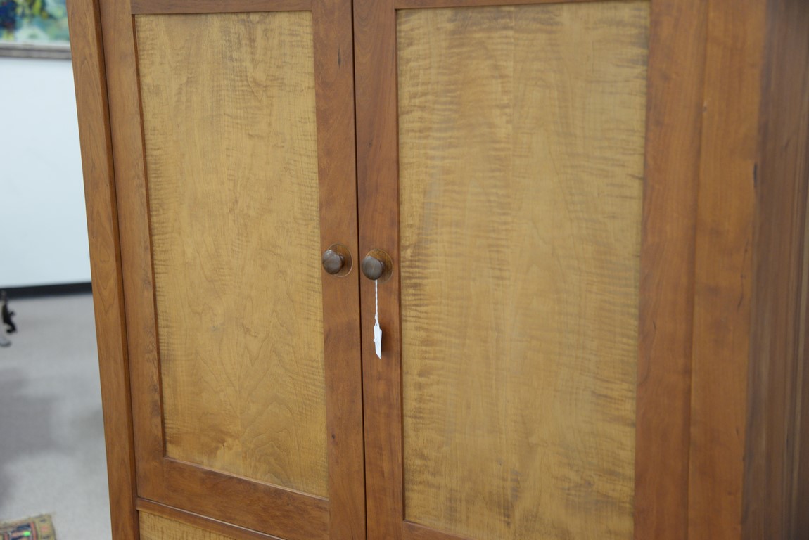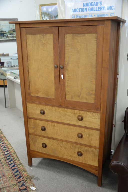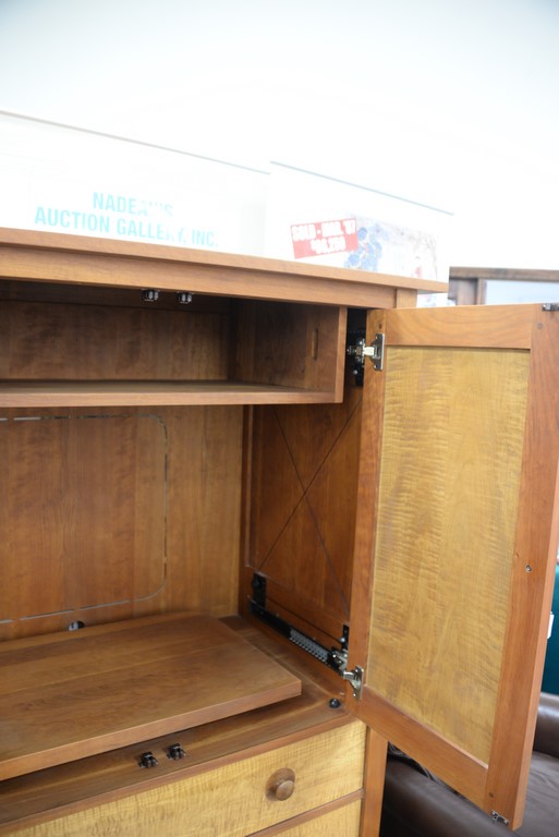 Stickley 21st Century cabinet with two doors and three drawers, cherry with figured maple fronts, soft finish replacement price 6,840. ht. 68 in. wd. 38 in. dp. 22 in.