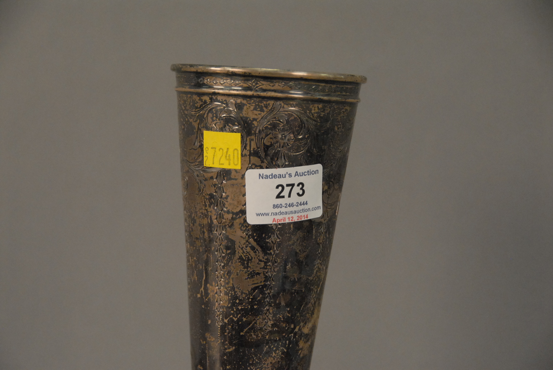Lot 273: Three piece lot to include two tall weighted sterling trumpet vases, along with a weighted sterling compote.