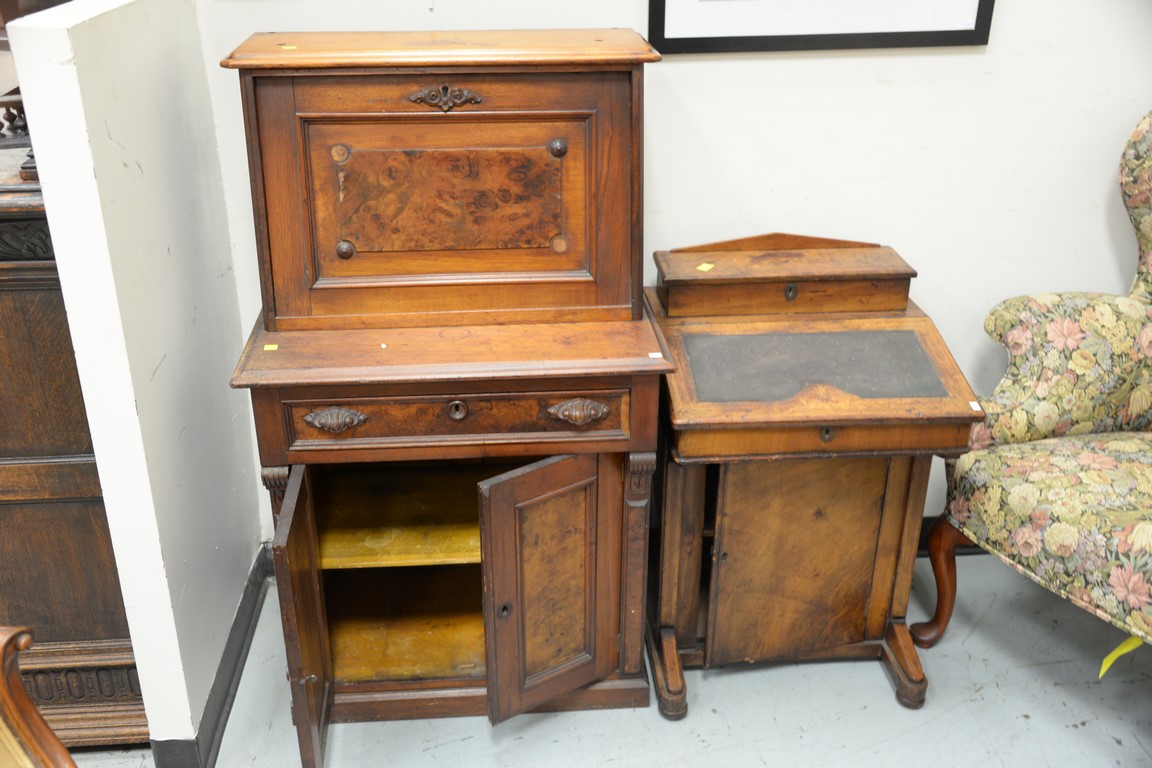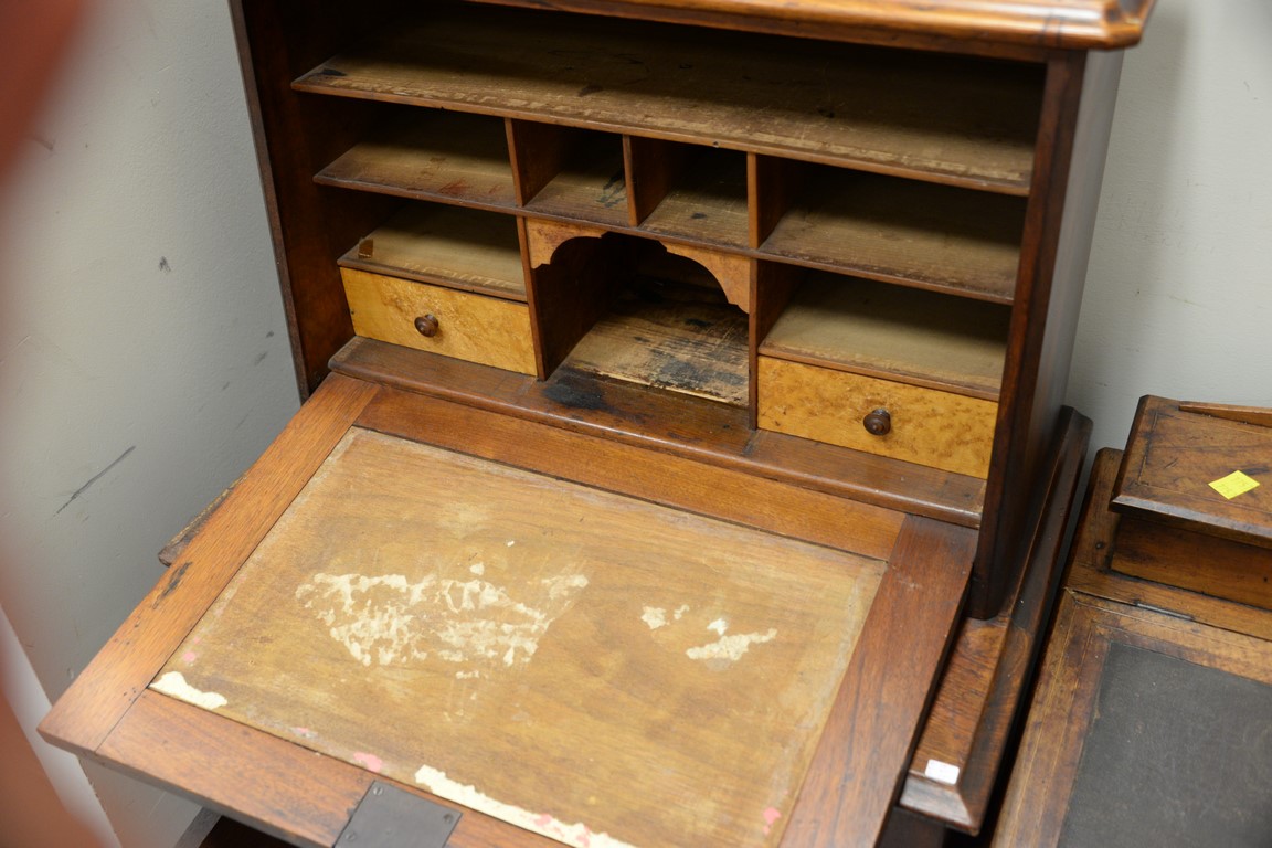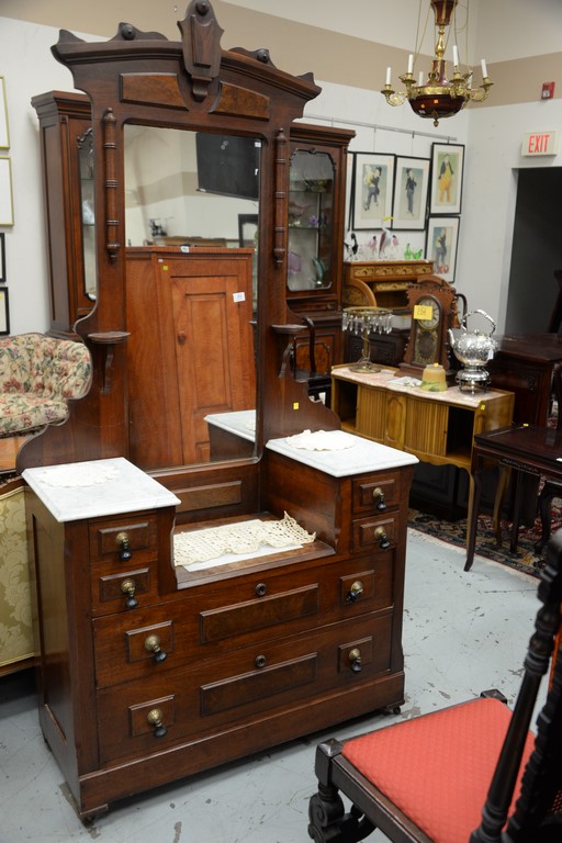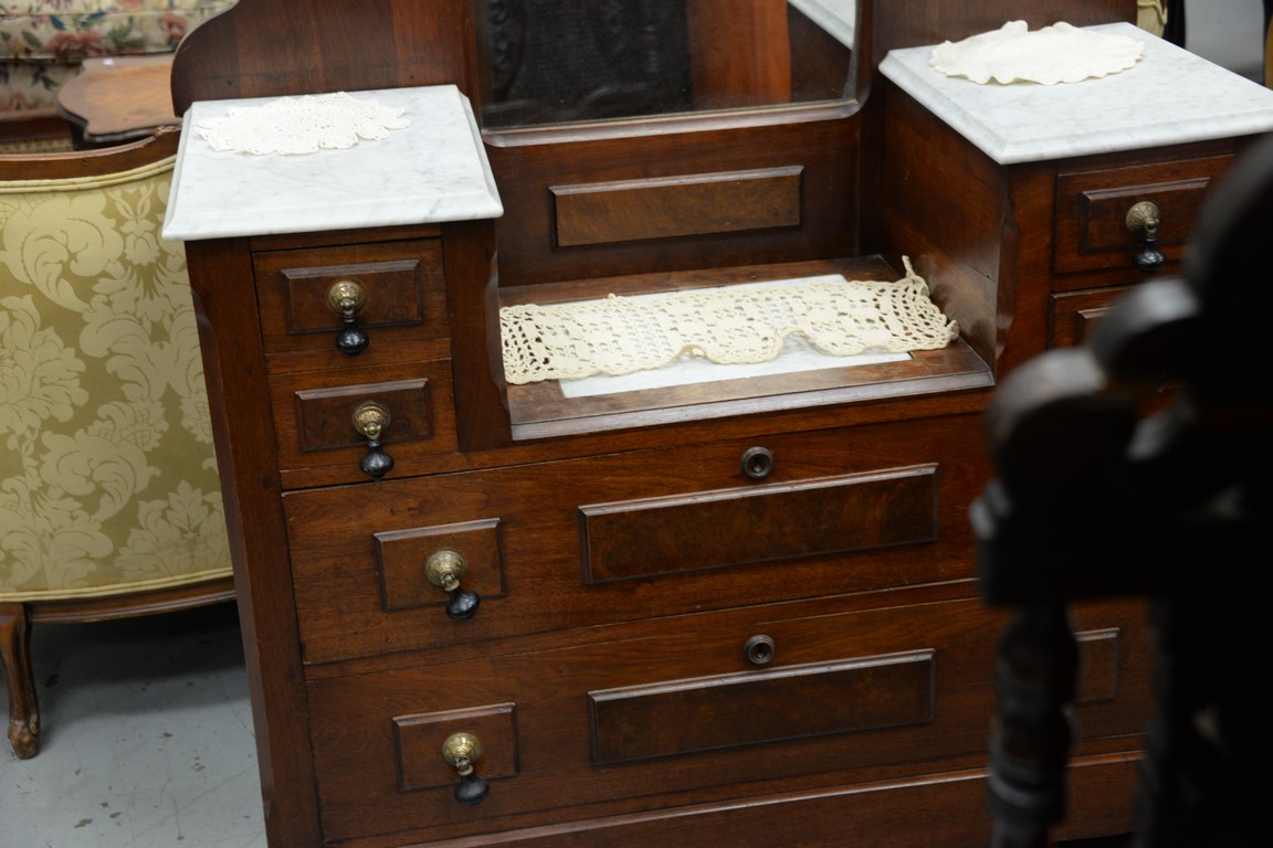 Lot 273: Three piece Victorian lot to include dropwell marble top chest ht. 85 in. wd. 43 in., Victorian drop front desk, and child size Da…