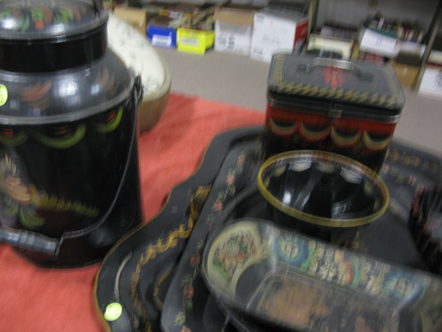Toleware lot including trays, molds, hinged cupboard container, bucket with cover.