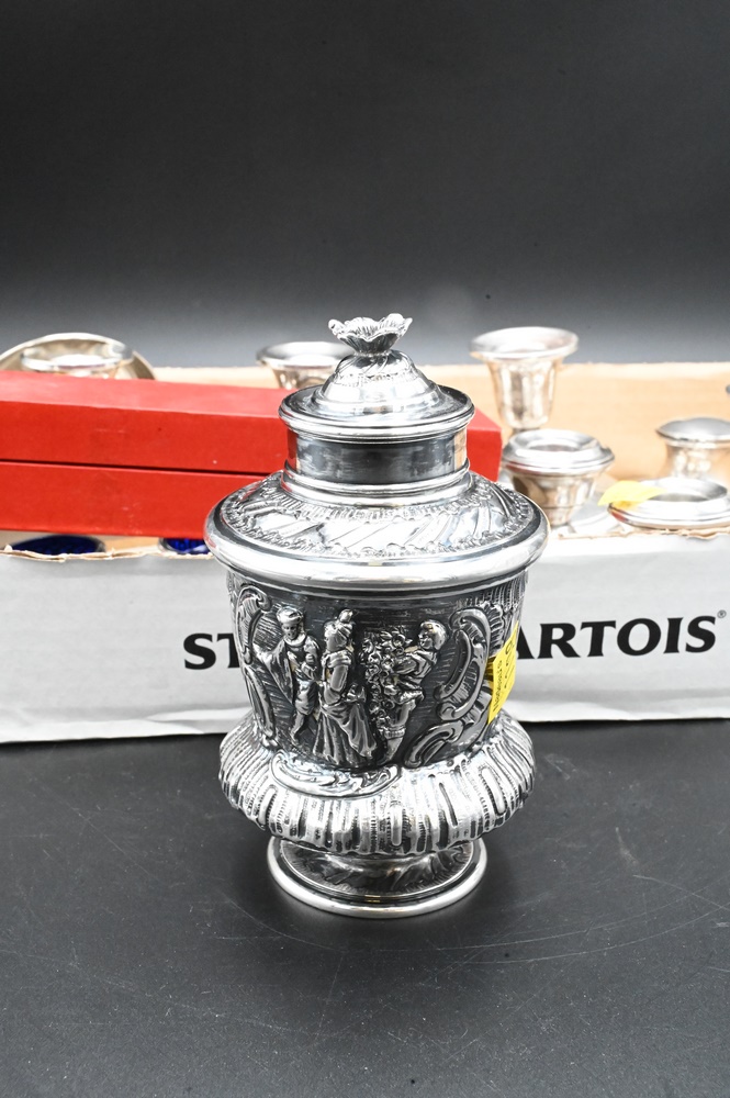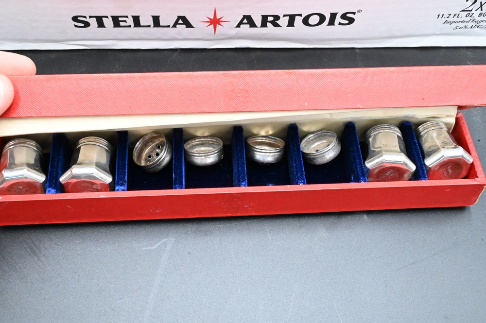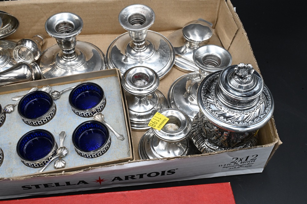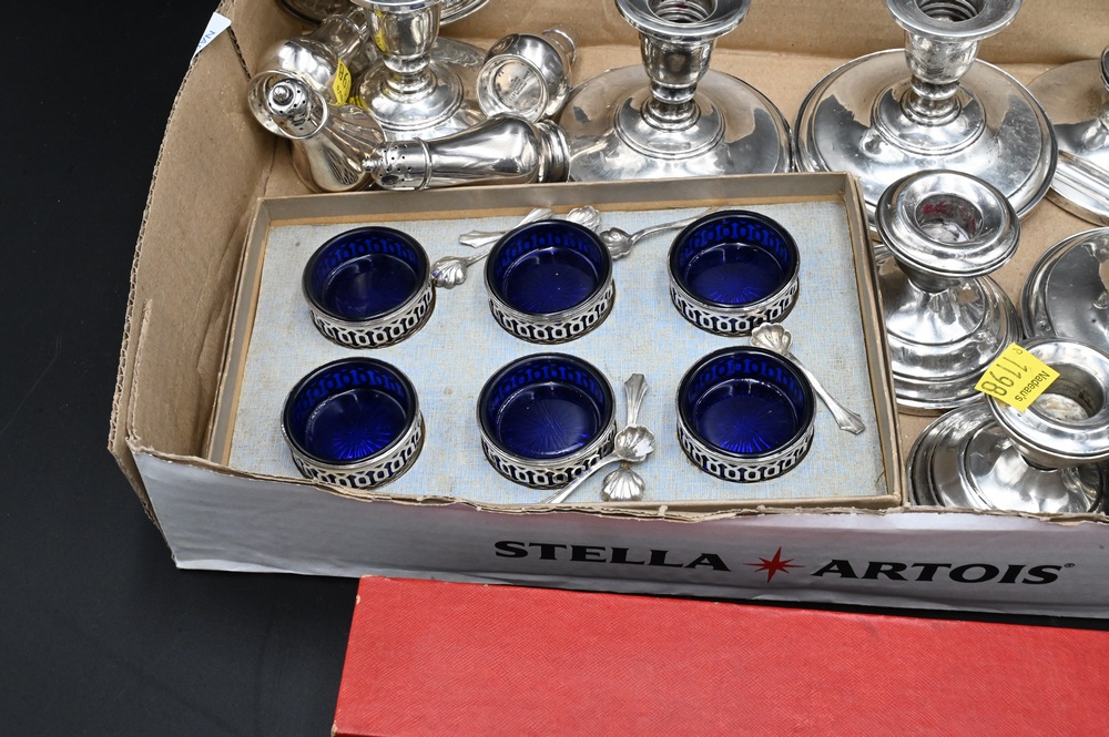 Lot 273: Tray Lot of Sterling Silver, to include six cobalt lined salts and spoons, candlesticks, shakers, inkwell, etc.