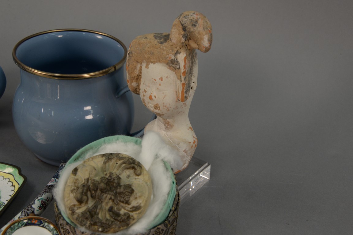 Tray lot to include miniature Staffordshire ye olde Willow cup and saucer, five enameled copper pieces, two child’s Mackenzie mugs, pottery figure, etc.