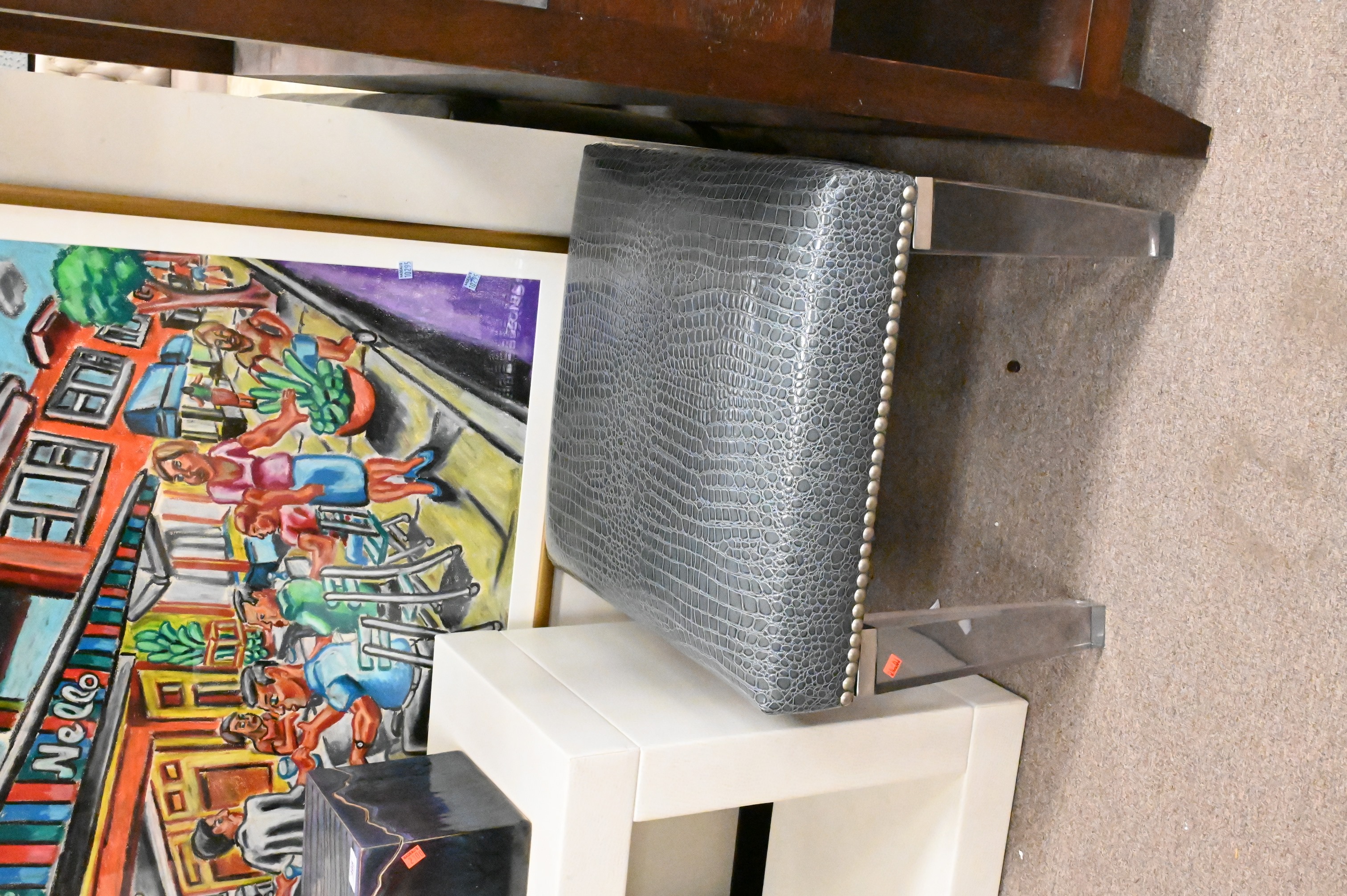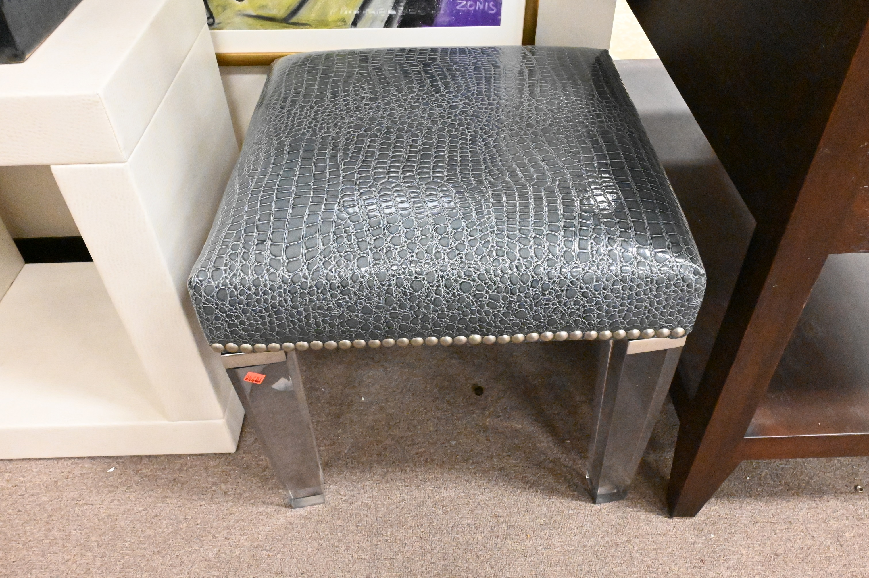 bench having chrome and acrylic legs, stool having faux snakeskin upholstery set on chrome and acrylic legs
