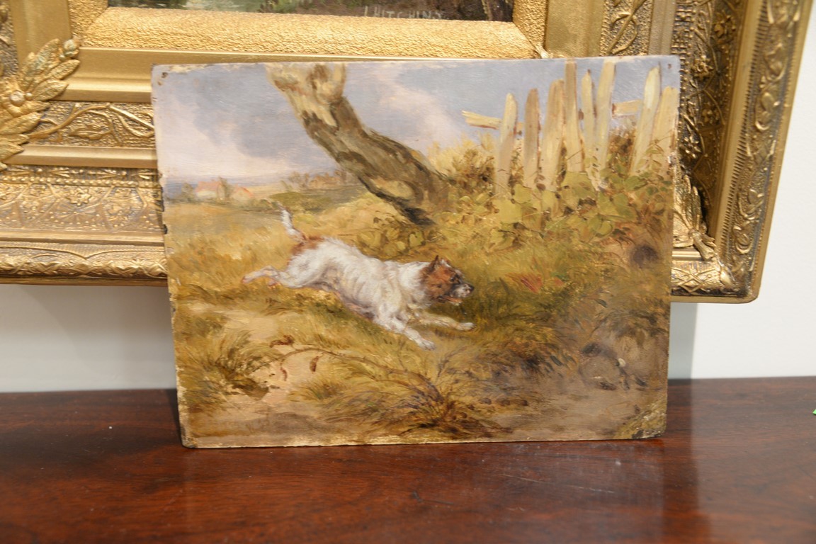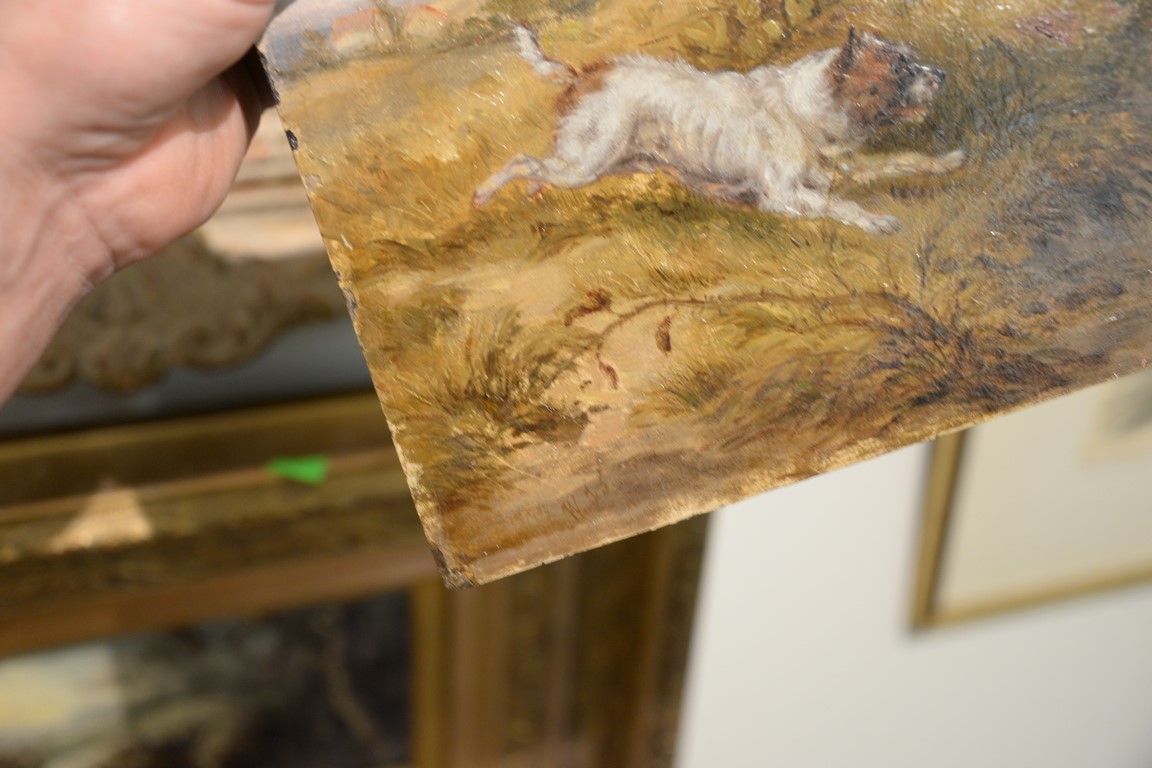 Two 19th century paintings to include John Hitchins 1865-1874, oil on board, Sheep Sleeping, signed lower right: J. Hitchins and an oil on board, Dog Chasing a Rabbit, initialed lower left: W. J. J. 6 3/4 x 9 and 7 1/4 x 9 Provenance: Estate of Arthur C. Pinto, MD