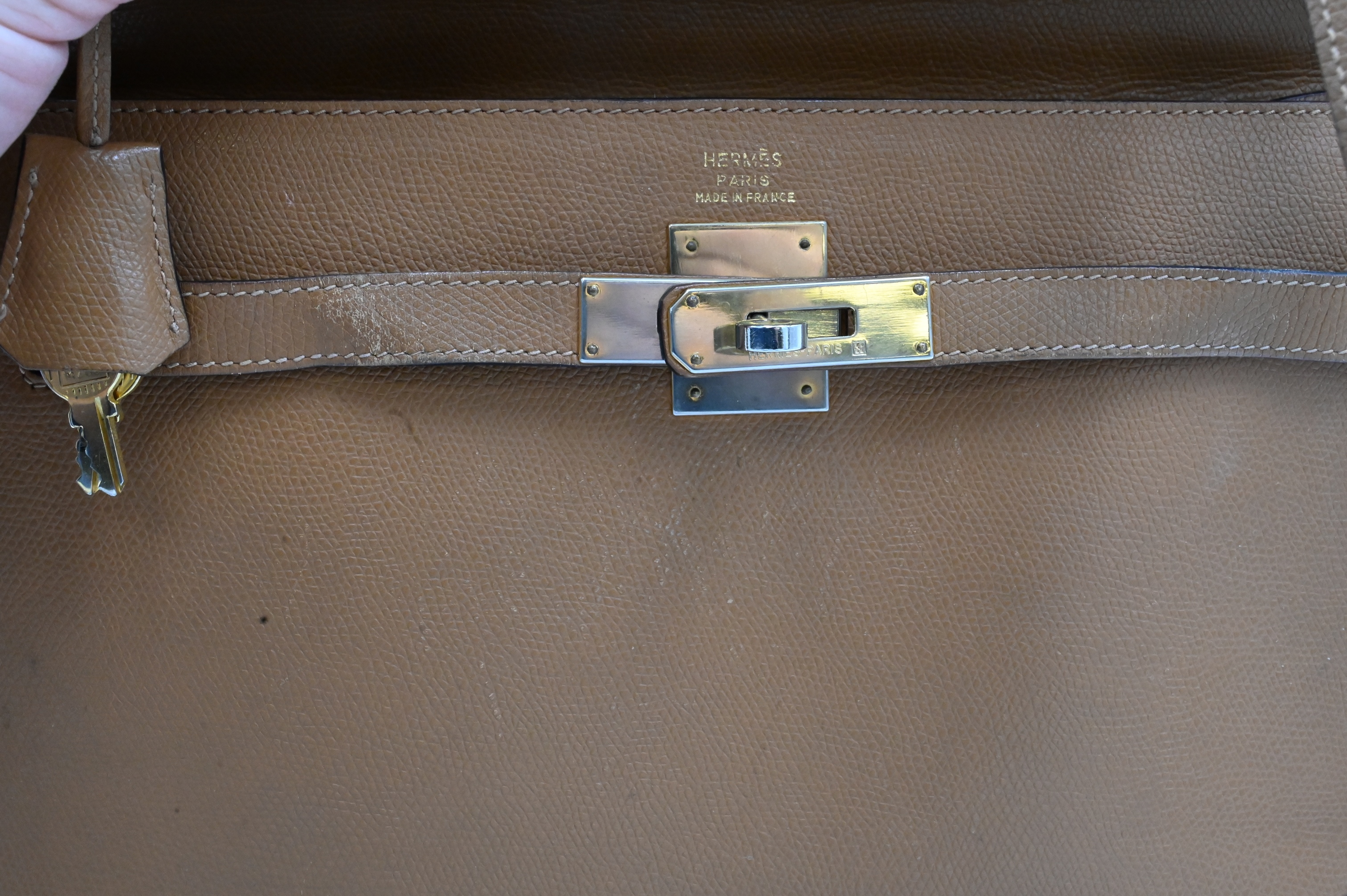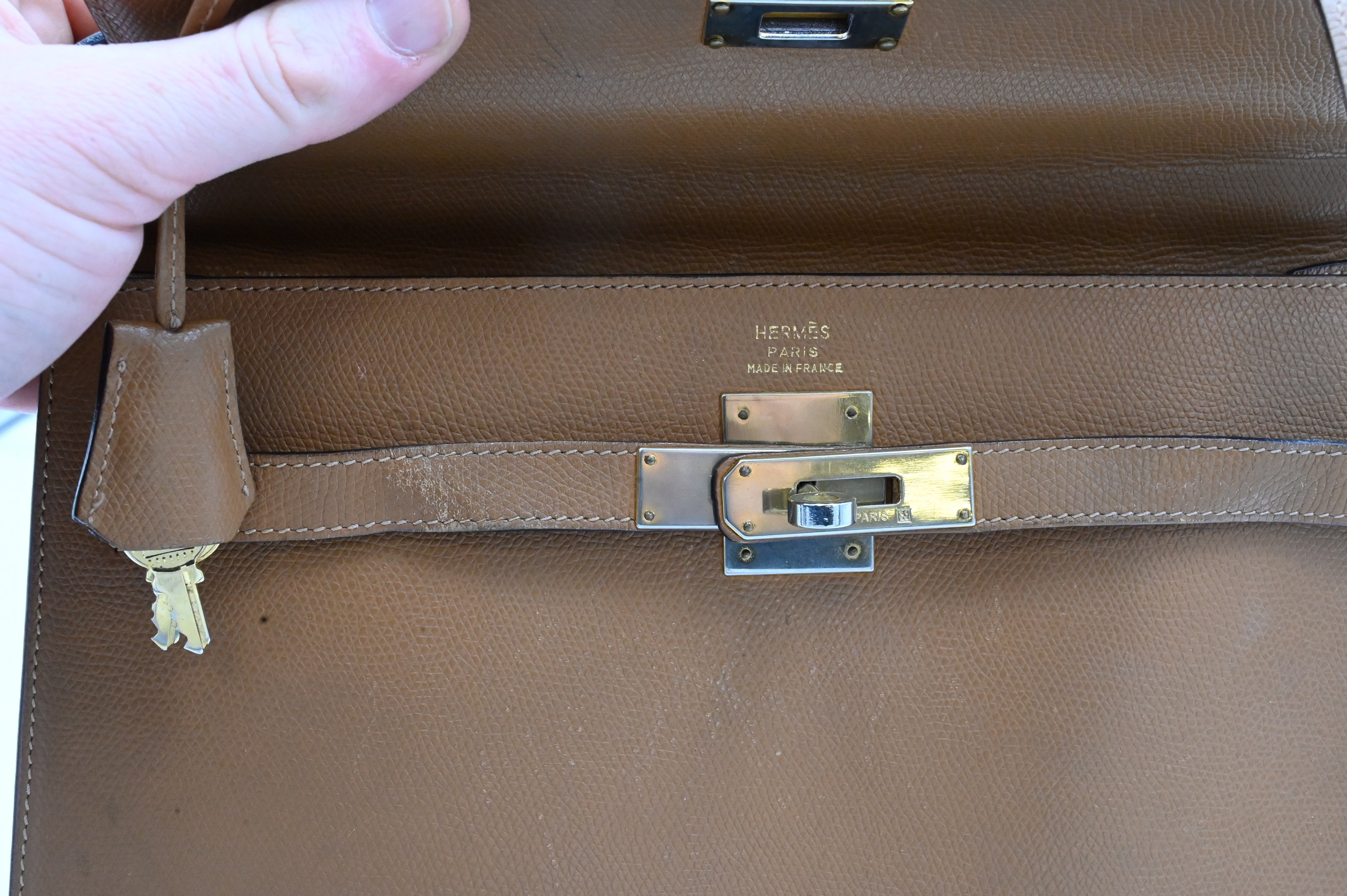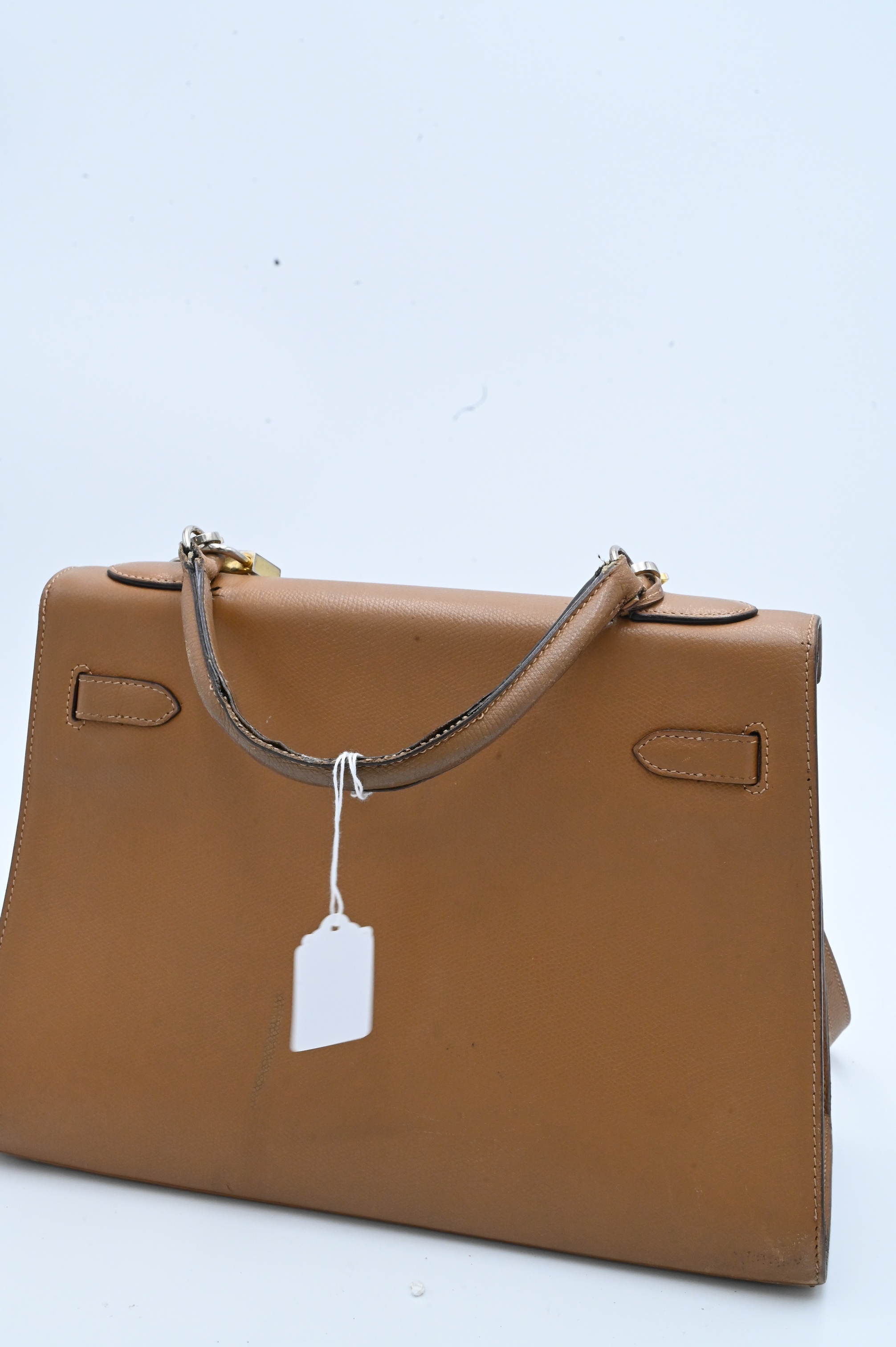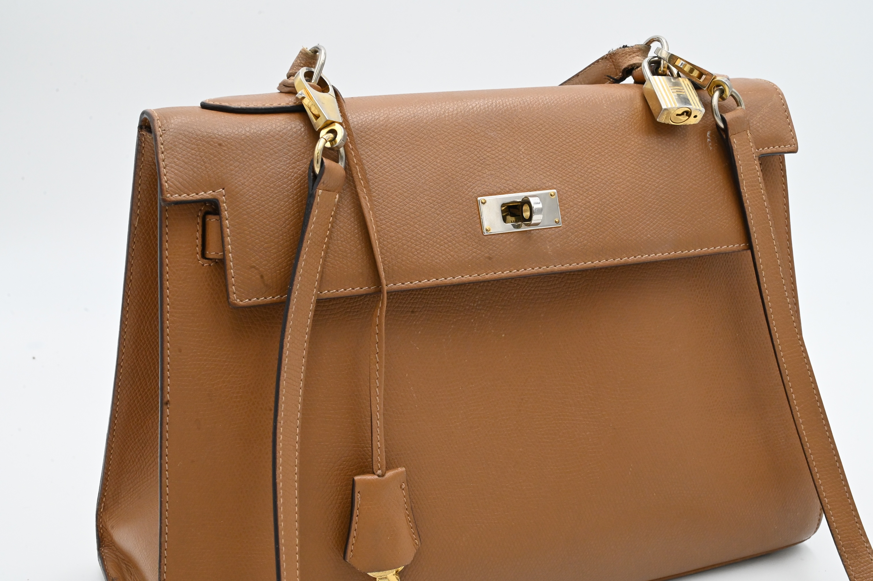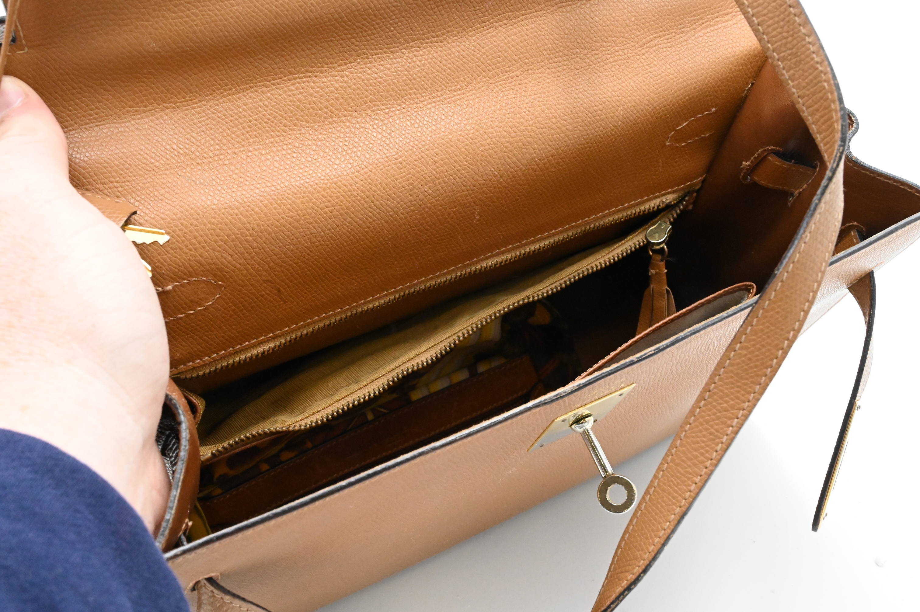Vintage Handbag, Hermes Kelly style, tan leather, single handle with fold over leather flap, interior with three pockets, zippered/one broken, key in sheath, shoulder strap, hardware and clasps, marked Hermes, Paris and a square mark, 12 1/2″ x 4 1/2″, height 9 inches including straps.