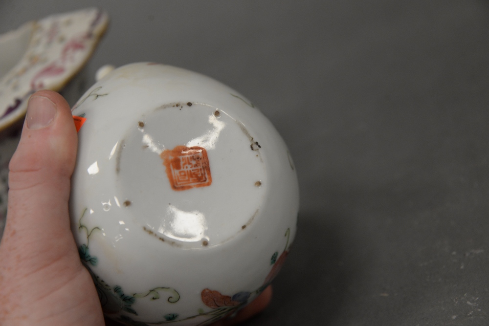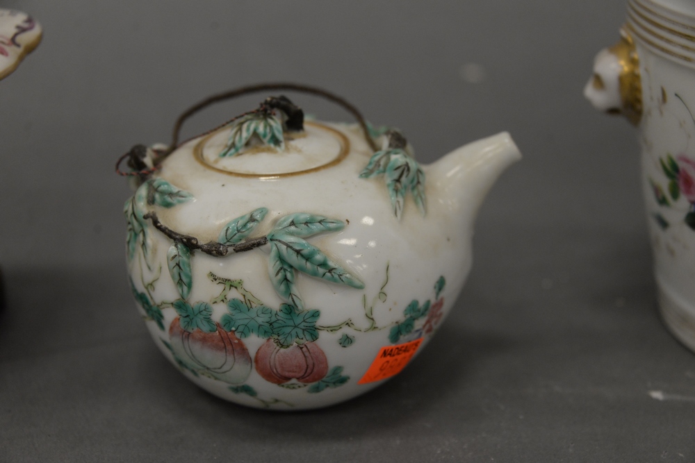 Lot 273A: Four piece porcelain lot to include a pair of floral cache pots having mounted lion form handles; a Chinese export teapot, marked to…