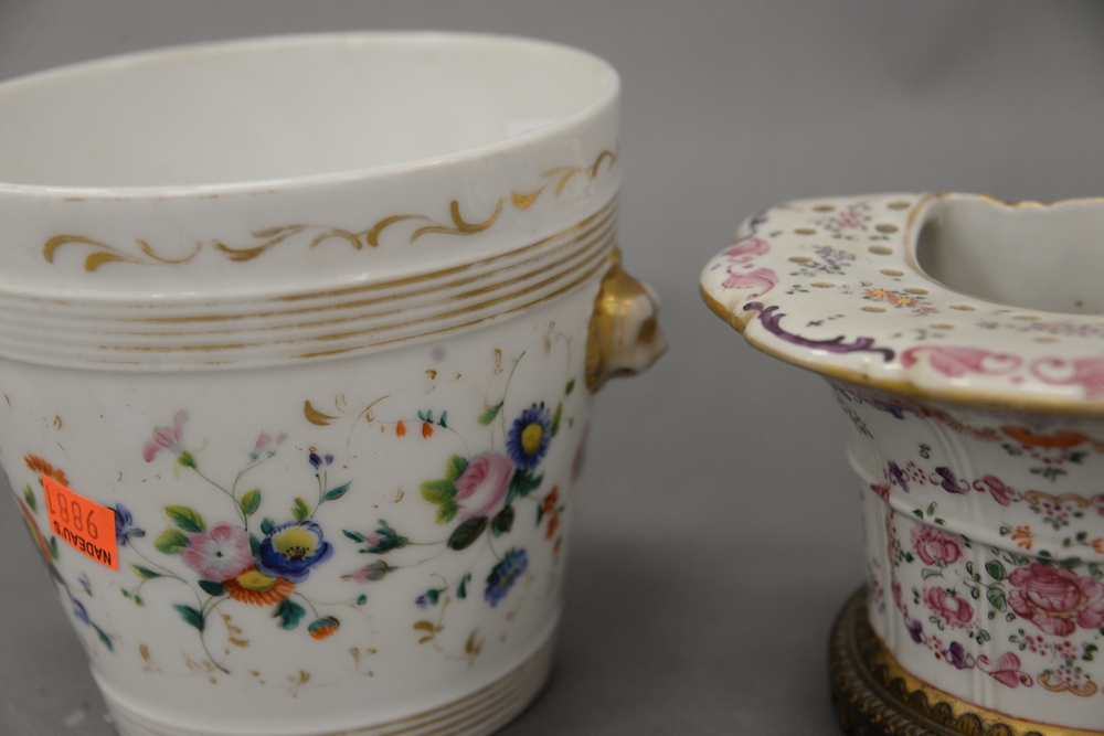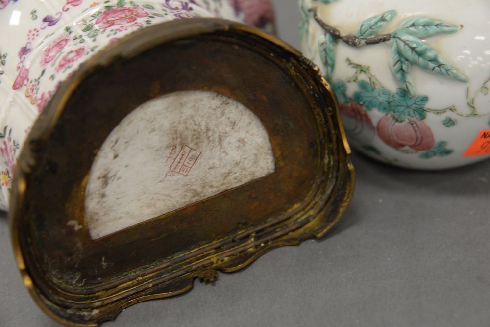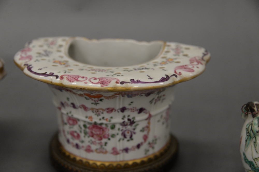 Four piece porcelain lot to include a pair of floral cache pots having mounted lion form handles; a Chinese export teapot, marked to the underside; along with a small planter in gilt brass base.