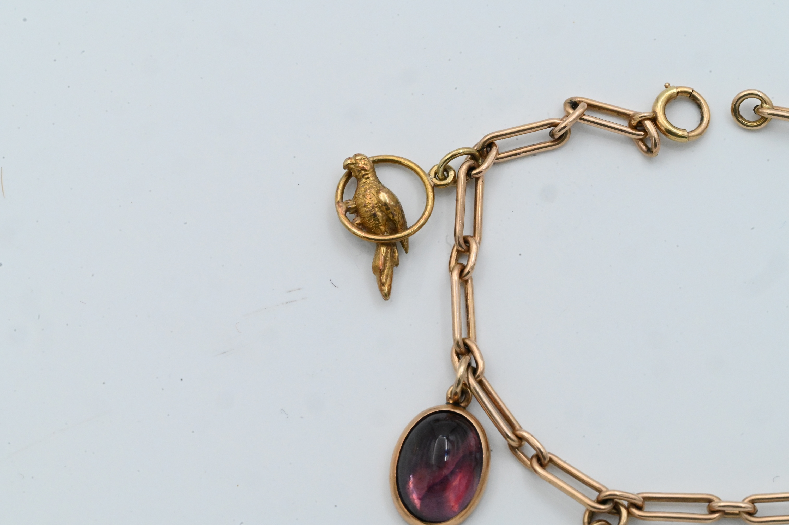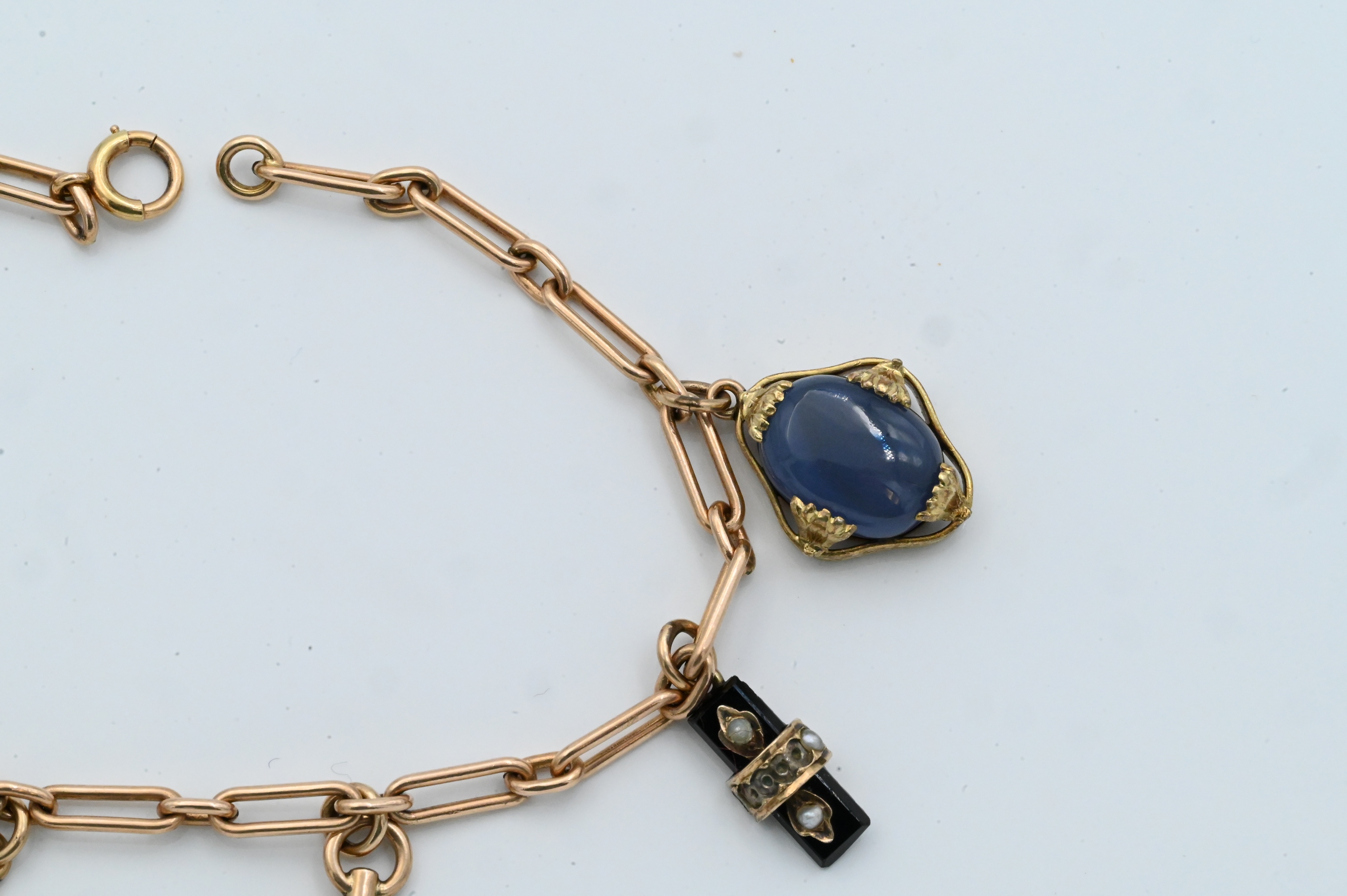 having six charms to include one of bird, two cabochon cut stones, and one with black onyx, two charms marked 14K