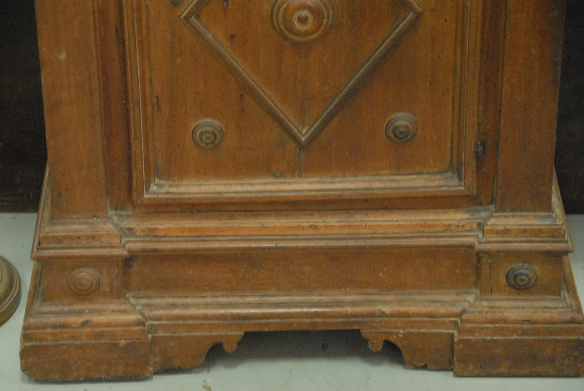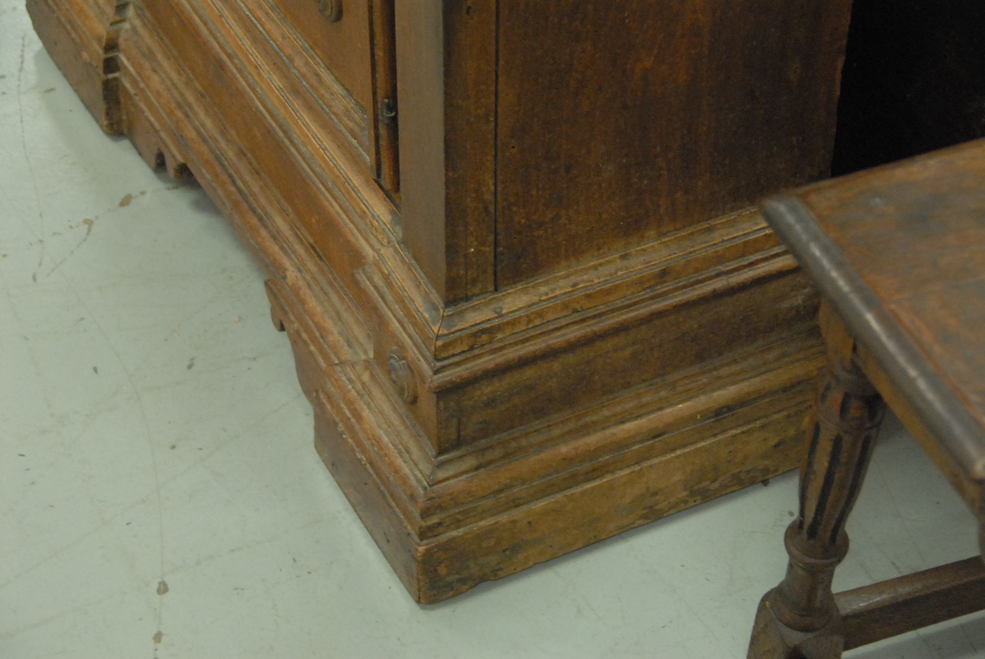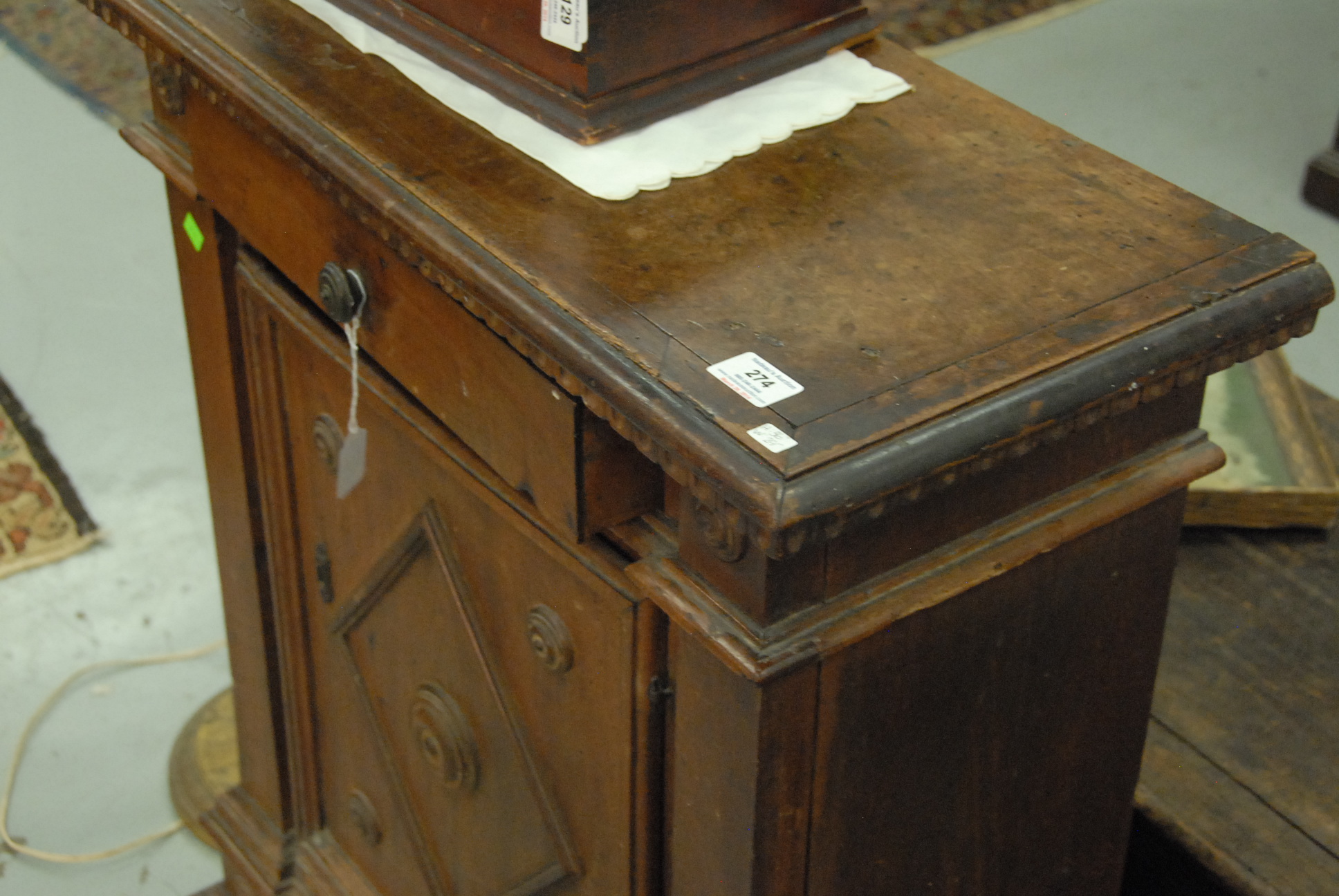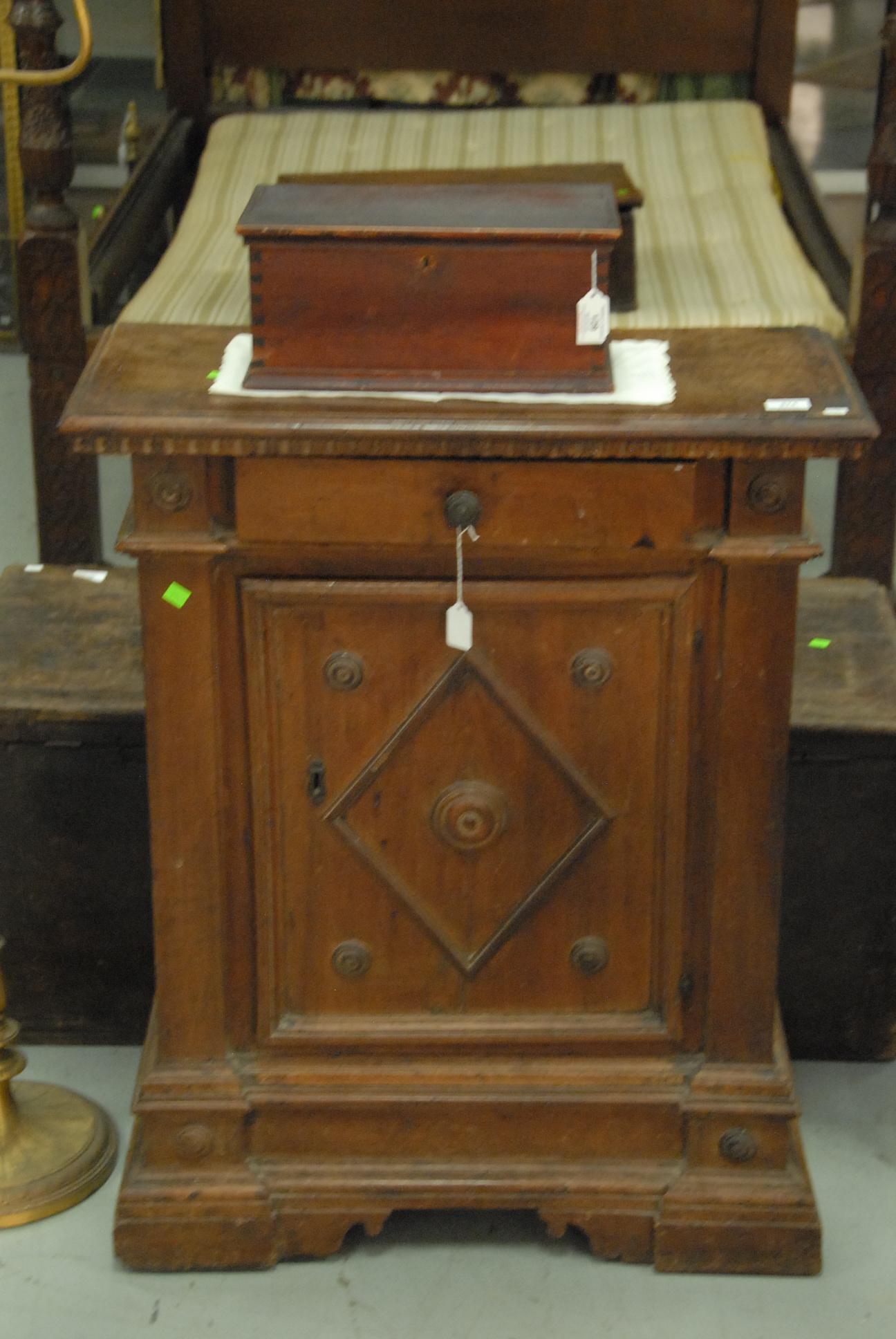 Lot 274: Continental walnut side cabinet, probably Italian, one drawer over one door on bracket base with restoration, 18th century. ht. 36in. wd. 28in.