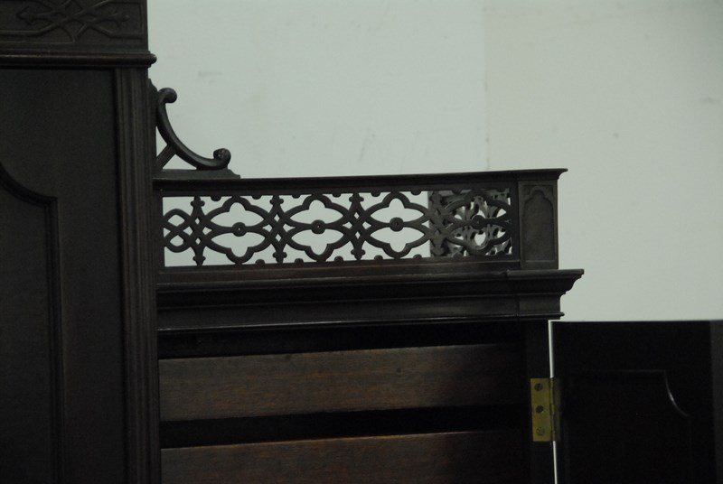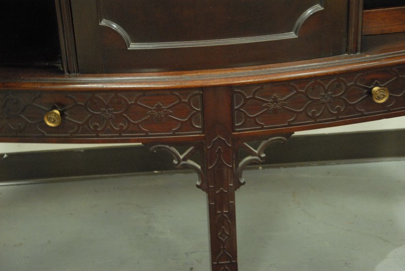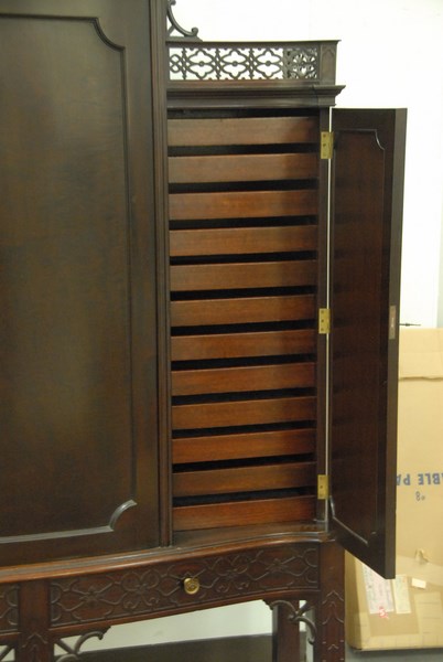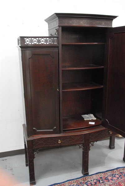 Lot 274: Custom mahogany cabinet having fretwork top, three doors concave and convex on conforming base, Chinese Chippendale style with two drawers on squared legs, one side door opens to reveal eleven fitted and lined drawers. ht. 75 1/2in. wd. 54in.