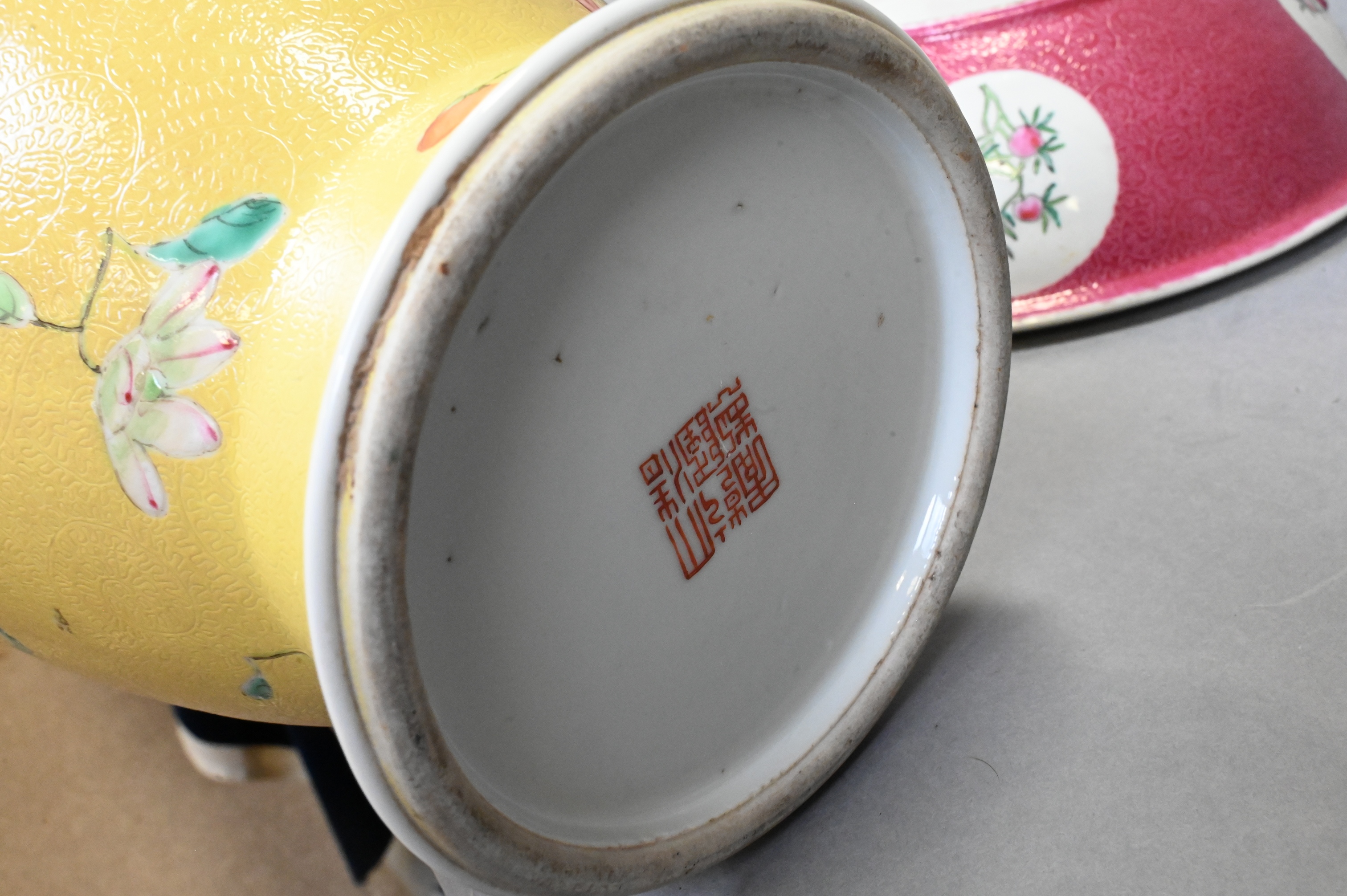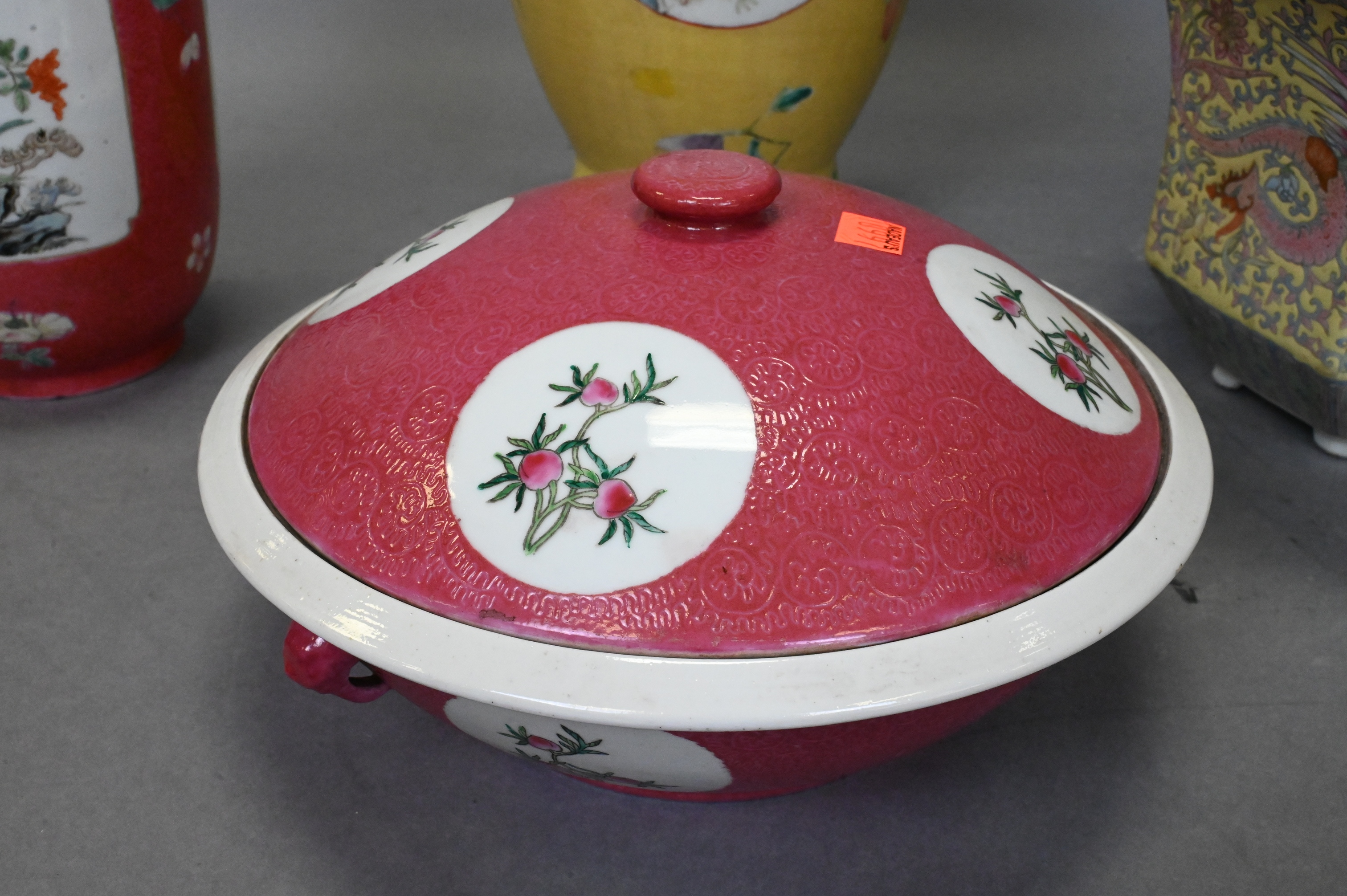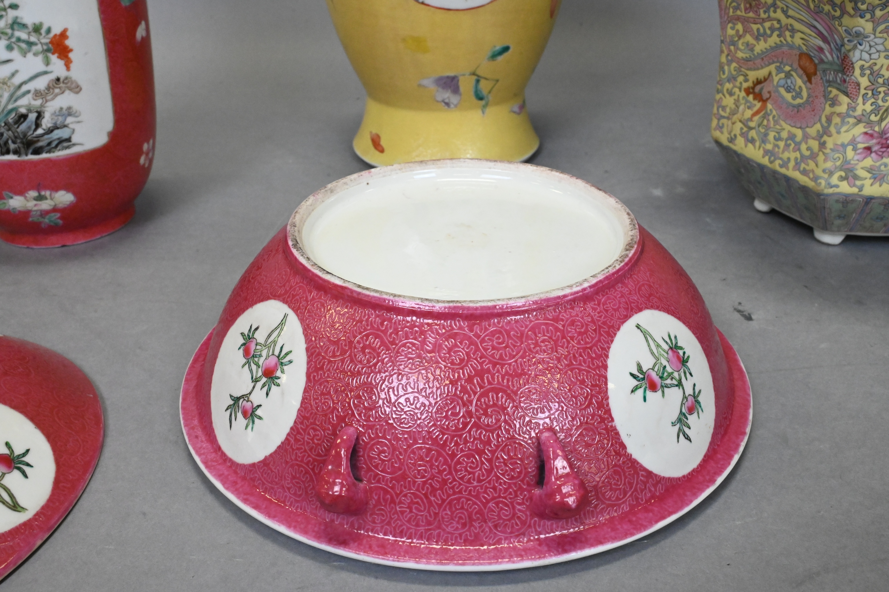 Republic style yellow ground famille jaune vase with cartouches depicting flowers, one incised famille rose vase and one covered tureen along with hexagonal yellow ground jardiniere having bird of paradise amongst scrolling vine motif