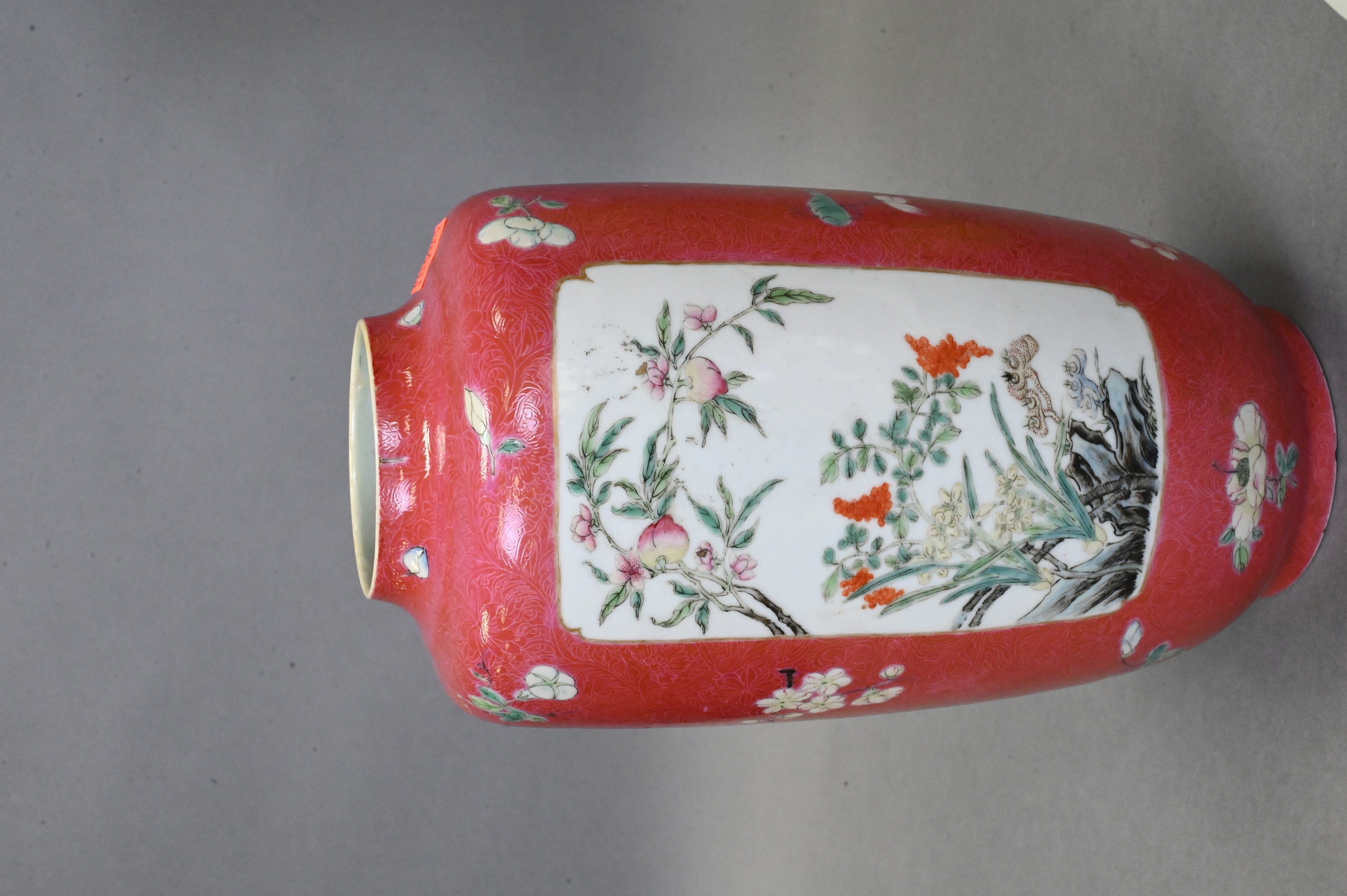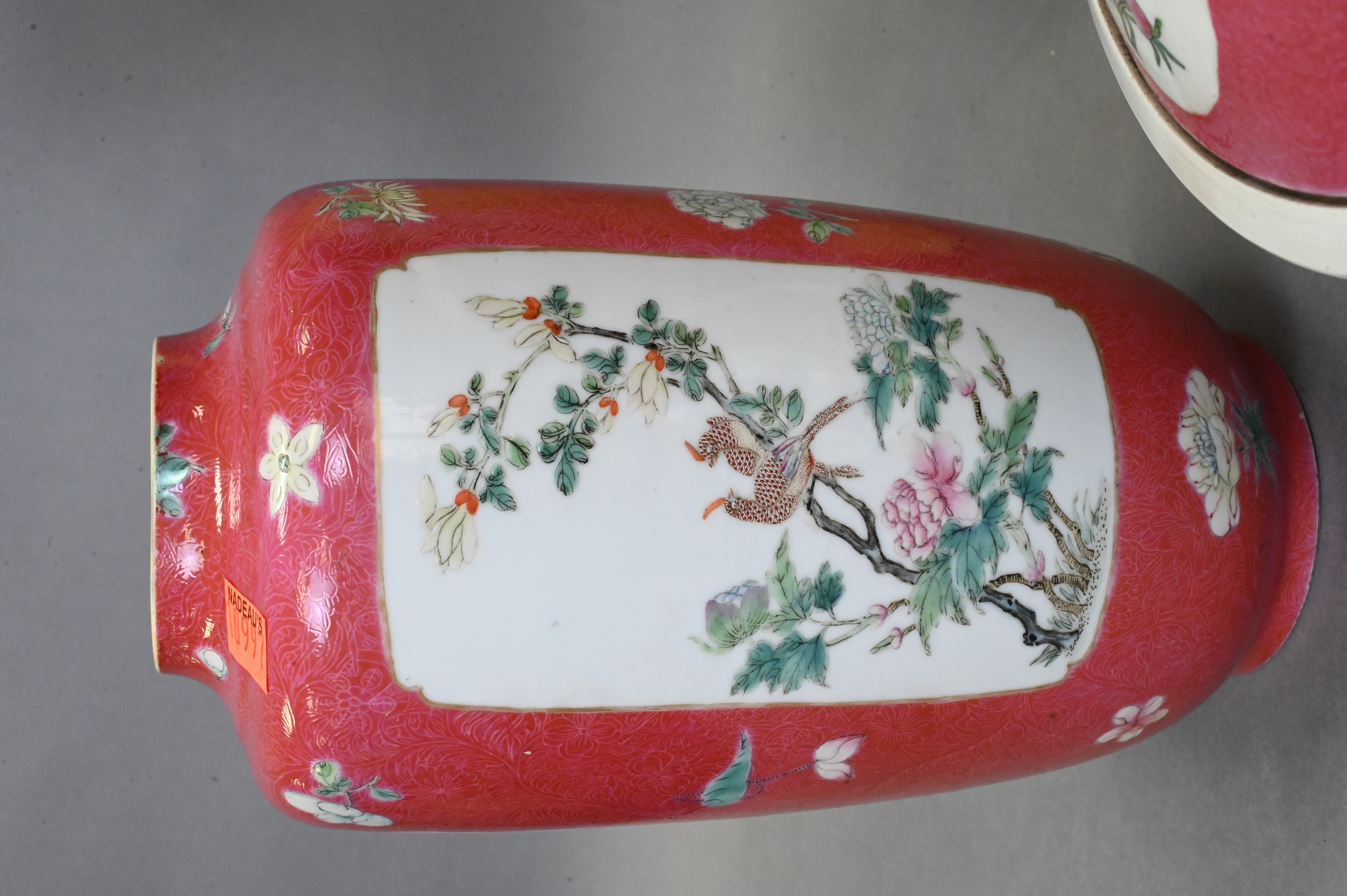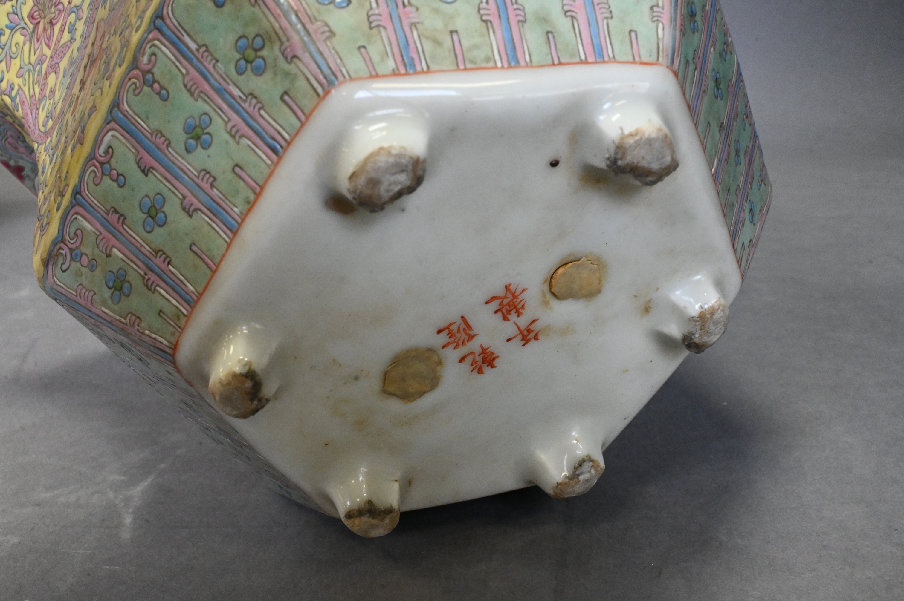 Republic style yellow ground famille jaune vase with cartouches depicting flowers, one incised famille rose vase and one covered tureen along with hexagonal yellow ground jardiniere having bird of paradise amongst scrolling vine motif