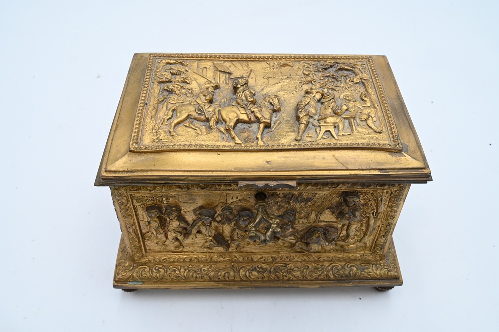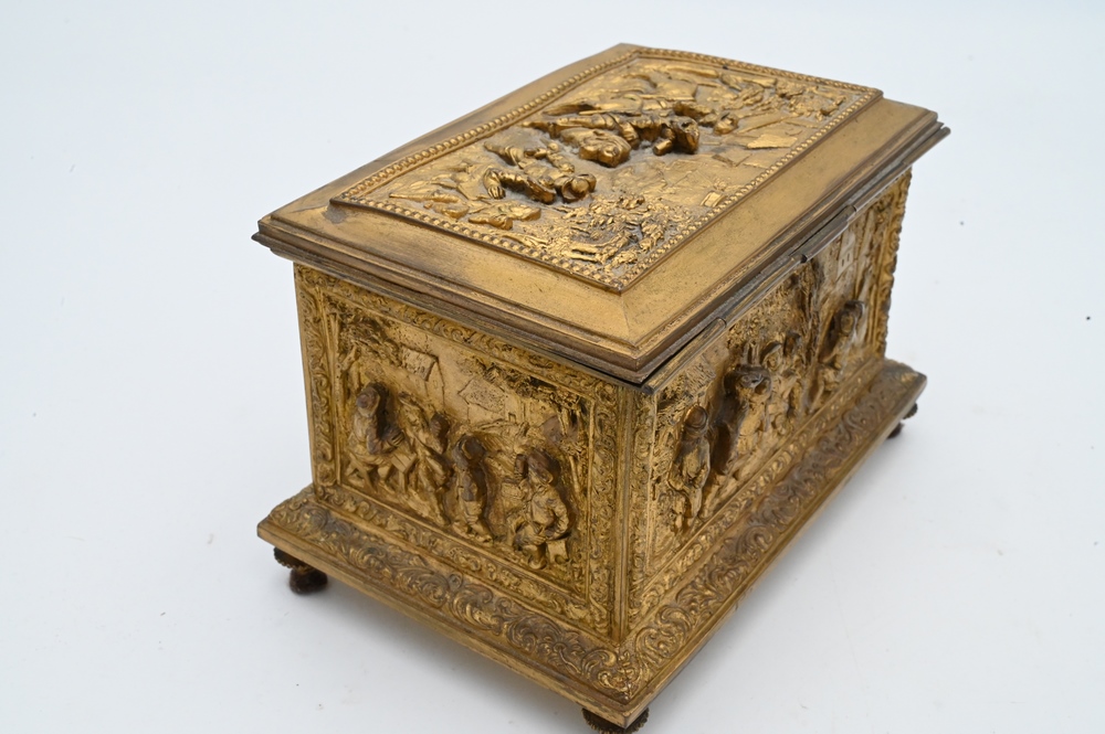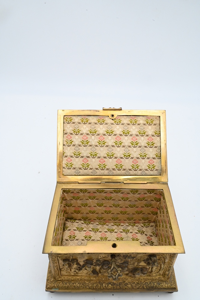 Lot 274: French Gilt Bronze Jewelry Box, having panels depicting figures dancing and eating, marked France, height 3 3/4 inches, top 3 3/4 x 5 1/2 inches.