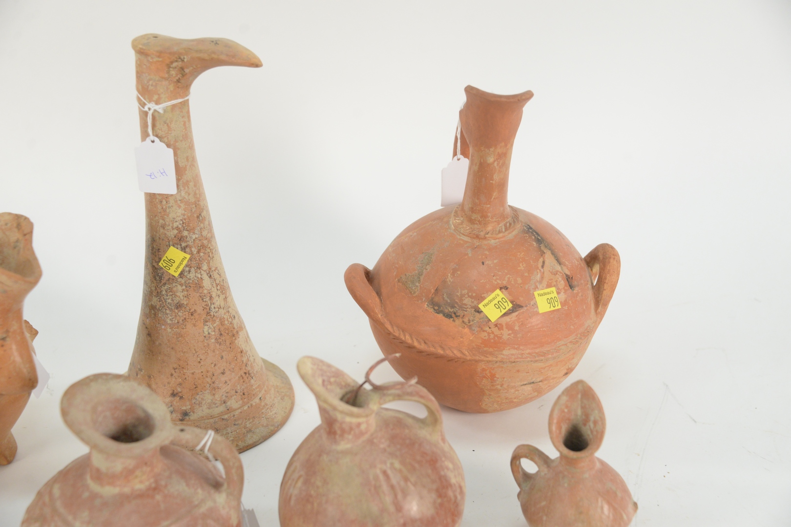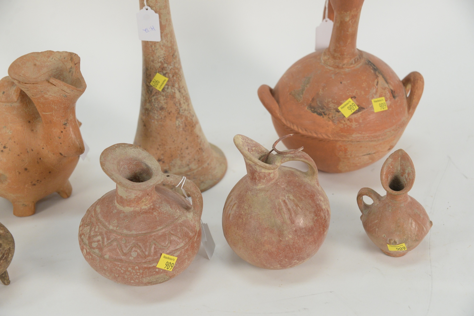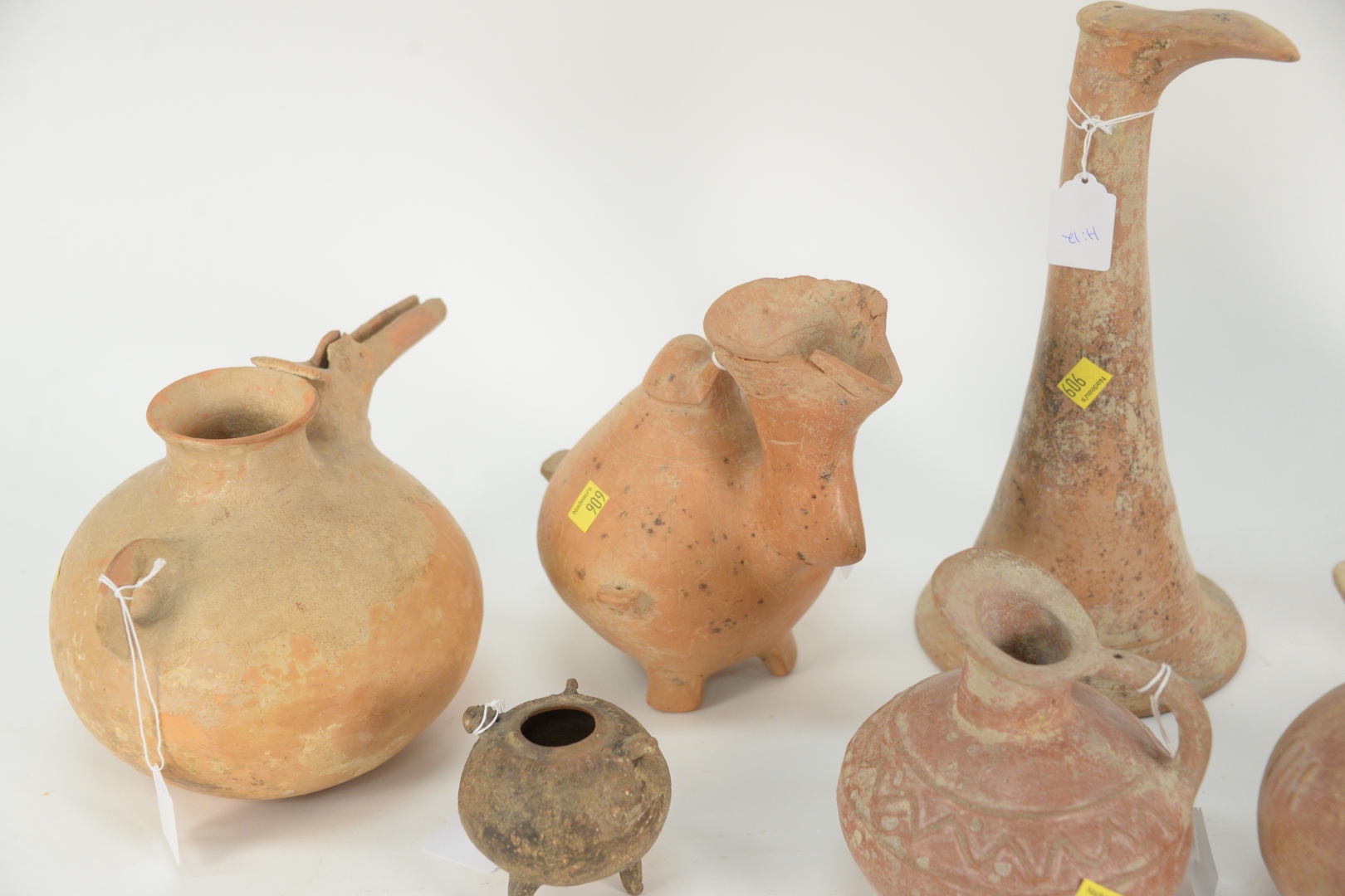 Lot 274: Group of Eight Terracotta Pottery Vessels, to include trumpet form base in form of foot, clear glazed with incised, geometric design and animal head spout a round bottle form with side spout three smaller vessels with flared spouts, heights 5 1/4 –